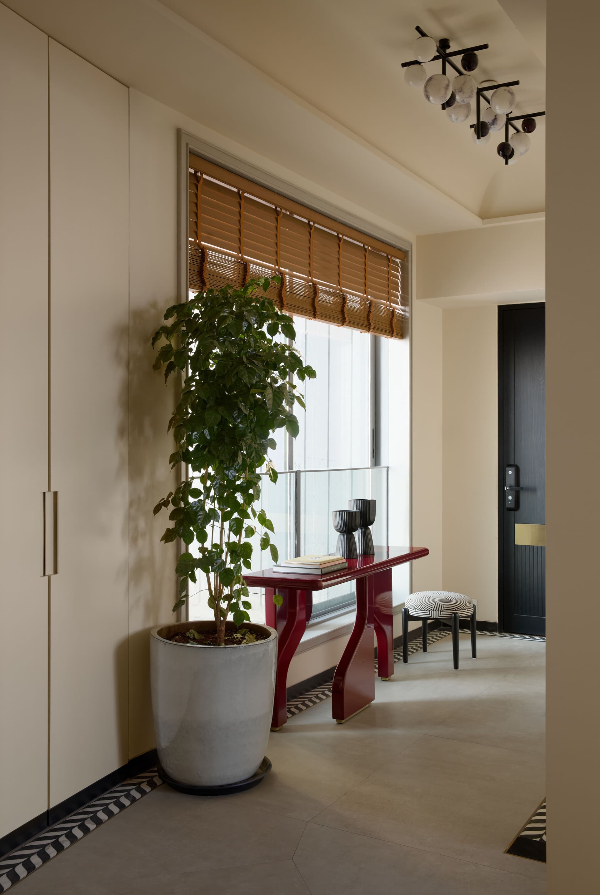 The entrance passage is a prelude to the home’s intuitive layout, flanked by a glass-enclosed kitchen on one side and a multifunctional study-guest room on the other. This flexible space accommodates a floor-to-ceiling storage unit, a sofa-cum-bed, and a recliner chair, catering to the homeowners’ work-from-home needs.