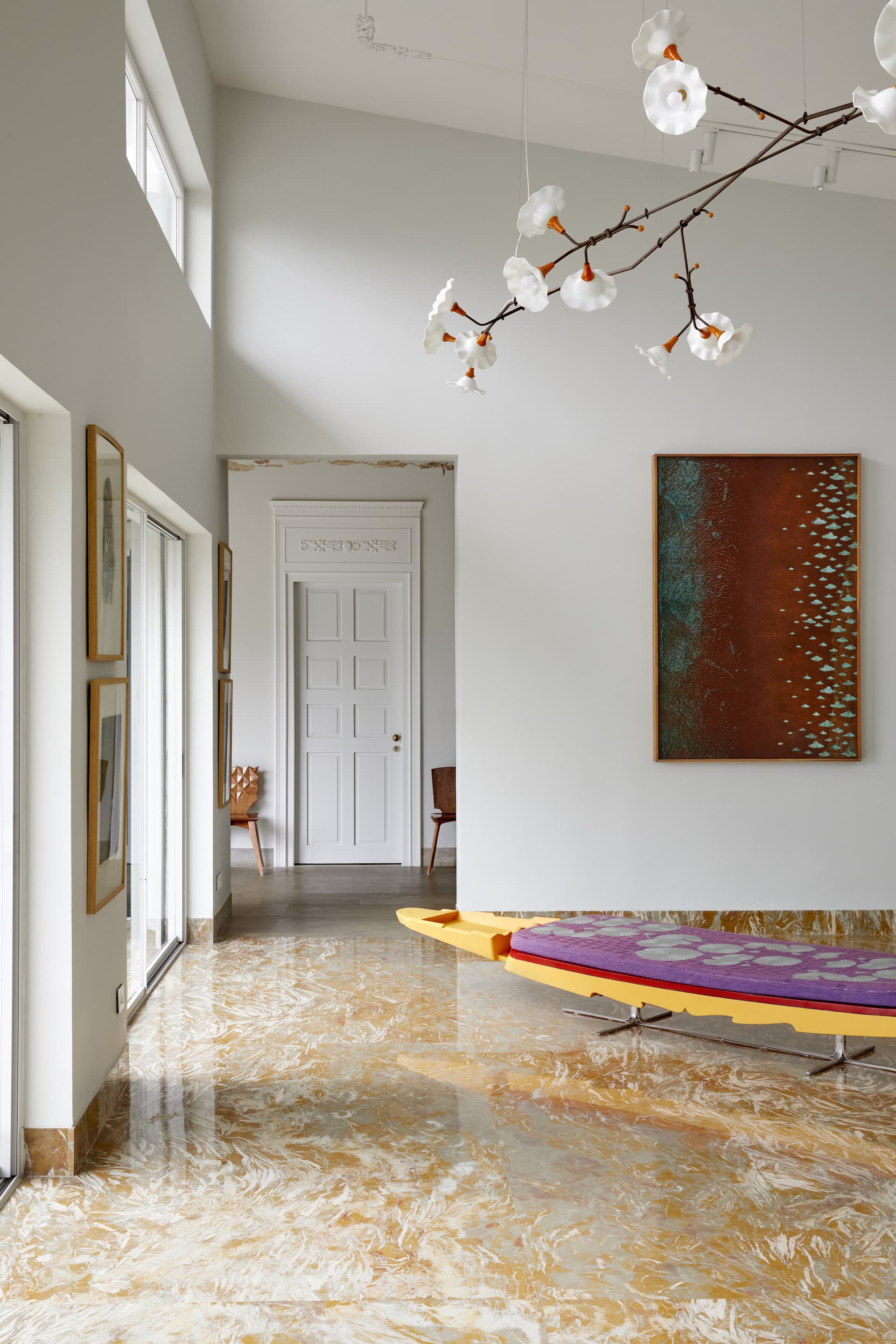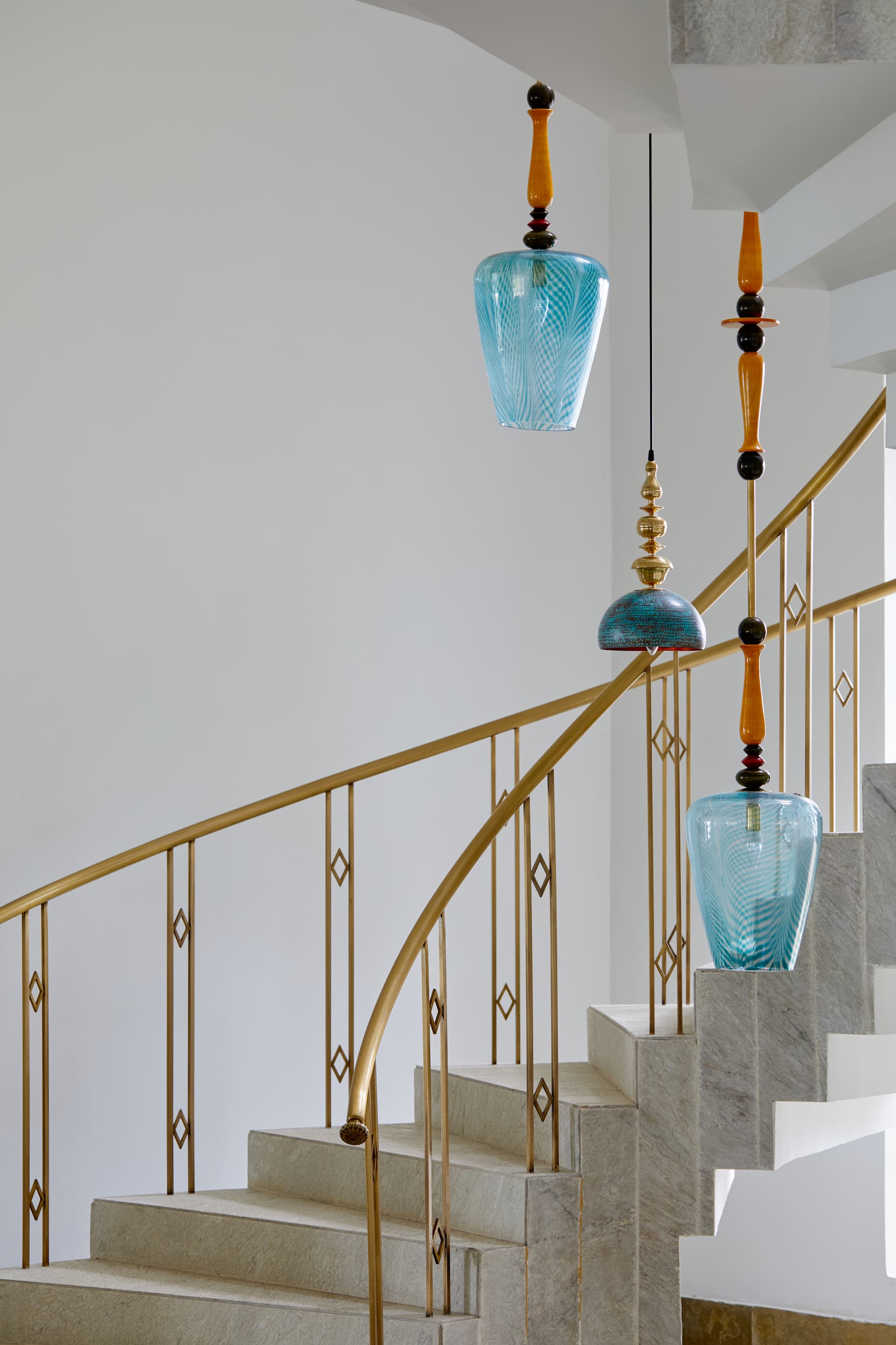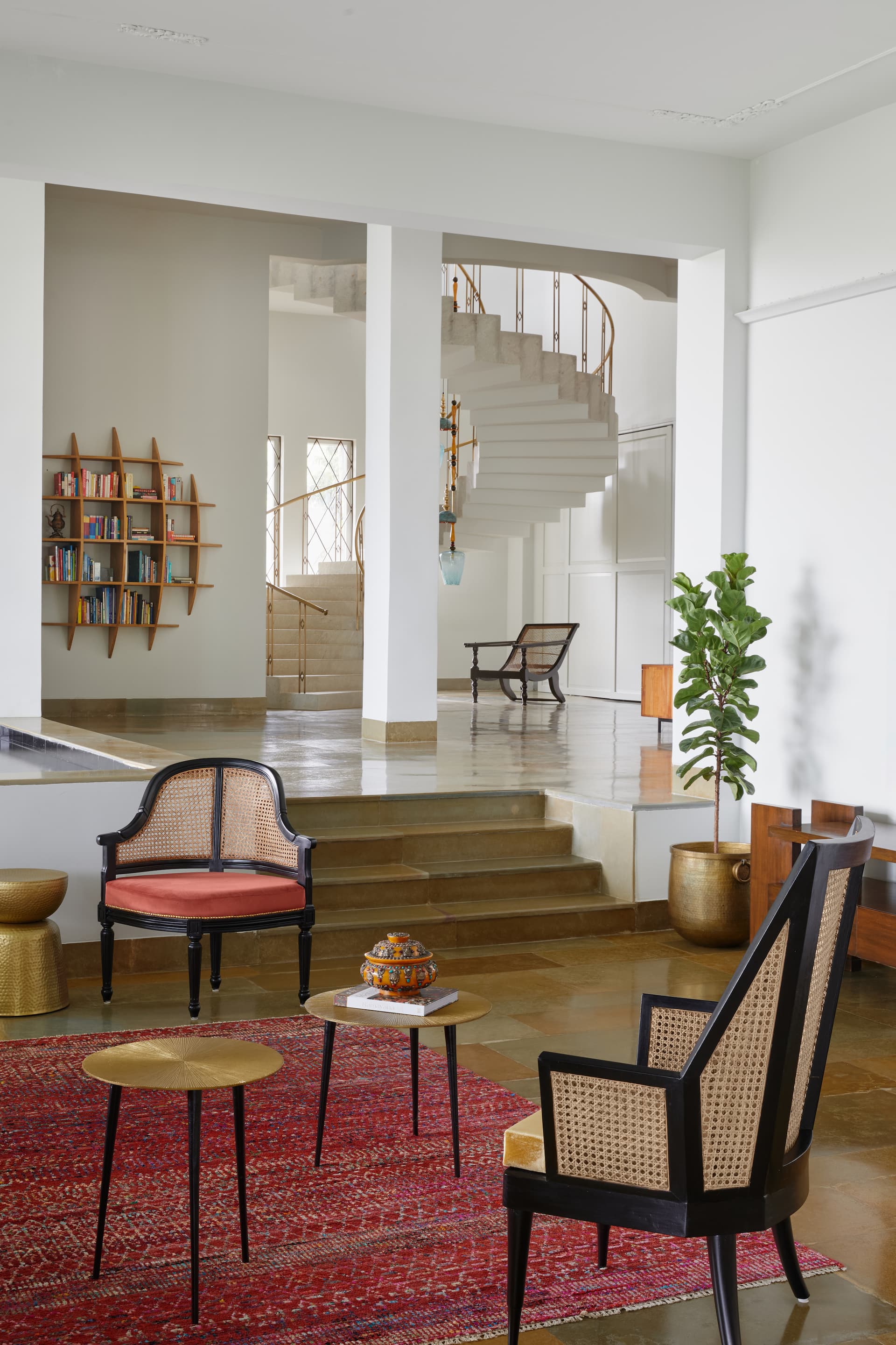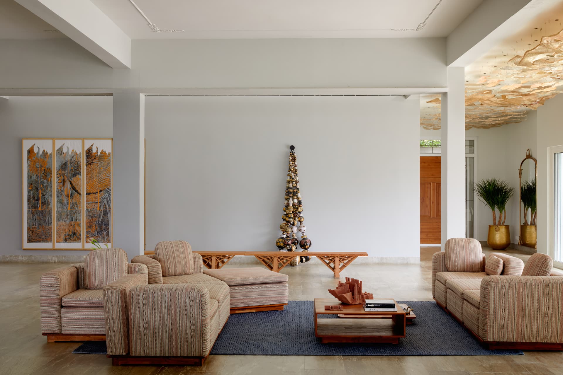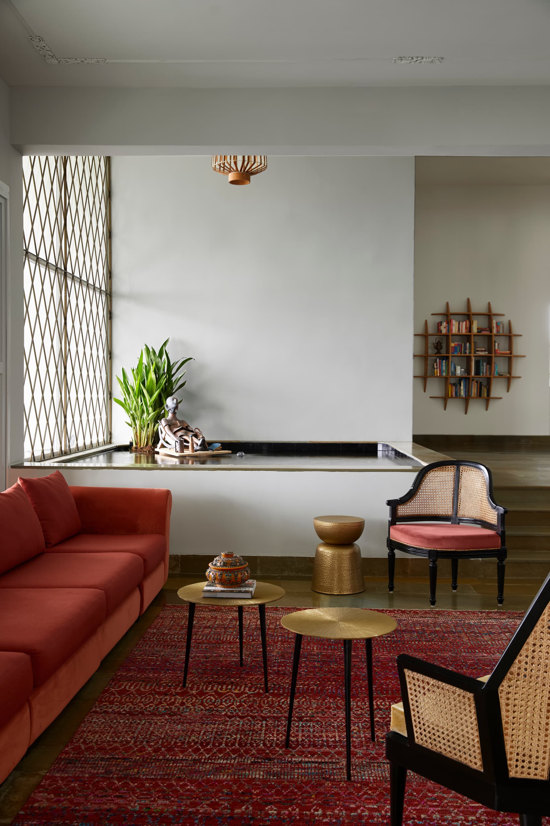 Lighting, both functional and decorative, plays a pivotal role in sculpting the home’s mood. Arjun Rathi, known for his innovative approach to lighting design, introduced three bespoke pieces that imbue the residence with an artful luminosity. His double-height Channapatna-inspired installation, a cascade of antique brass elements, graces the staircase, orchestrating a dramatic interplay of light and shadow. By day, the home is bathed in diffused sunlight through expansive floor-to-ceiling windows, while by night, strategically placed lighting compositions heighten its sculptural qualities.