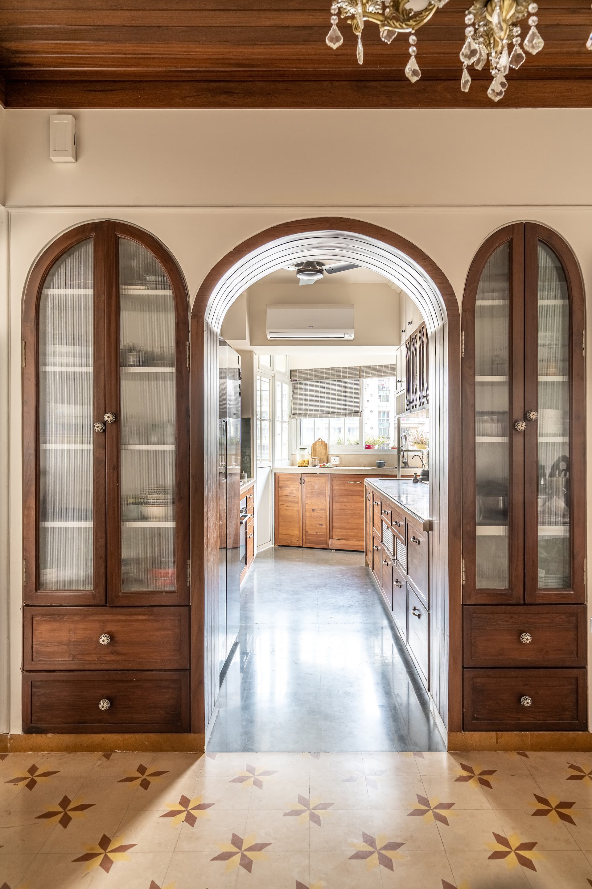 As you progress through this residence, culinary enthusiasts will discover a kitchen that is nothing short of a culinary haven. Its inviting charm is immediately apparent, with an arched entrance that beckons you inside. The kitchen’s design is a nod to colonial aesthetics, with wooden arched cabinets that exude both a sense of history and modern appeal. The cabinets themselves are a masterpiece, artfully blending wood and rattan cane, showcasing a fusion of styles that marries functionality with timeless elegance. The stylish wooden and rattan cane cabinets not only provide ample storage but also serve as a visual centerpiece, adding depth and character to the space.