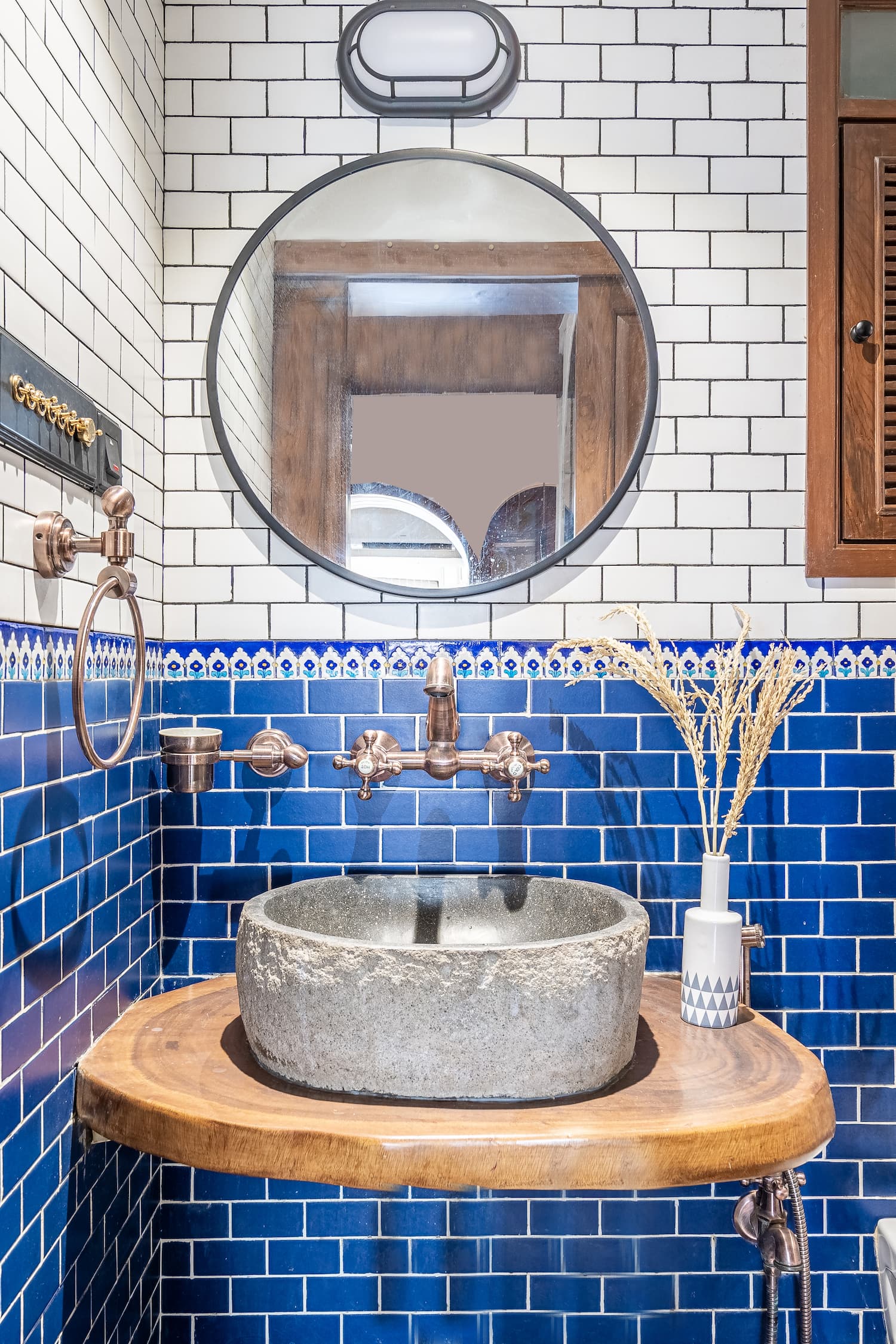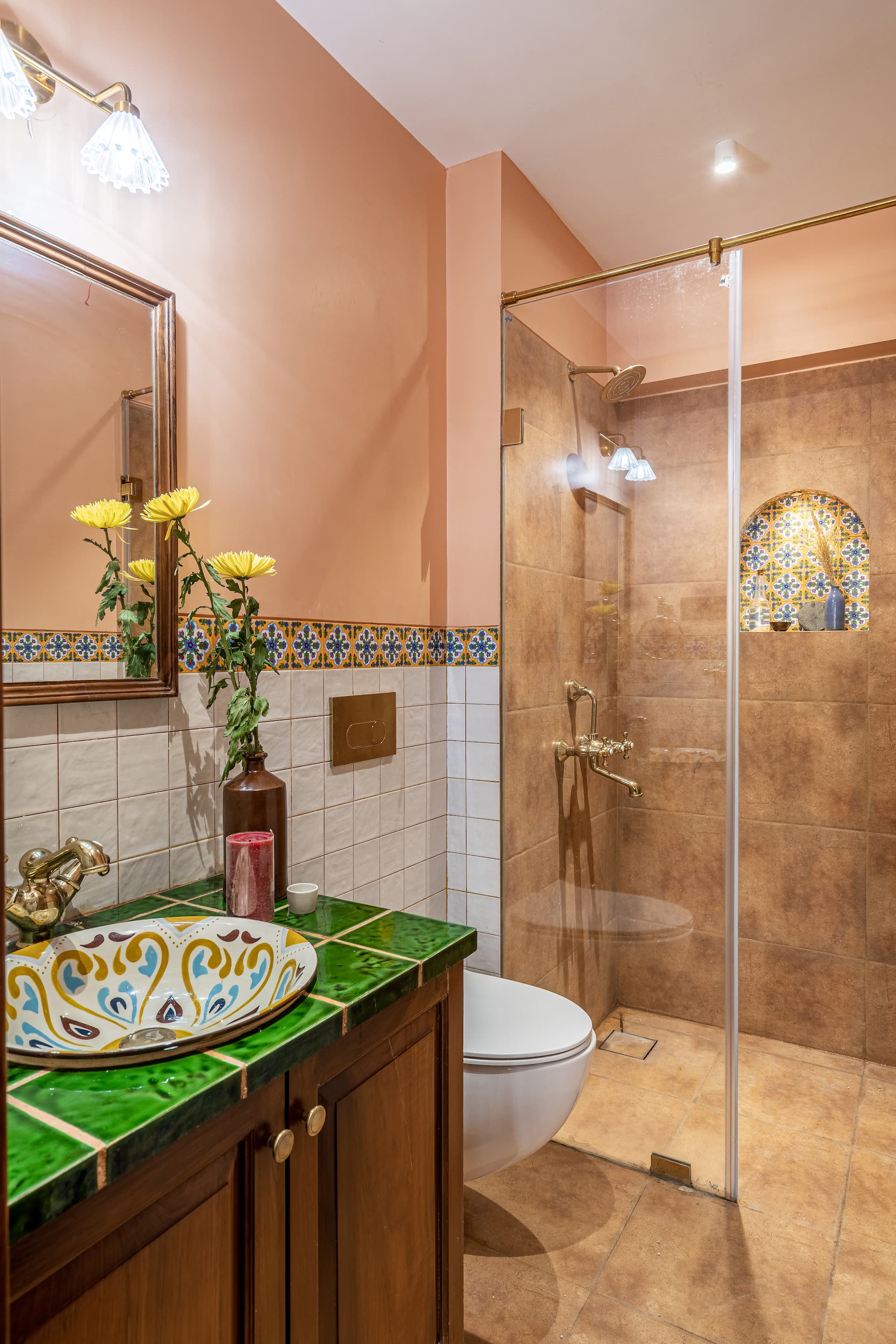 The master toilet is thoughtful design, with its carefully chosen soothing shades of green that create a palpable sense of nature and freshness. Natural light is harnessed to perfection in this space, thanks to clerestory windows that generously welcome the sun’s gentle rays. The aesthetic is further enhanced by brick pattern tiles, which not only add visual intrigue but also work in harmony with the windows to create a sense of opulence and rejuvenation.