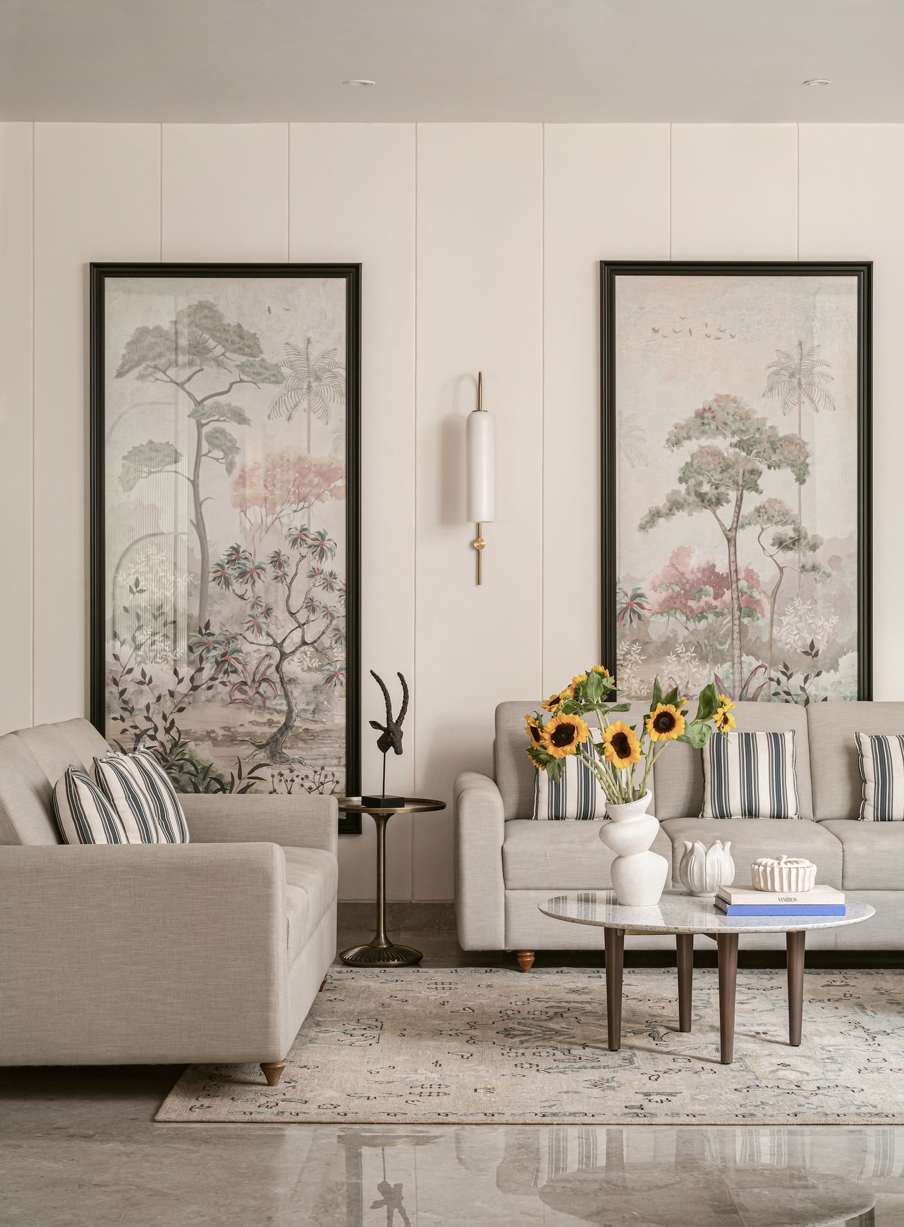 In the living room, oversized framed artwork adds a subtle yet impactful touch of color, while maintaining the refined tone of the space. Anchored by a sleek, modern sofa in a light fabric, the seating arrangement exudes comfort and style. Flanking the sofa are a pair of sculptural side chairs that introduce texture and visual intrigue, while a statement stone coffee table, inspired by Kelly Wearstler’s iconic designs, serves as the room’s focal point. “The moment I discovered this piece, I knew it was the perfect ‘it’ piece for the space,” Sandhu shares, highlighting the table’s ability to spark conversation.