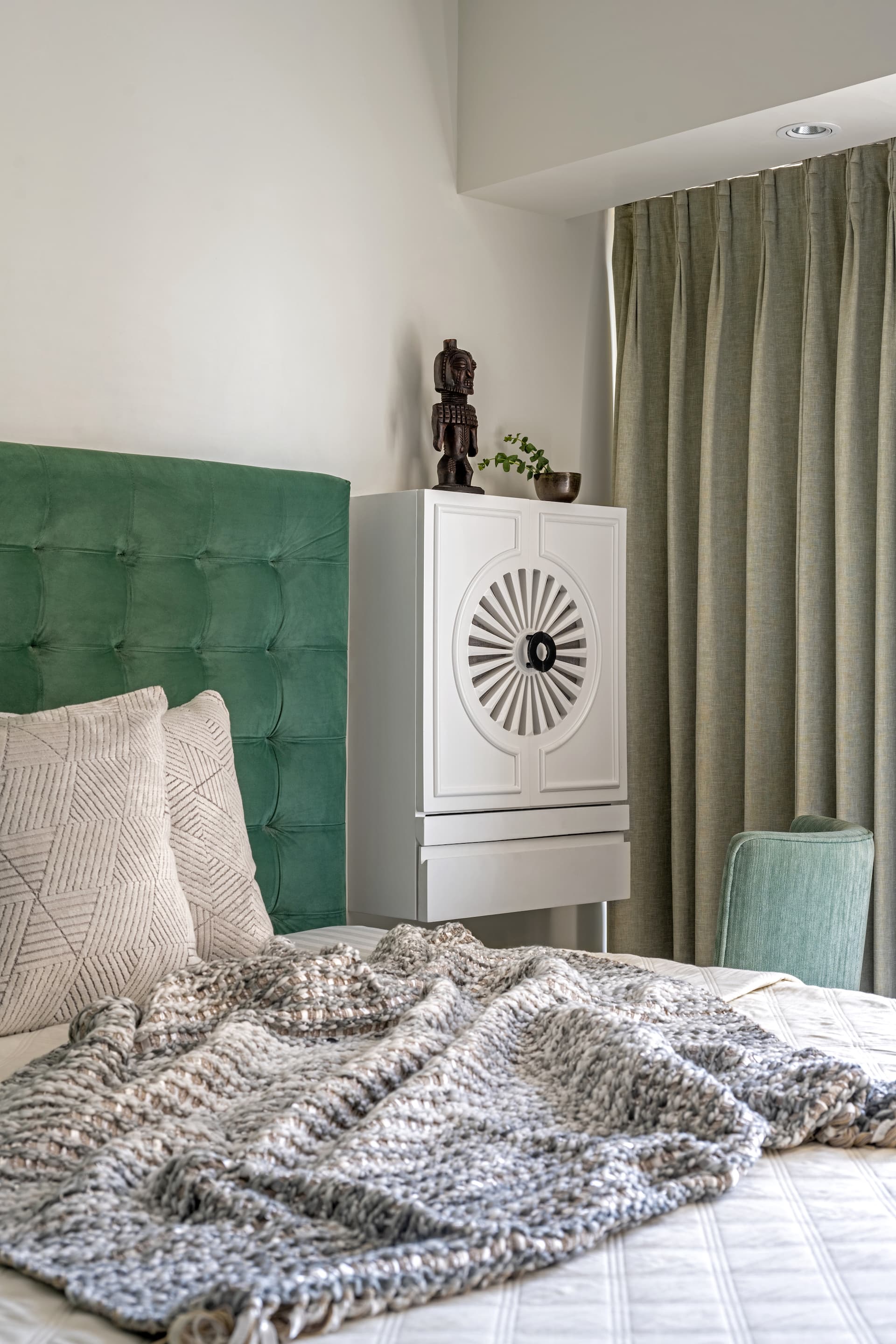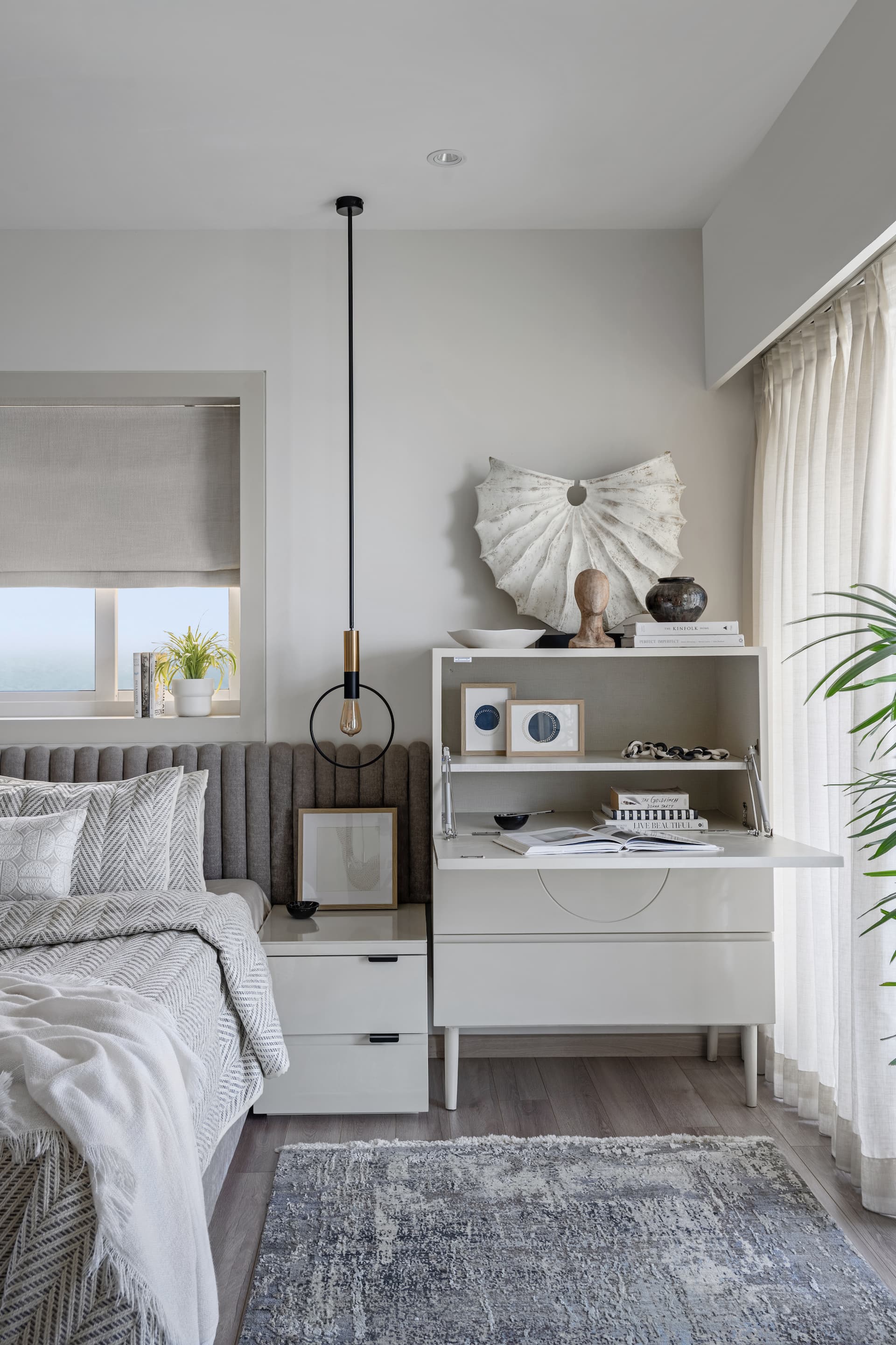 The master bedroom epitomises refined simplicity. Fluted wall paneling conceals the bathroom door, maintaining the room’s seamless flow and visual serenity. Here, a luxurious bed, paired with a minimalist dresser, anchors the space, creating a retreat that is as calming as it is elegant. Textures and prints—carefully curated in muted greys and pastels—add a tactile richness, ensuring the room remains both inviting and visually engaging.