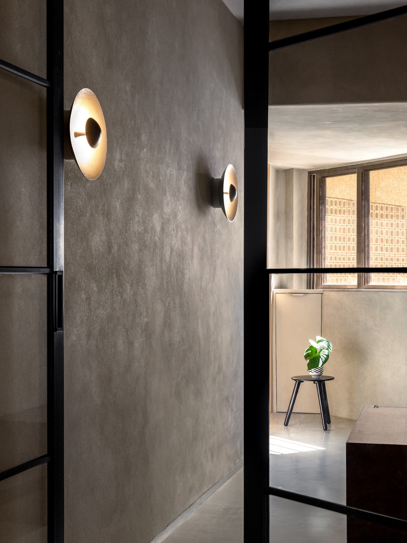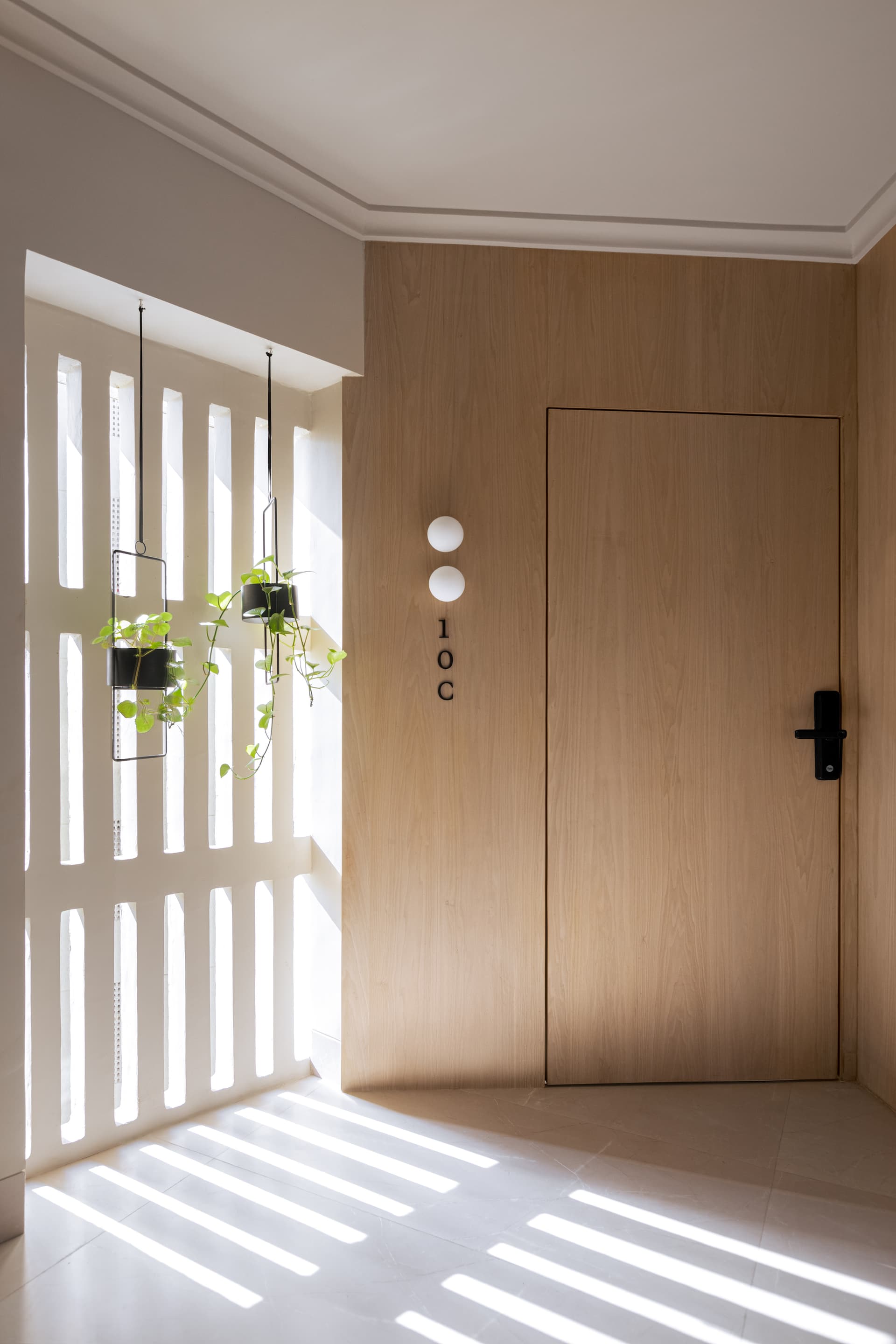 The entrance of Aether Shore sets the tone for the entire home. The welcoming aura begins with a thoughtfully designed entrance door, complemented by the wall beside it, which features an elegant opening pattern. This design allows sun rays to filter gently into the space, creating a warm and inviting atmosphere as soon as one steps inside. This subtle touch brings a sense of calm and homeliness that enhances the experience of moving further into the apartment.
