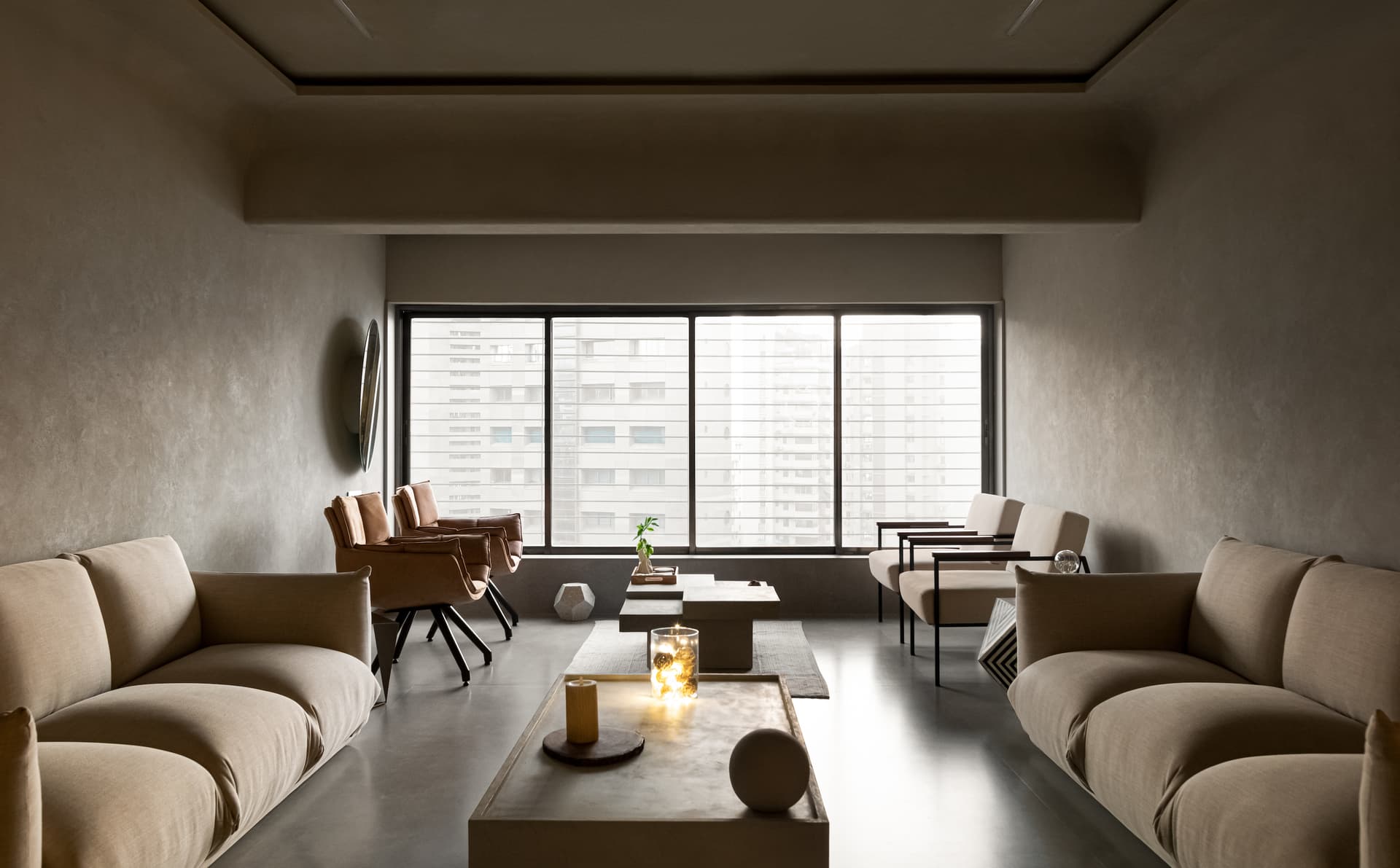 The living room of Aether Shore is where the essence of the design philosophy truly comes alive. This space is not merely a room—it is an experience that dances with the infinite horizon of the Arabian Sea. The design team’s vision was clear: to create a space where guests could not only admire the views but feel as though they were part of them. This was achieved through the ingenious use of a frameless mirror, strategically positioned to capture and reflect the sea’s ever-changing beauty. The minimalist furniture, carefully selected for its sleek lines and unobtrusive presence, complements this sense of openness, allowing the sea views to remain the focal point. The choice of a mono-colour palette, dominated by light grey tones, enhances this effect, making the room feel airy and expansive. Yet, the introduction of warm wooden textures prevents the space from feeling cold, adding a layer of cosiness that invites relaxation.
