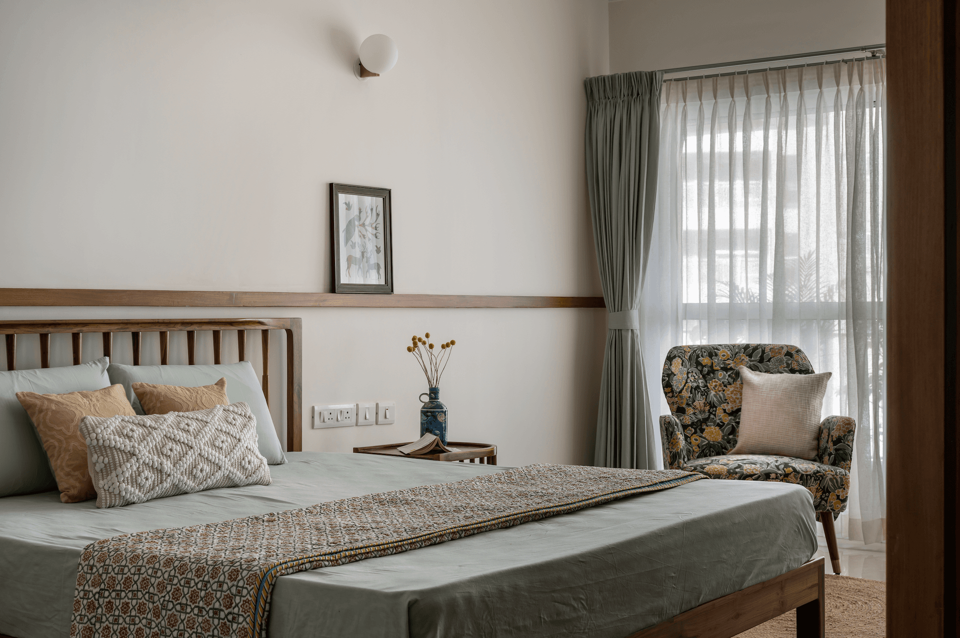 The master bedroom continues the warm and earthy language of the bedrooms with specially curated natural teak finish furniture. There was enough space for a wholesome walk-in wardrobe zone, but the design team continued with the open and airy brief, and the wardrobe area is only partitioned mildly with wooden slats instead of a hard wall or sliders