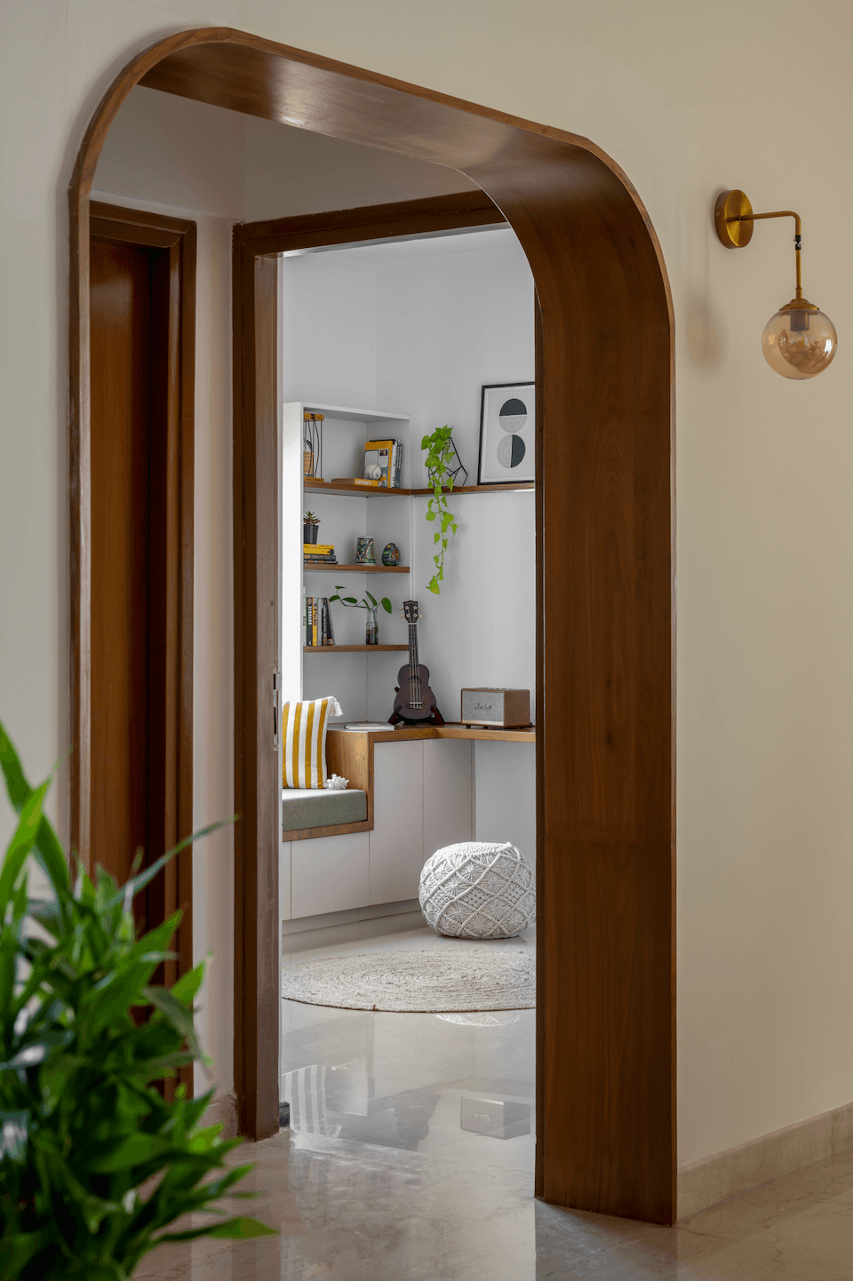 The home of a young couple is a reflection of their unbridled modern outlook and informal, easy-going warmth. The couple’s unique style leans towards a blend of contemporary and Indian-folksy aesthetics, which is reflected in every nook and space of their home. The design brief was for an open, airy, and warm home, and the design team delivered with a proposal of arches across all openings to accentuate the courtyard impression.