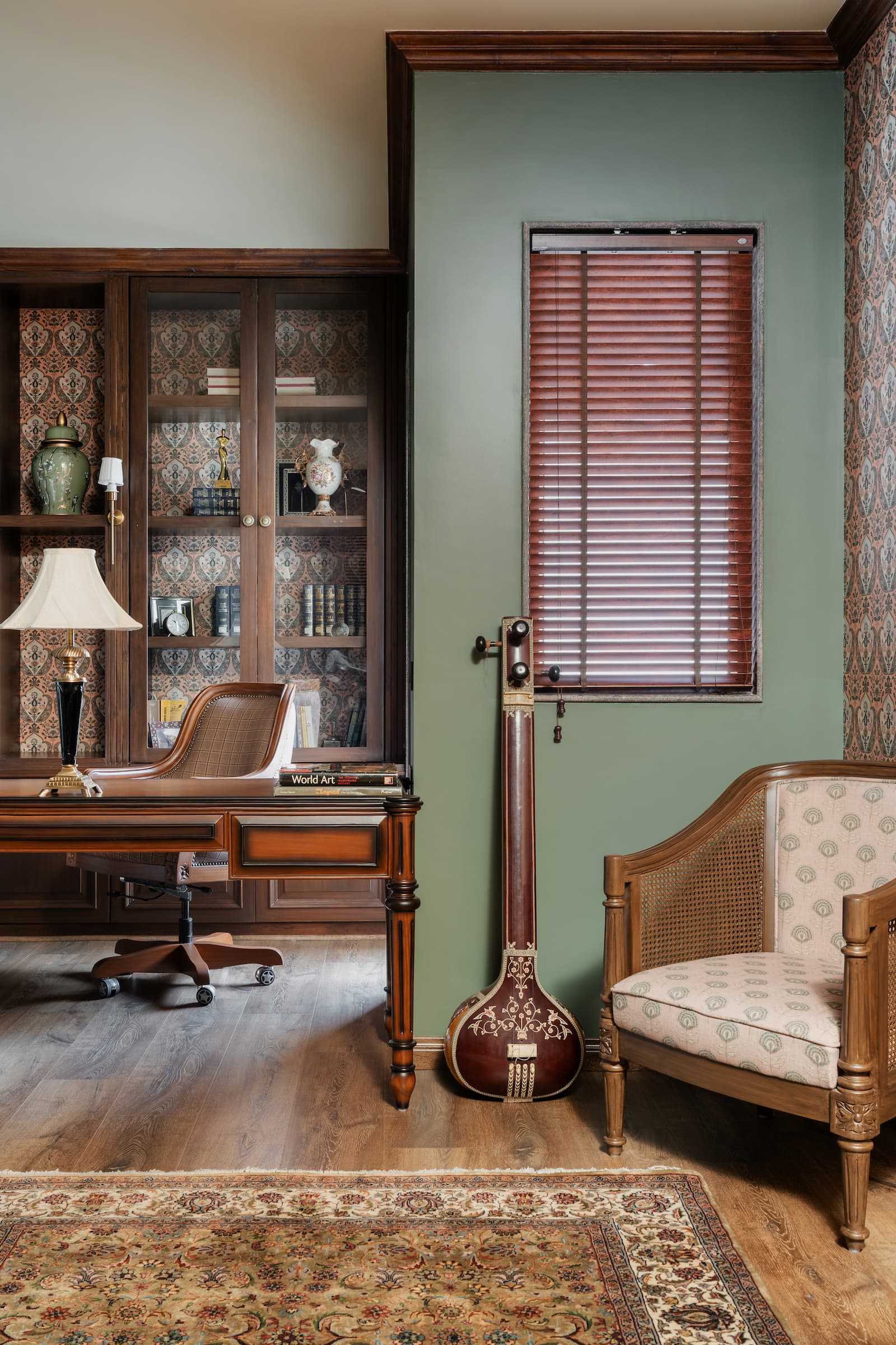 The introduction of rustic elements, collected from the family’s travels, adds a unique character to the Georgian theme, preventing it from feeling too flat in the Indian light. The drawing room, opening into an expansive study, is bathed in natural light, creating a dramatic and inviting effect. The study, furnished with dark teak and Stanley pieces, serves as a sophisticated workspace, rich with character and conducive to focus.