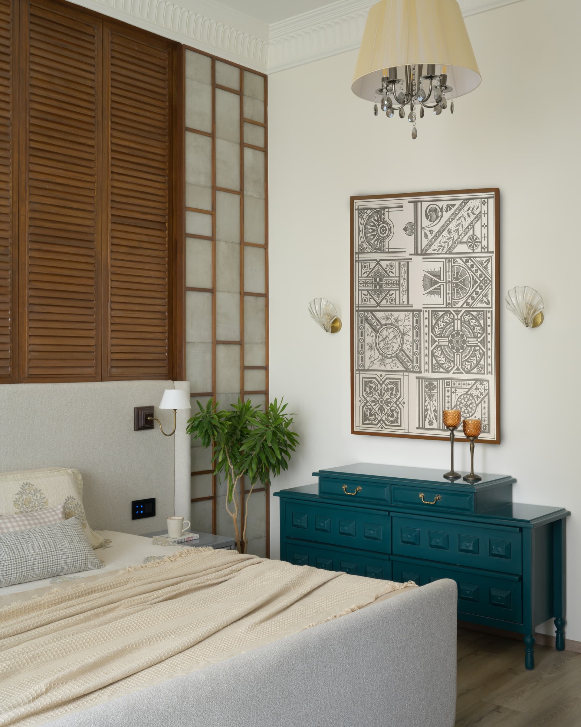 In the master suite, material interplay takes center stage. A wooden louvered panel serves as a warm backdrop to the bed, while the adjacent walls are clad in grey textured tiles, their cool tones balancing the warmth of the wood. Framing the tiles is a custom brick-pattern wooden strip, an architectural detail that draws the eye upward and plays with scale. Perimeter moulding adds a classical edge, softening the otherwise modern framework of the room. Beside the bed, a sleek chest of drawers and dresser unit stand out with their intricate geometric detailing, finished in soft PU paint. A gold-rimmed mirror completes the ensemble, amplifying light and lending a final touch of elegance.