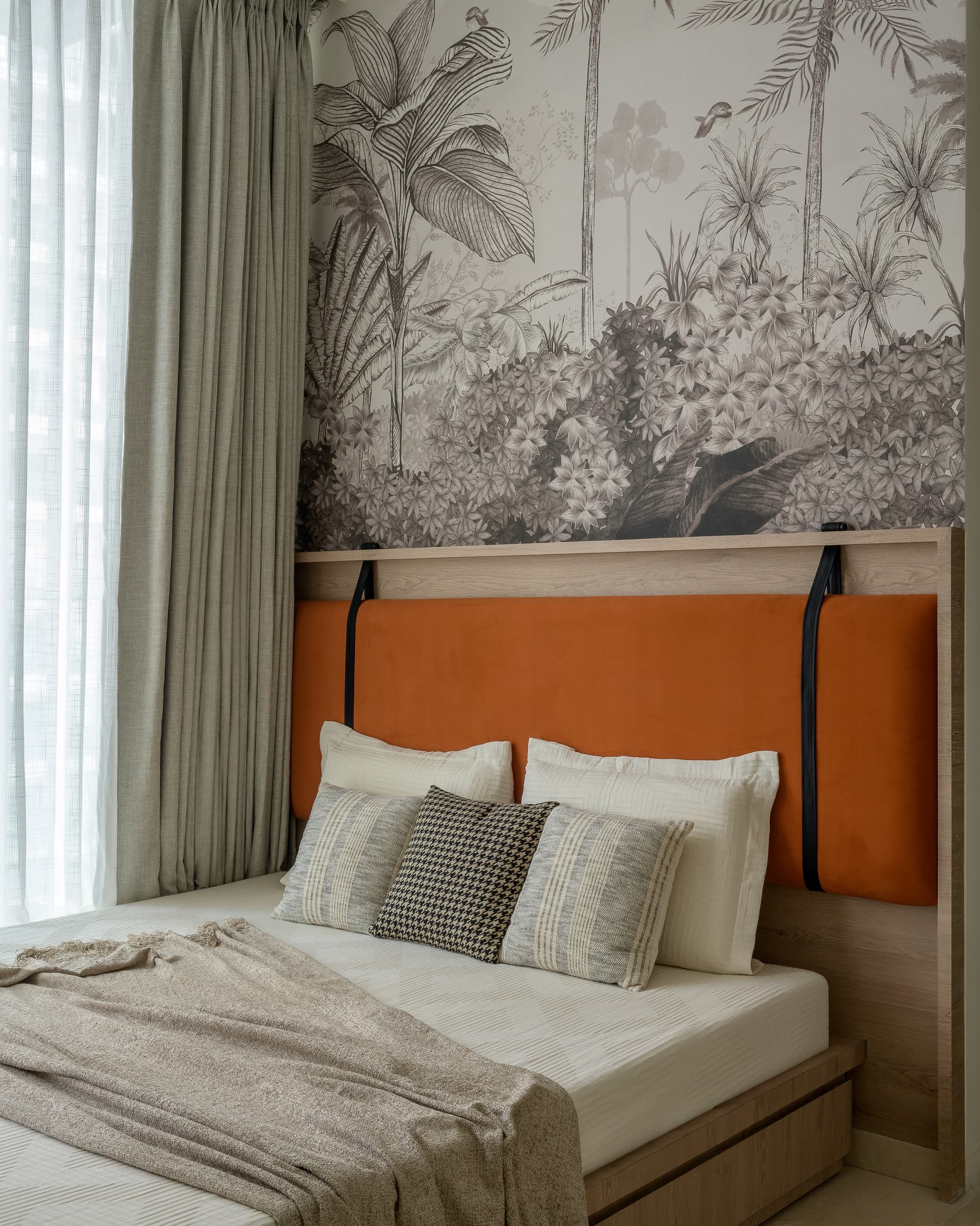 Infused with playful practicality, the children’s bedroom is designed to evolve with its young occupant. A corner platform bed optimises floor space, while a cozy seating nook with built-in toy storage encourages tidiness and imagination. A study desk finished in light blue laminate, paired with open shelving, creates a space for learning and creative expression. The room’s visual anchor is a custom tropical-themed wallpaper behind a suspended headboard in bold hues, adding vibrancy without visual chaos. The adjoining walk-in closet, featuring white laminate panels with fluted details, adds subtle texture while supporting the theme of functional sophistication.