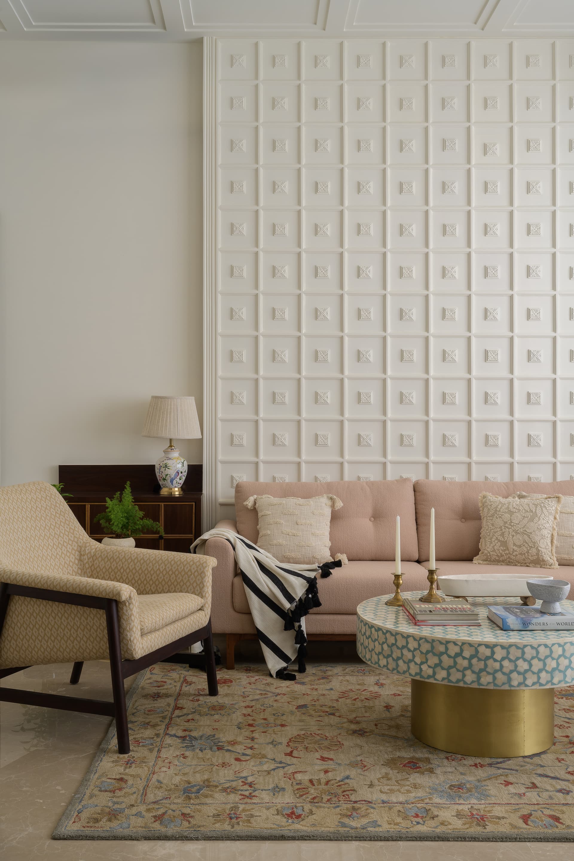 In most urban apartments, the entrance foyer is an afterthought, functional at best, forgettable at worst. But here, it becomes a celebration of scale and detail. With a soaring 11.5-foot ceiling, the entry passage instantly commands attention. Hand-printed geometric floor tiles framed by a delicate border lend artisanal charm, while above, wood-finished veneer rafters and a trio of pendant lights imbue the space with warmth and rhythm. One wall is thoughtfully treated with textured paint and decorative mouldings, accentuated by a classic console table and gold-accented wall sconces. A mosaic-bordered mirror enhances the depth and detail, while the other wall is kept seamless with PU-painted doors. At the end of the passage, a built-in bench with mirror paneling adds both character and clever concealed storage, an elegant prelude to the home’s layered design story.