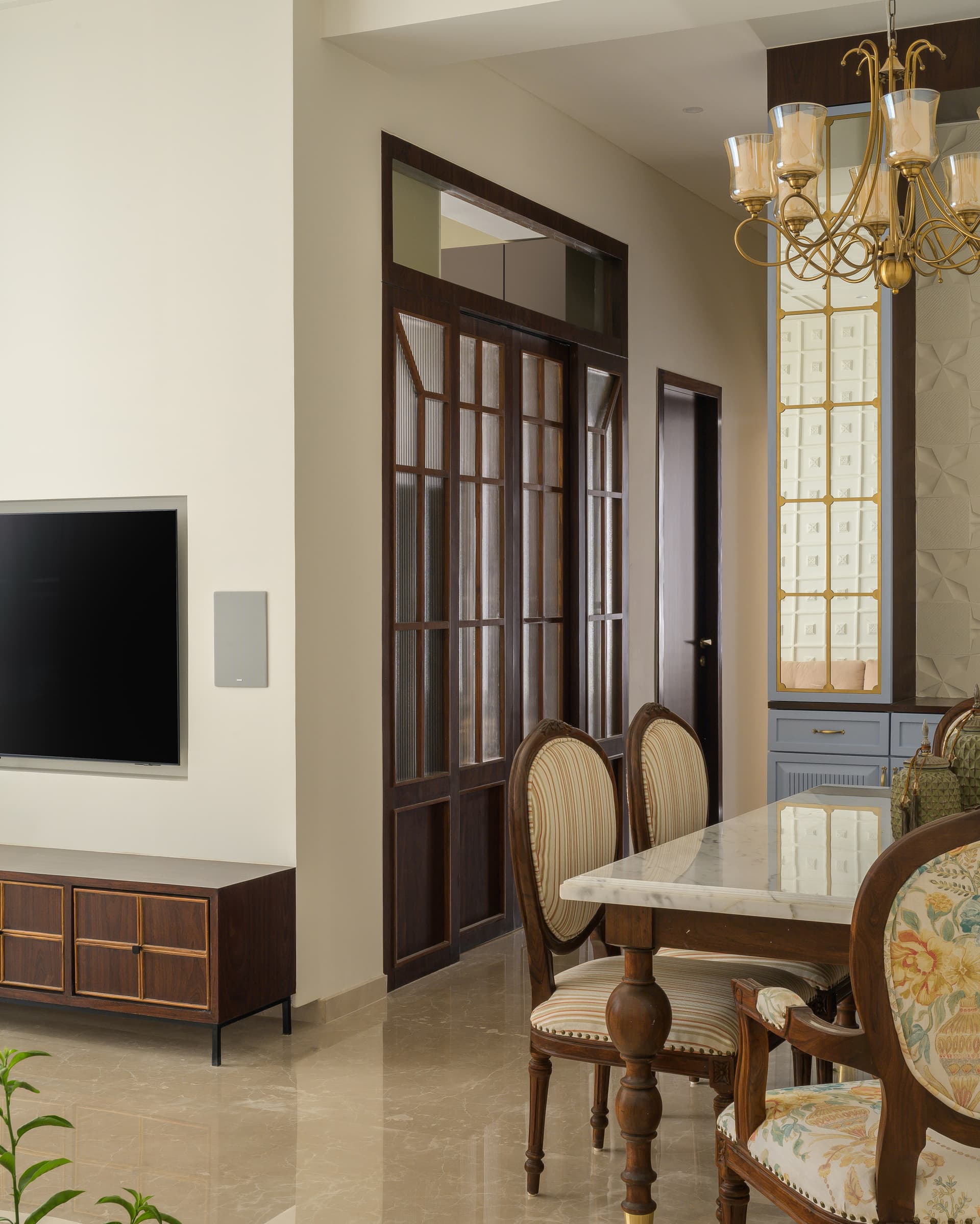 The dining zone flows seamlessly from the living room, housing a six-seater marble-top dining table paired with wooden upholstered chairs that strike the perfect balance between comfort and sophistication. A crockery unit finished in powder blue PU paint adds a refreshing yet muted contrast to the neutral tones. Gold-framed mirror shutters and veneered detailing elevate this unit from functional furniture to a refined design element. Together, the open-plan living and dining zones embody a quiet luxury, one that doesn’t clamor for attention, but impresses through restraint and elegance.