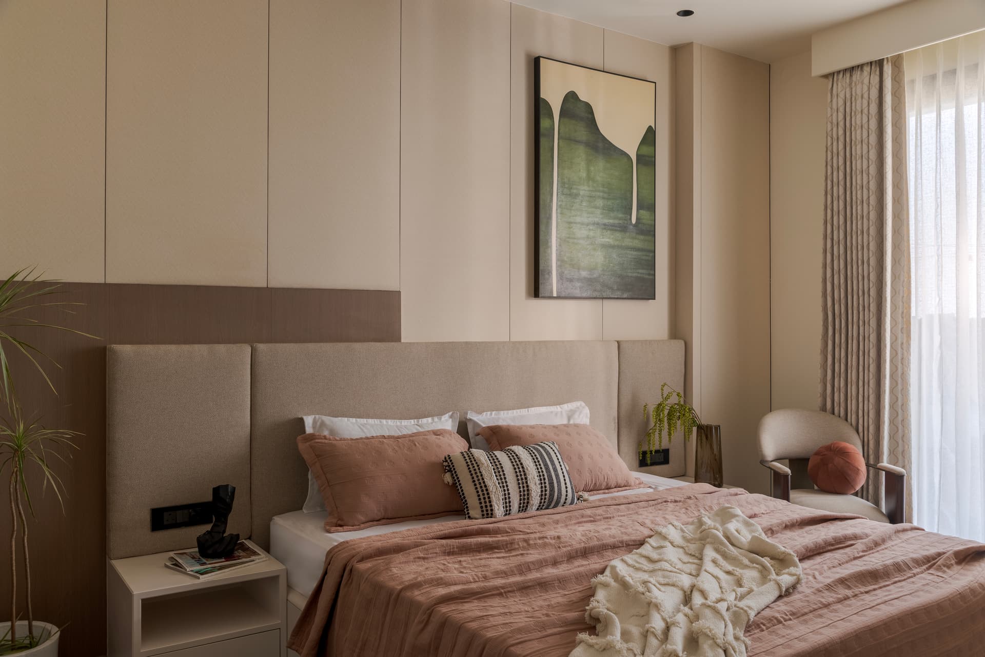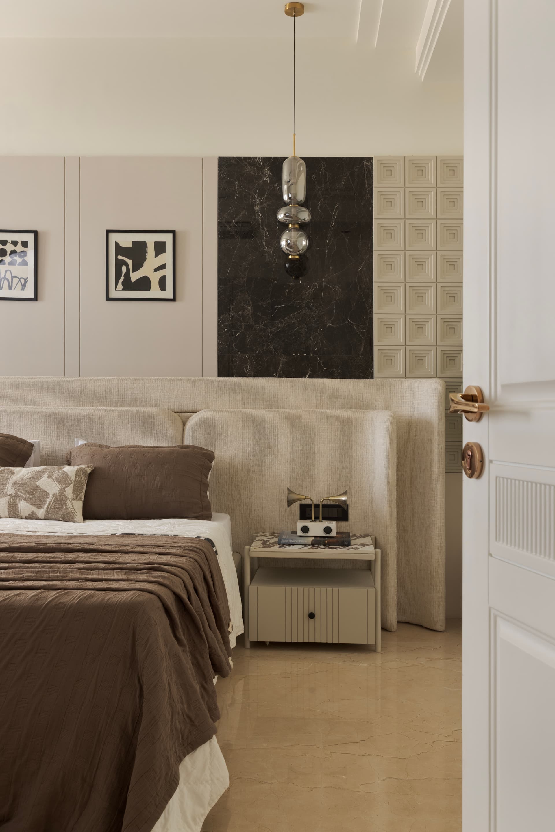 The private spaces within this Jaipur residence are designed as quiet sanctuaries, continuing the home’s overarching narrative of lightness, restraint, and material harmony. Each bedroom is approached as an individual retreat, yet unified through a cohesive palette of soft neutrals, tactile finishes, and carefully calibrated lighting that promotes rest and visual ease.