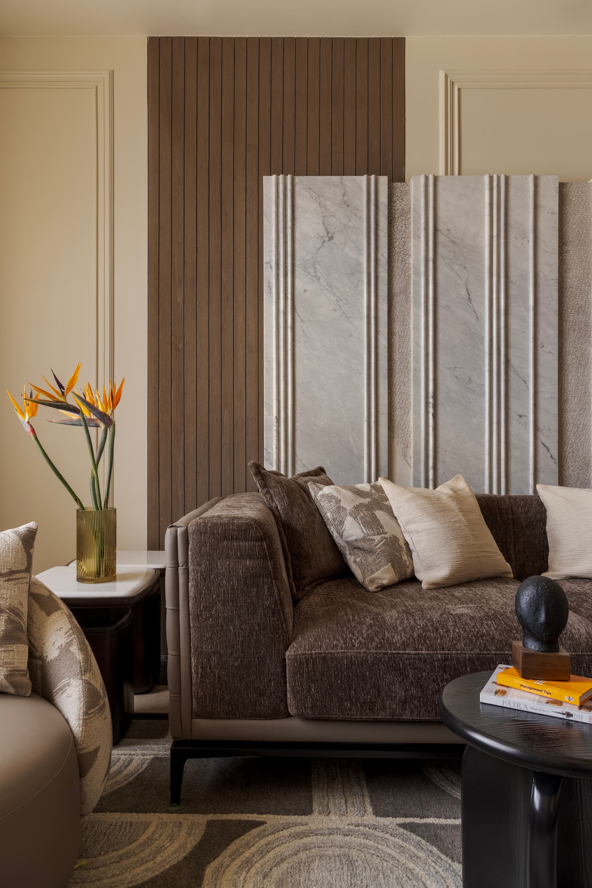 The dining area is conceived as a refined yet expansive space. Tinted mirror panelling with moulding details enhances light reflection while adding a touch of understated glamour. A marble-topped dining table with leather-detailed legs anchors the room, striking a balance between elegance and material tactility. Overhead, statement lighting fixtures act as sculptural elements, subtly reinforcing the design narrative without overpowering the space.