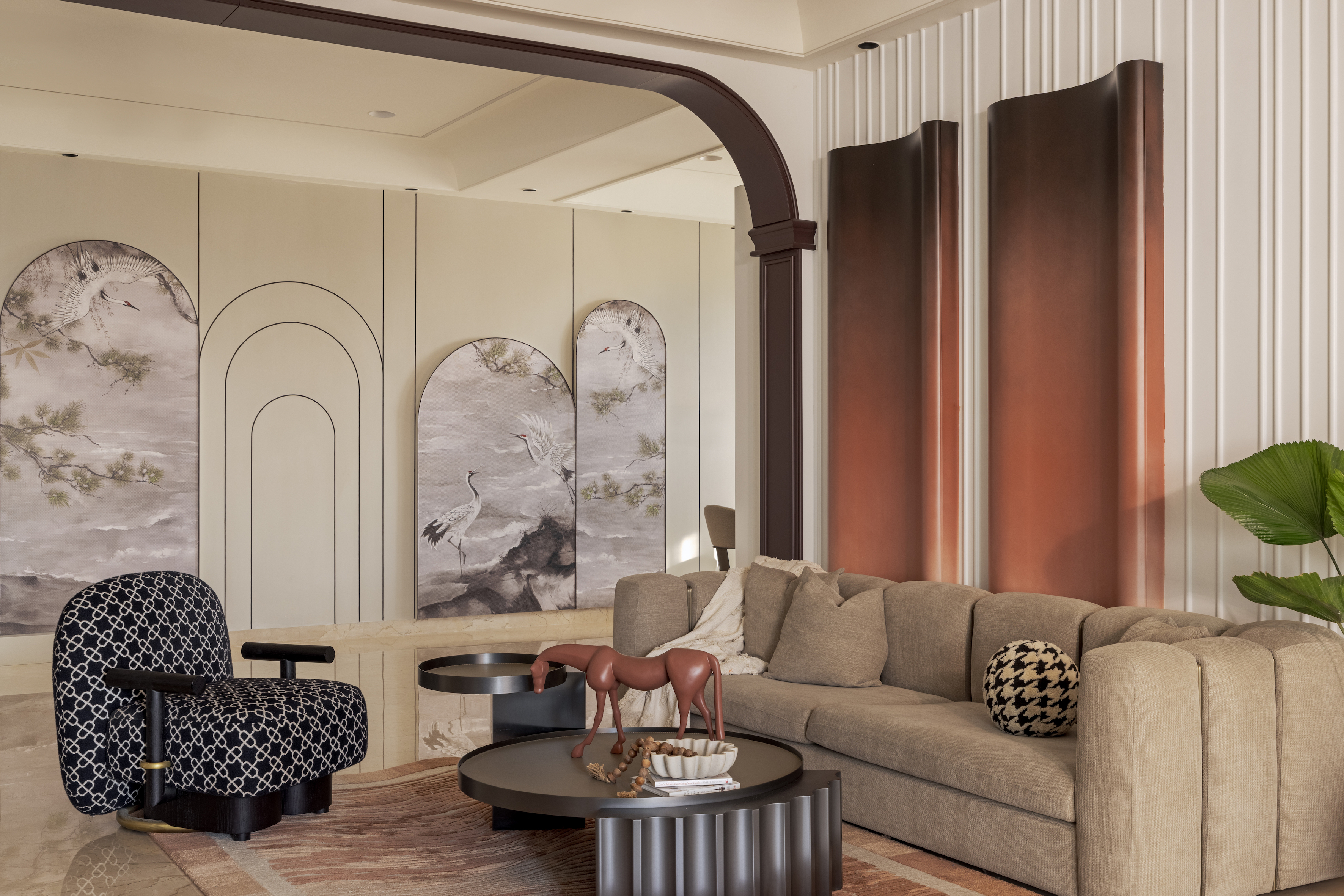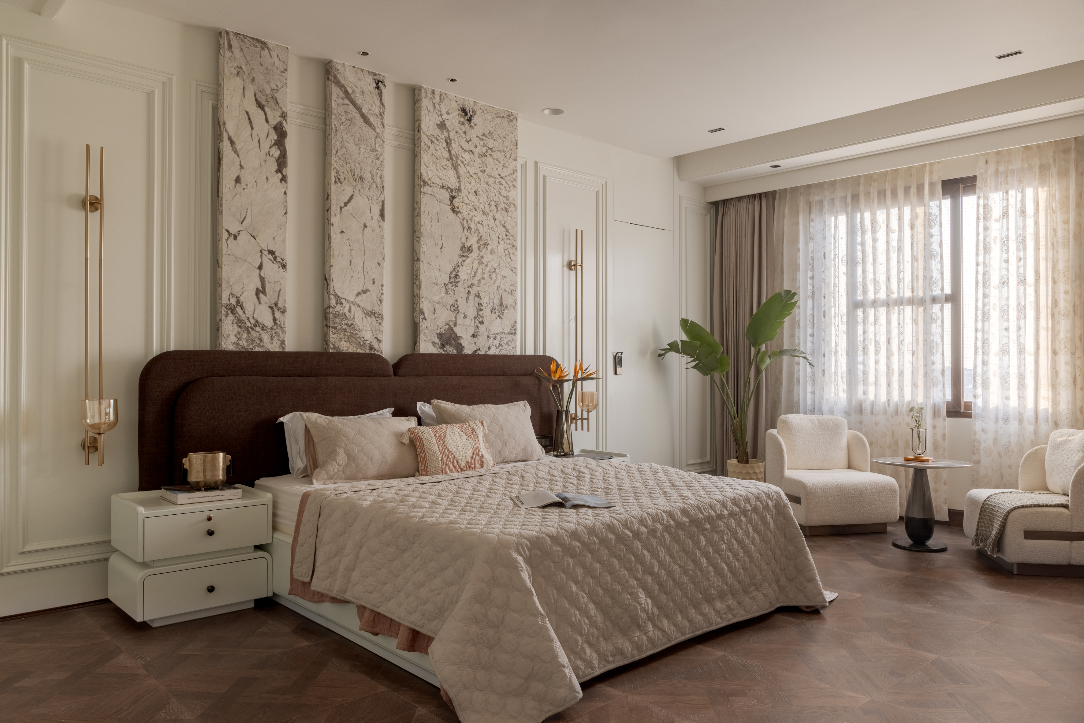 Designed for formal entertaining, the drawing room continues the home’s elegant restraint. A neutral colour scheme is complemented by symmetrical wall panelling that lends structure and balance to the space. Subtle marble fluting introduces texture without visual heaviness, reinforcing the refined material palette. Adjacent living spaces are articulated through gentle architectural gestures rather than partitions. A large uninterrupted wall in the living area is softened through a series of arches, creating rhythm and movement while avoiding monotony. These arches are finished with intricately embroidered wallpaper, adding a layer of craftsmanship and tactile richness to the otherwise minimal setting.