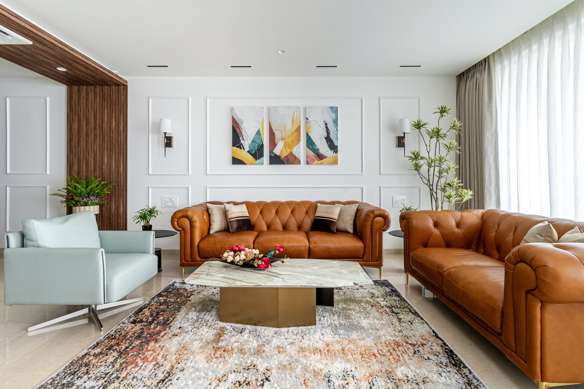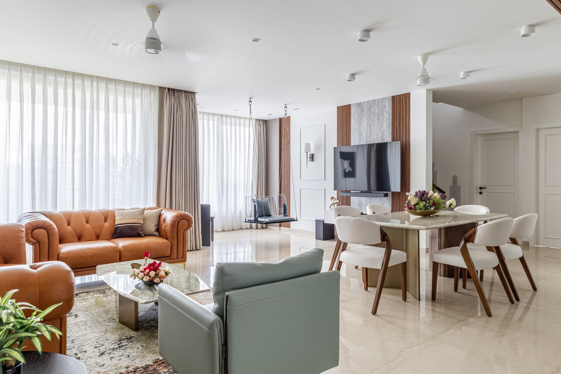 With natural light pouring in from expansive south- and west-facing windows, the design maximises brightness while ensuring a seamless flow between the living, dining, and kitchen areas. The entrance, defined by a walnut-veneered door with teakwood handles, sets an inviting tone that immediately hints at the understated luxury found within.