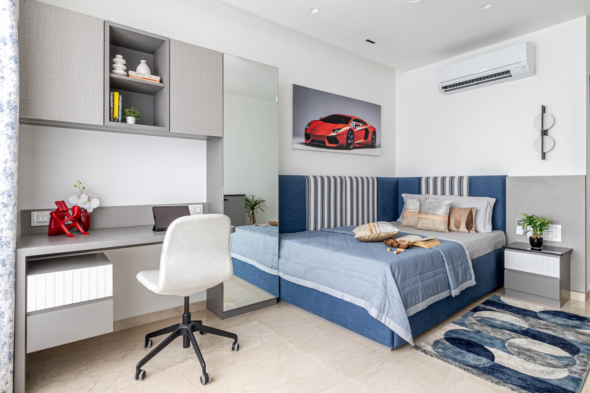 Every room in this duplex tells a story, none more so than the children’s bedrooms, which were designed to grow with them. The son’s room is a vibrant reflection of his love for cars, anchored by a bold Ferrari-themed canvas and a striking blue headboard. The sleek study desk and well-organised wardrobe offer both functionality and style, ensuring the space is as practical as it is visually engaging.