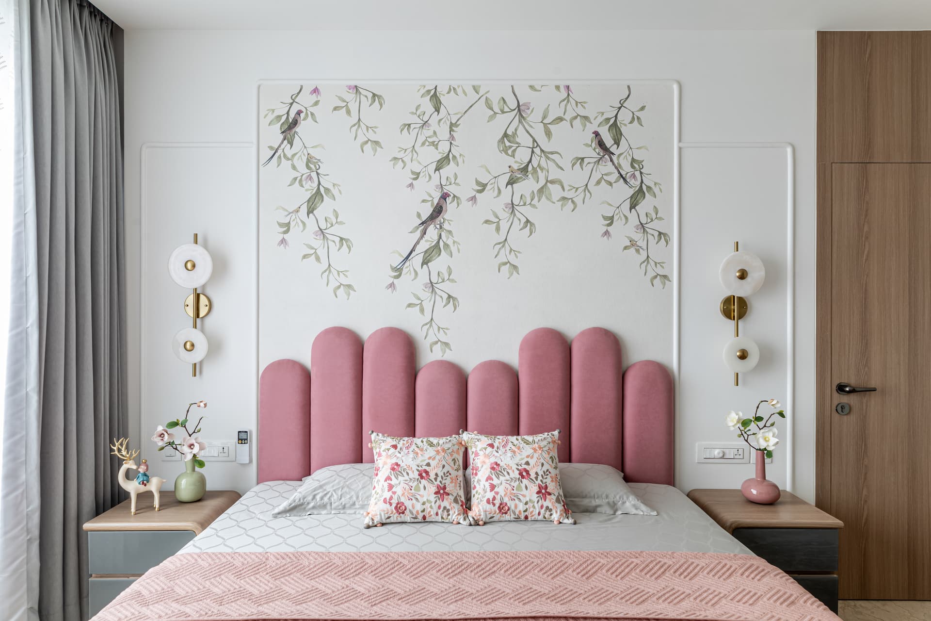 In contrast, the daughter’s room embraces a soft, serene palette, with accents of blush pink, warm grey, and natural wood tones. A delicate wallpaper adds sophistication, while the room’s furniture—a sleek study table and a storage-friendly dressing unit—balances playfulness with practicality.