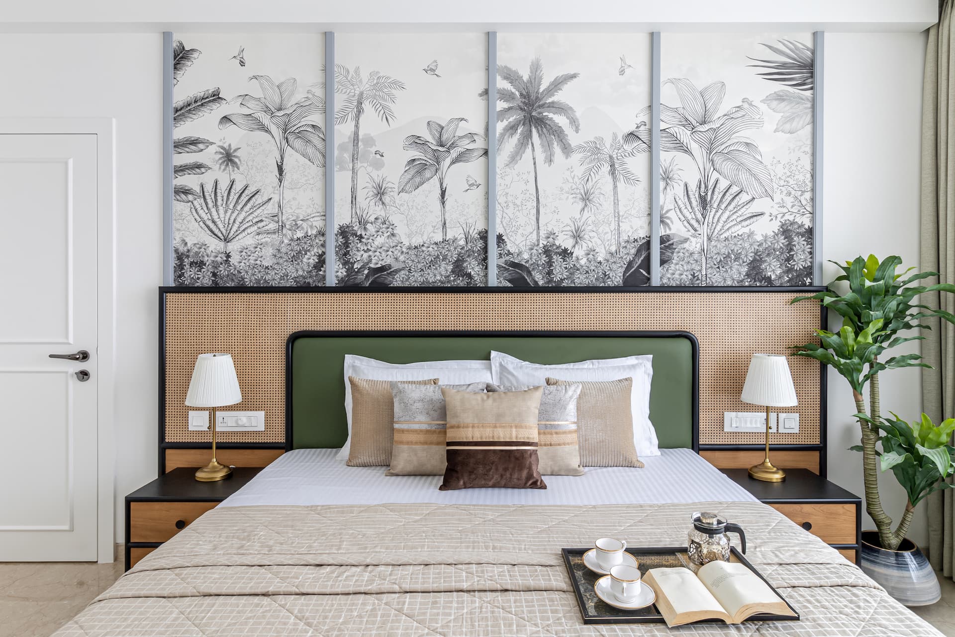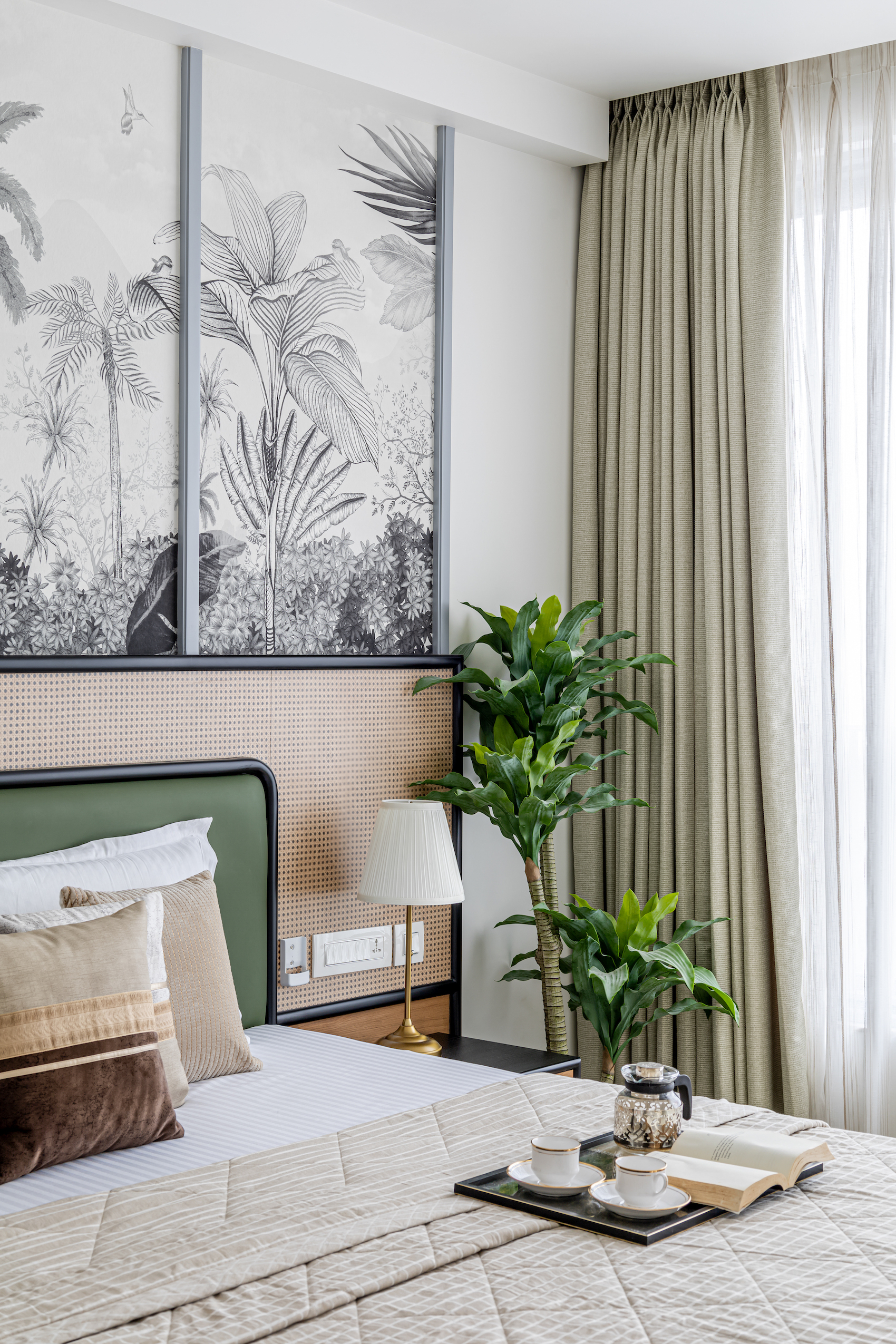 Upstairs, the master bedroom is a tropical haven that strikes the perfect balance between style and comfort. A rattan headboard set against monochrome wallpaper introduces natural textures, while a pop of olive green adds vibrancy. A cozy reading nook, complete with a lounge chair and curated lighting fixtures, provides an inviting space for relaxation.