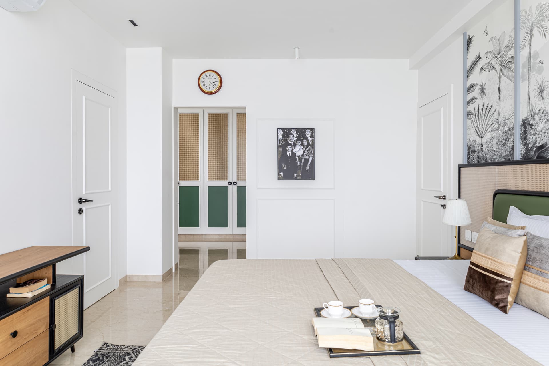 The adjoining walk-in closet and dressing room are designed for efficiency, featuring dual dressing units with individual mirrors to accommodate the couple’s needs. The space includes a luggage rack for their frequent travels, and the wardrobe shutters, made from white PU, rattan, and non-reflective glass, offer an elegant yet functional solution. The mix of materials adds warmth while maintaining a sleek, modern aesthetic.