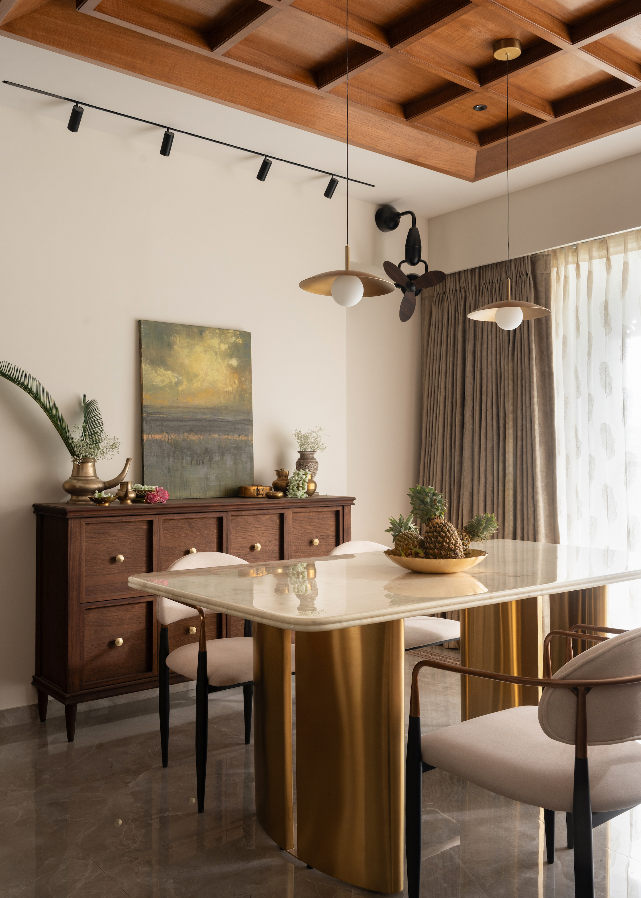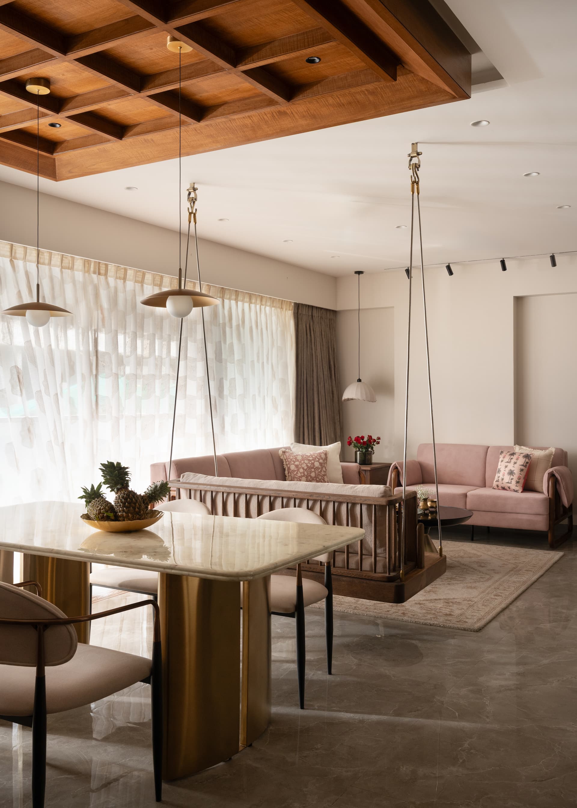 Materiality becomes the narrative thread that binds the home. Teak veneer, walnut finishes, brass accents, and curated textiles create a tactile vocabulary that feels authentic and grounded. The journey begins at the foyer where a sculpted wall detail, wooden console, and glimmering glass bead ceiling set a tone of subtle craftsmanship. Moving inward, the residence opens into fluid living and dining spaces anchored by the handcrafted wooden swing designed with a swivel back that reorients between the two zones. More than furniture, it becomes an emotional centrepiece that brings nostalgia into everyday moments.