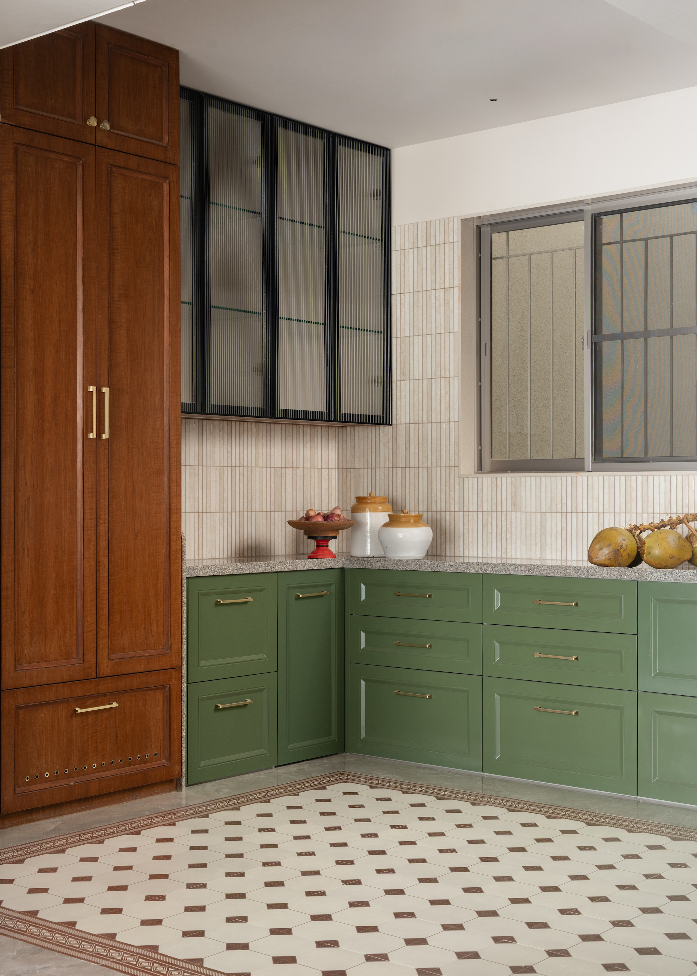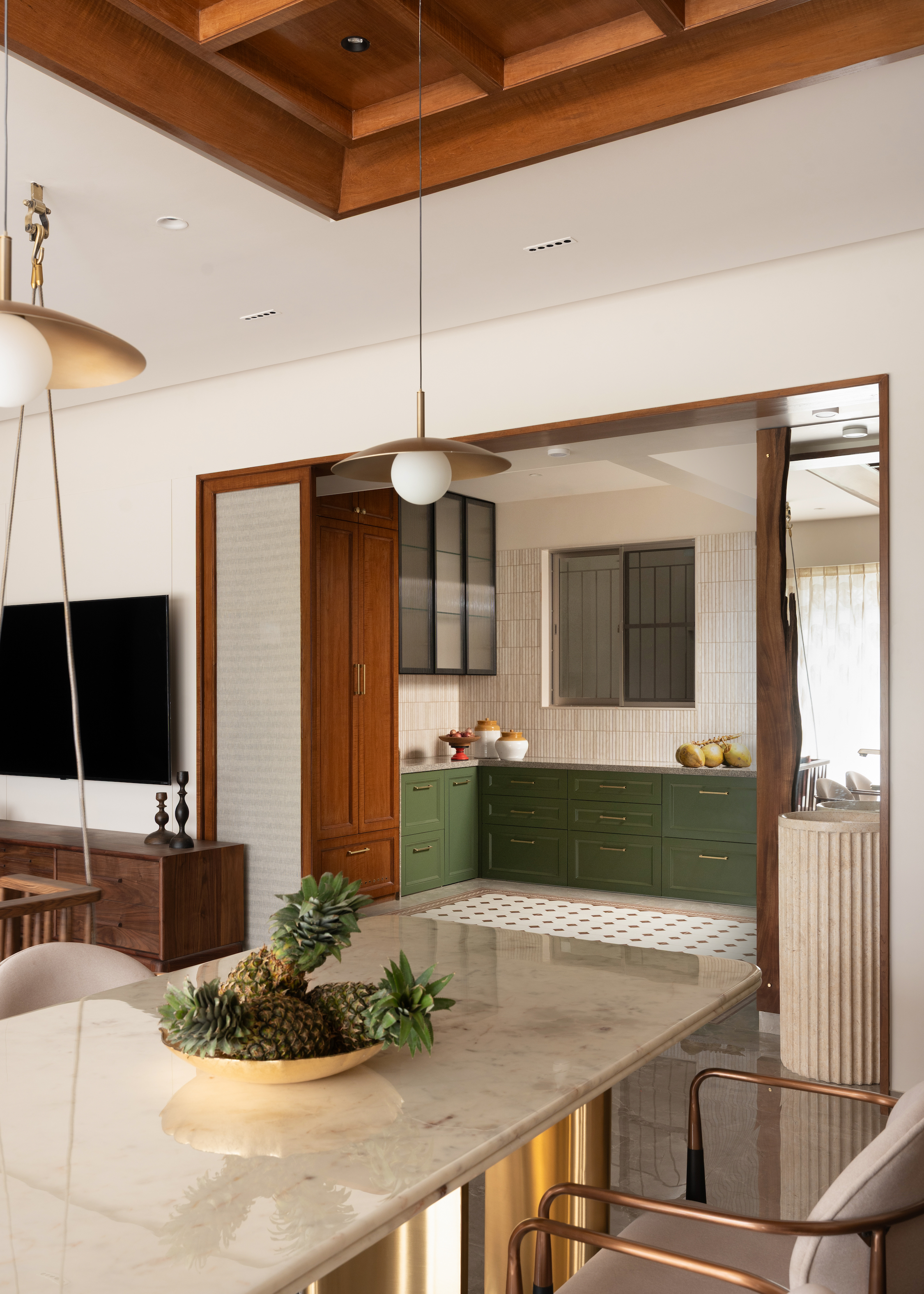 Modern functionality and heritage inspired elements coexist seamlessly. The marble and brass dining ensemble exudes elegance without excess. The mandir, lined in a striking red interior, becomes a quiet moment of pause. The kitchen, with patterned flooring, clean forms, and warm finishes, balances precision and personality.