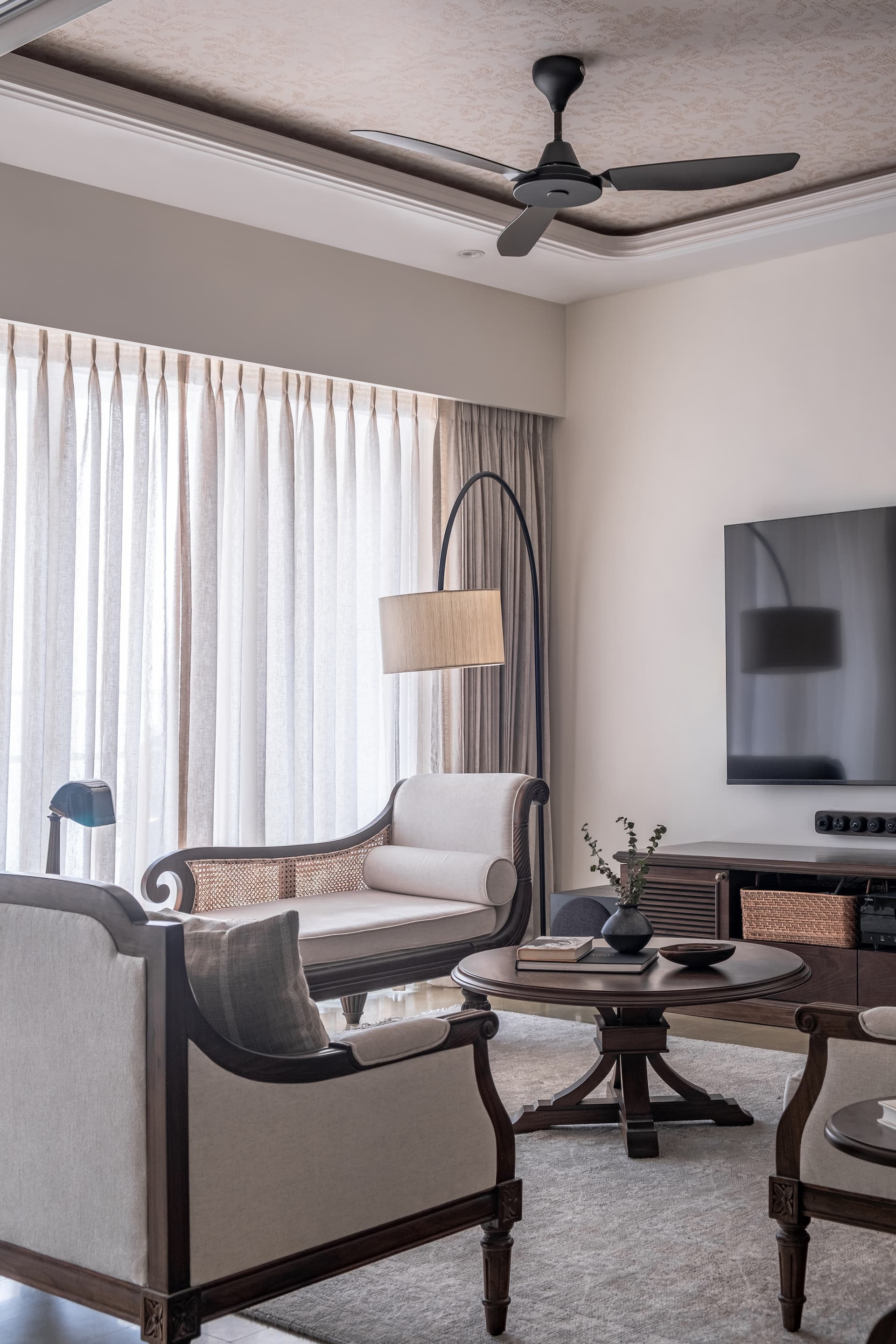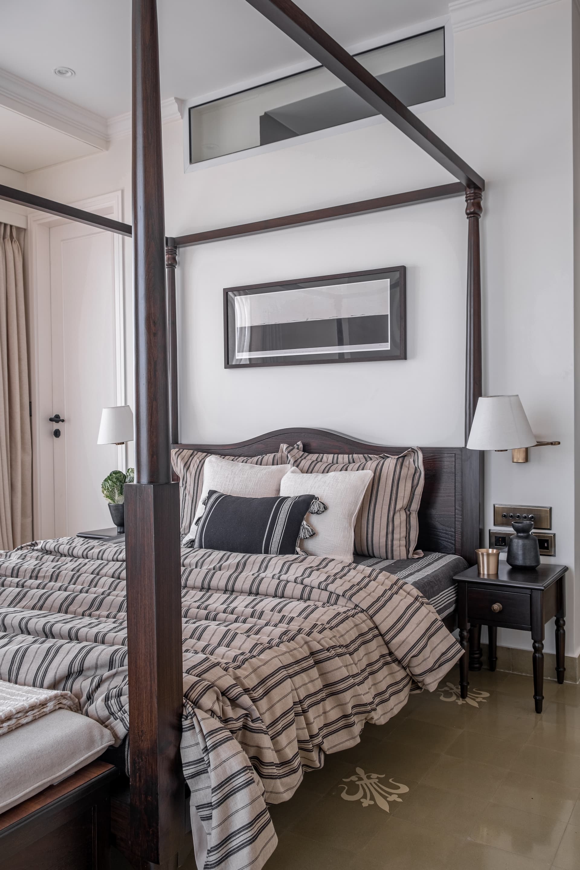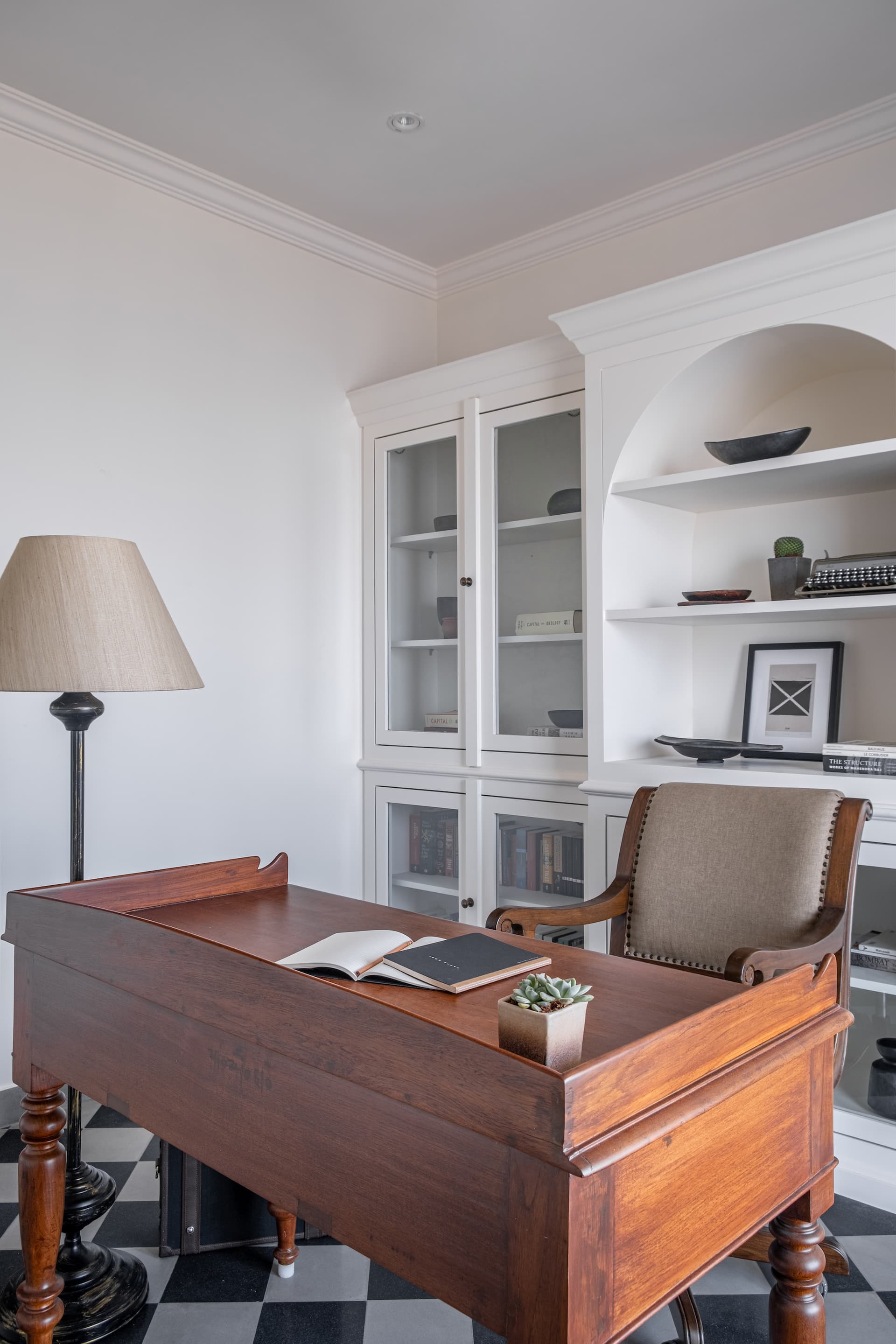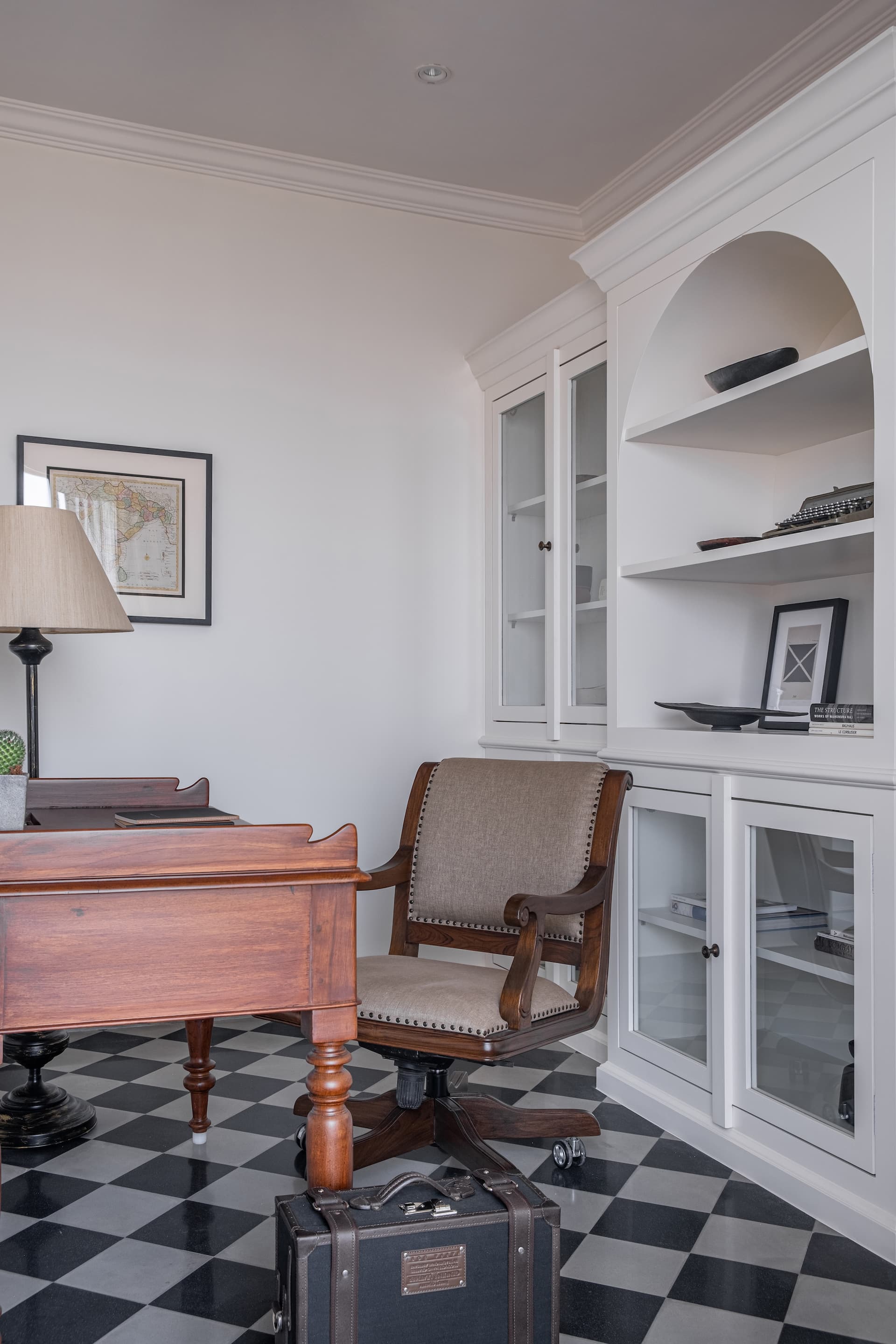 The transformation of Vintage Vista involved a thoughtful resolution of each space to meet the client’s needs both functionally and aesthetically. The master bedroom was designed to offer a serene view of the sea from the four-poster bed, with minimal clutter to emphasise the natural beauty outside. The adjacent study features a desk positioned to avoid screen glare while offering a sea view, and a massive bookshelf that serves as a backdrop for virtual meetings. This room shows us the client’s intellectual pursuits, providing a space that encourages creativity and productivity.