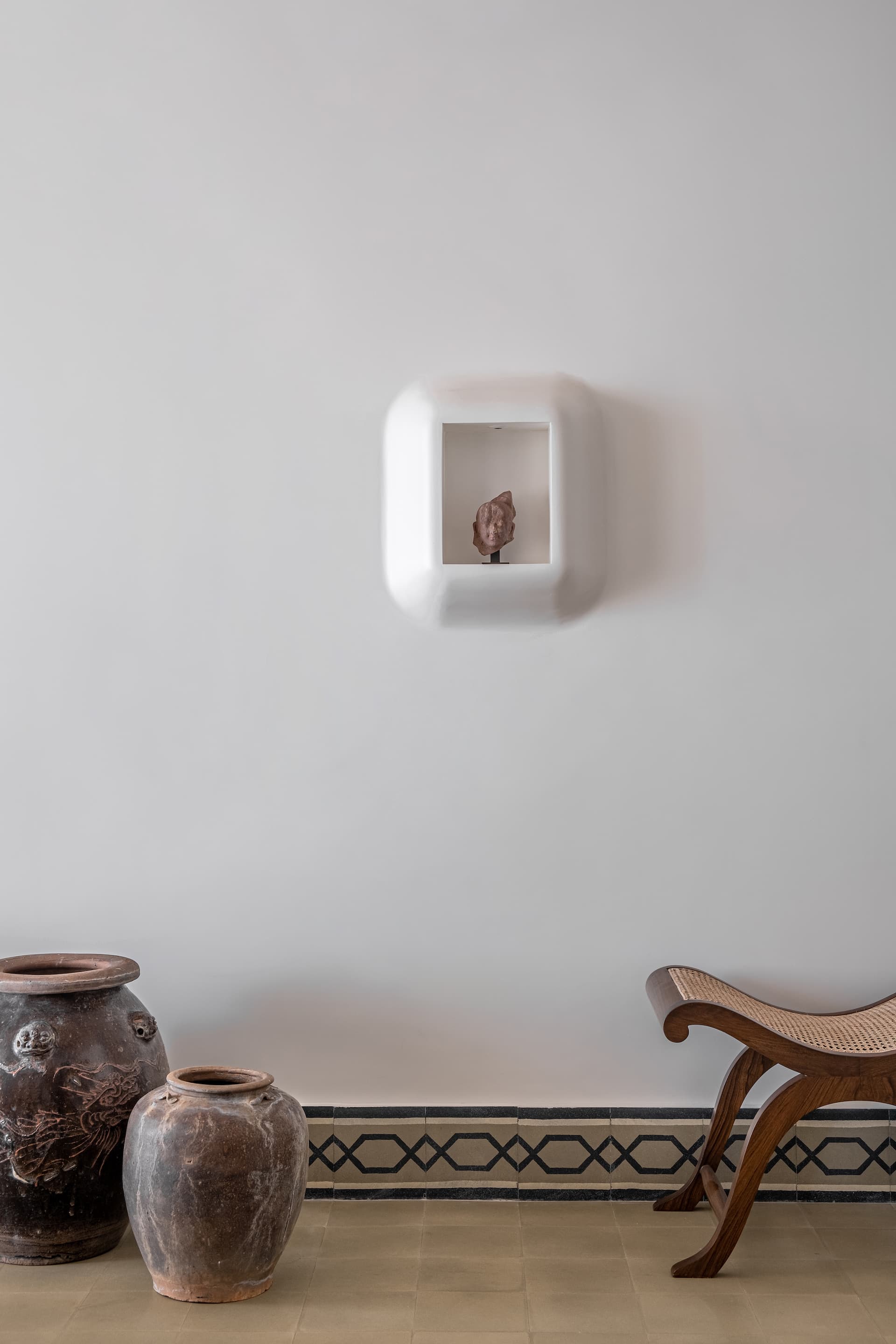 One of the standout features of Vintage Vista is its integration of art and antiquities, reflecting the client’s passion for art and history. The careful placement of canvases and archaeological pieces throughout the home creates a dialogue between the past and present, adding depth and character to the space. Canvases are positioned to enhance the visual experience of each room, while carved niches inspired by Rajasthani mud houses elegantly display artifacts. This thoughtful integration not only enriches the aesthetic appeal of the home but also serves as a testament to the client’s refined taste and intellectual curiosity.