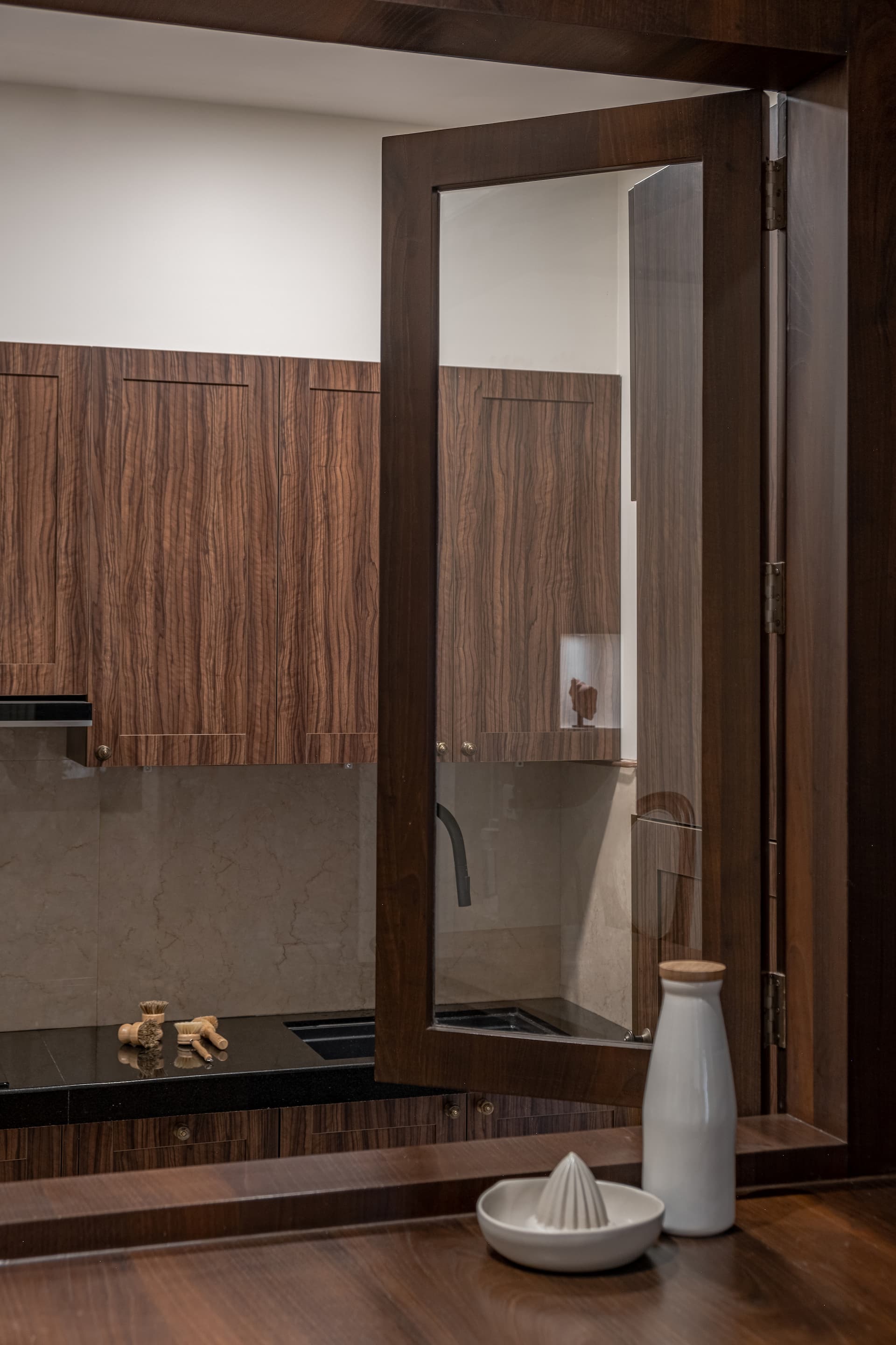 The inception of Vintage Vista was driven by homeowner Bijou George’s desire to transform his newly purchased apartment into a home that exudes warmth, character, and a sense of place. George, a financial writer and former hedge fund professional found the original finish of the apartment uninspiring. He sought a space that would reflect his passion for vintage aesthetics while maximising the apartment’s intrinsic advantages, such as its prime location and stunning views. The design inspiration for Vintage Vista was deeply rooted in the artisanal heritage of South India, particularly the Chettinad architecture known for its intricate detailing and use of traditional materials. Each design element was carefully chosen to pay homage to the past while ensuring a harmonious flow of textures and colours throughout the home.