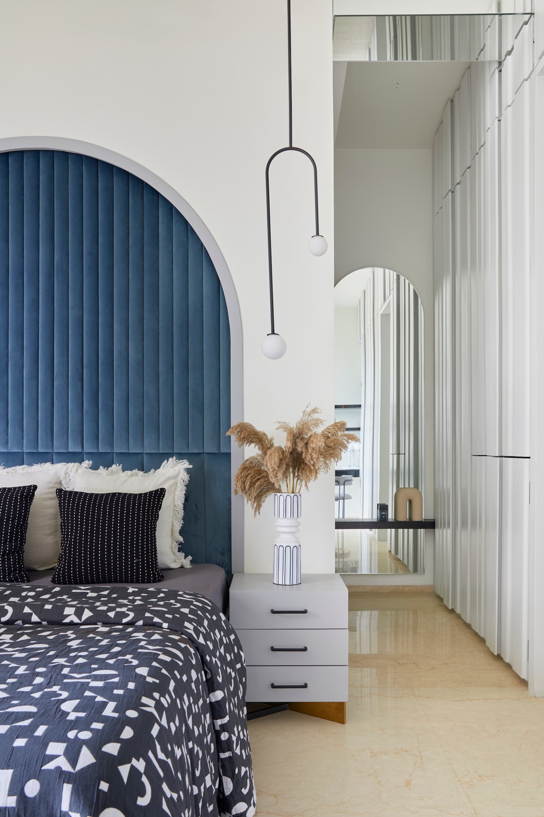 Each bedroom reflects individual preferences while adhering to the overall design concept. The son’s bedroom features his favorite characters and a color scheme of blue, greys, and yellows. The daughter’s room, designed with a chic and edgy atmosphere, incorporates blacks, greys, and blues, with arches as a dominant feature. The parents’ bedroom maintains a minimalist aesthetic with simple white wardrobes and a custom-made metal rod with hanging pillows as the bed wall’s highlight.