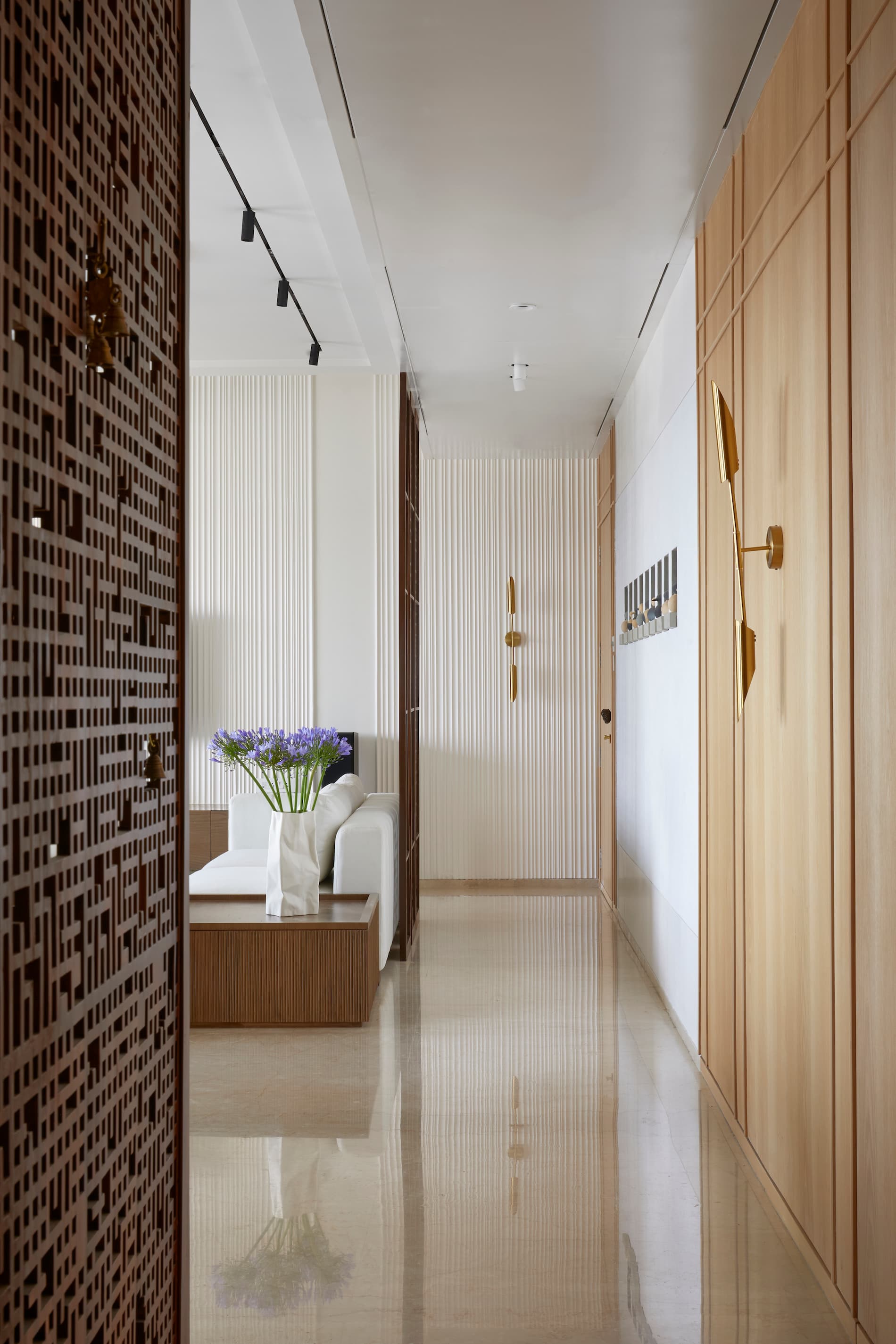 A reinterpretation of the mandir jali design creates a privacy screen between the entry and living space, while light-coloured furnishings maintain a fresh, airy ambiance. The mandir area was reconfigured to include a study corner, separated by a laser-cut wood panel jali adorned with brass bells. The passage, with its 38-foot length, features a dramatic chevron pattern with marble inlays, adding visual interest. The powder bathroom was revamped with honed finish terrazzo walls, a black marble portal, and a pedestal wooden basin to create a chic, character-filled space.
