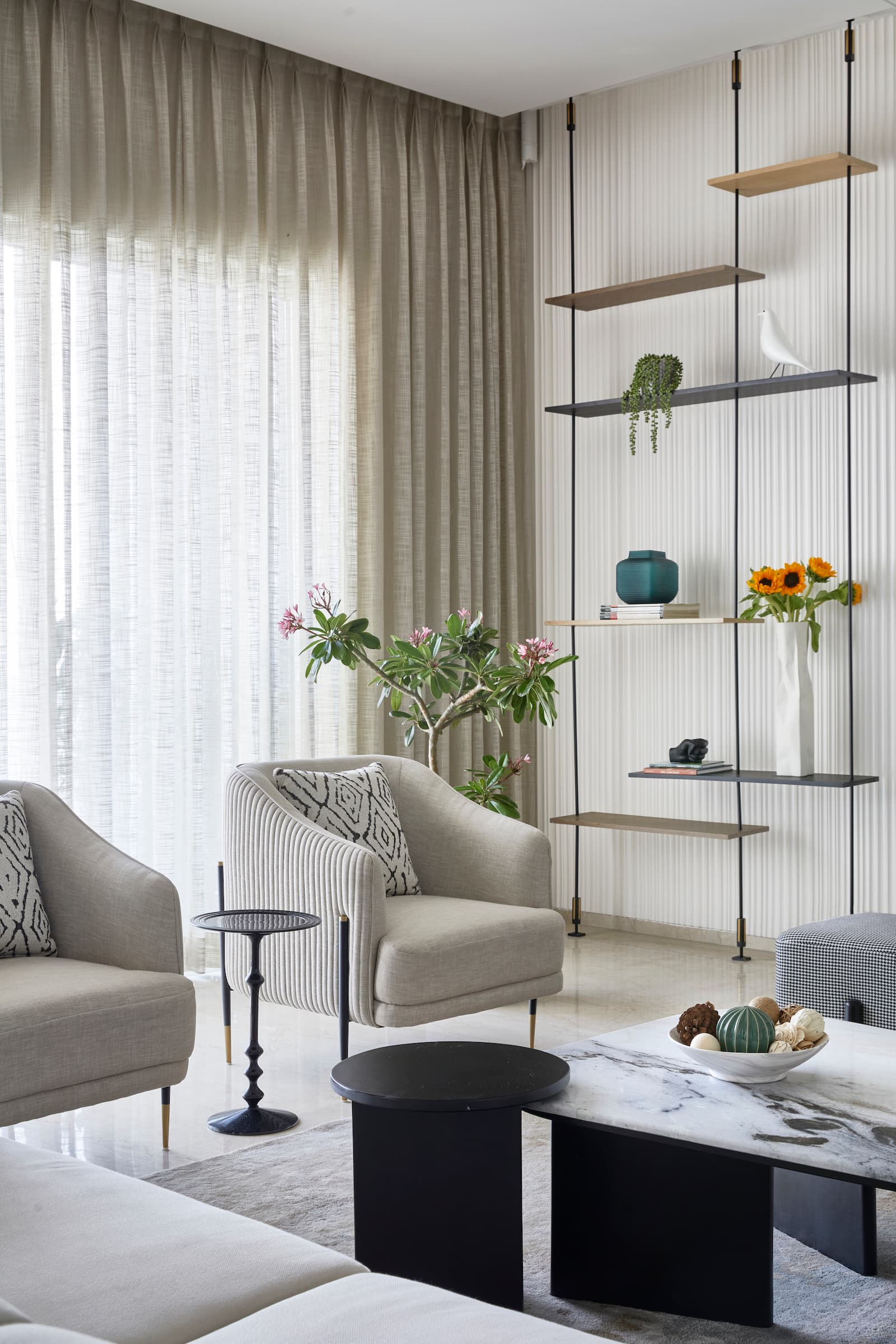 Throughout the apartment, long pendant lights, a neutral colour palette, curated accessories, and minimal art displays enhance the modern theme. Attention to detail in flooring patterns, textured walls, and customised elements creates a cohesive and visually appealing space, merging contemporary aesthetics with timeless design principles. The result is a home that seamlessly blends each family member’s personality while maintaining an overall sense of character.