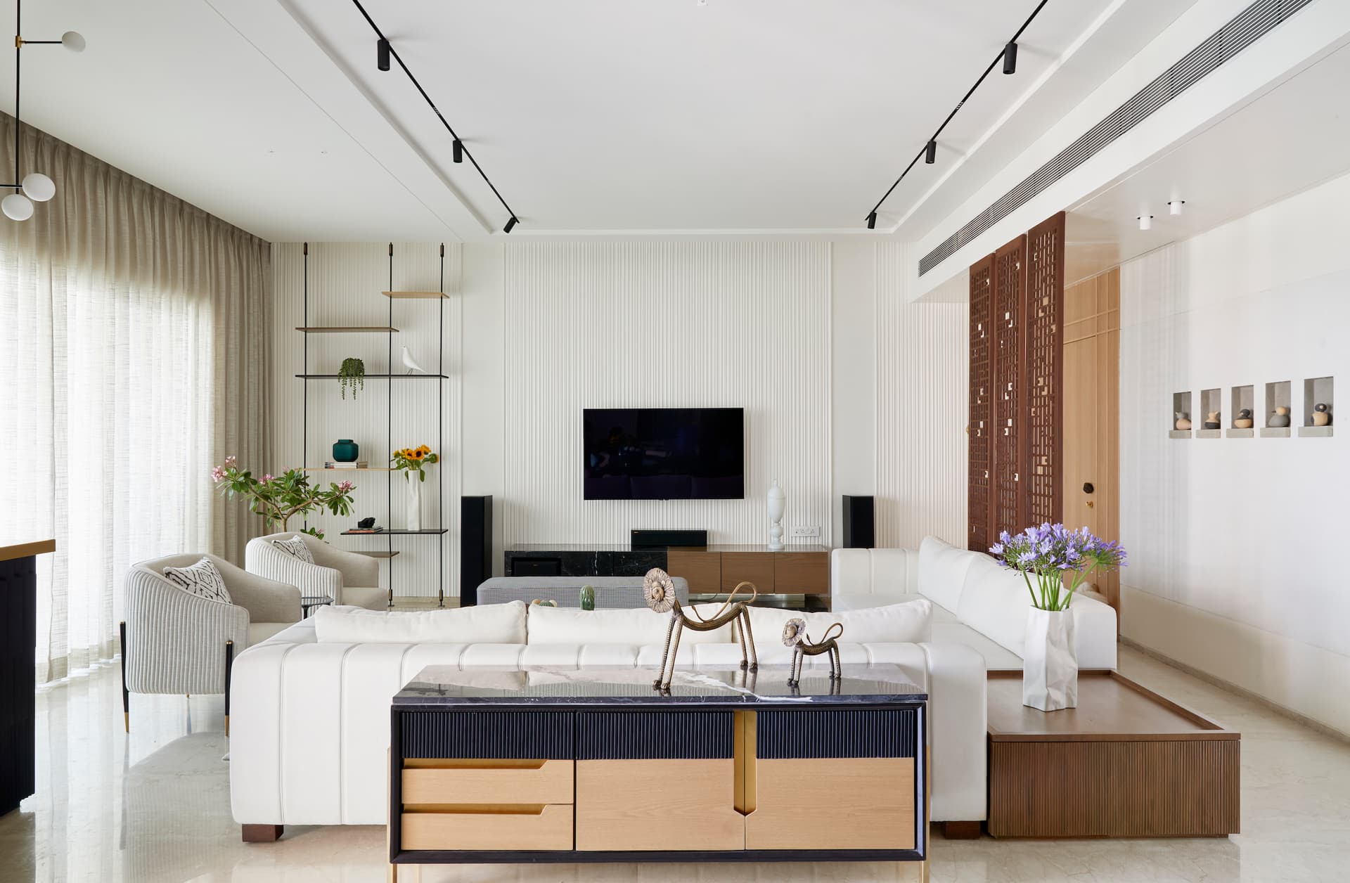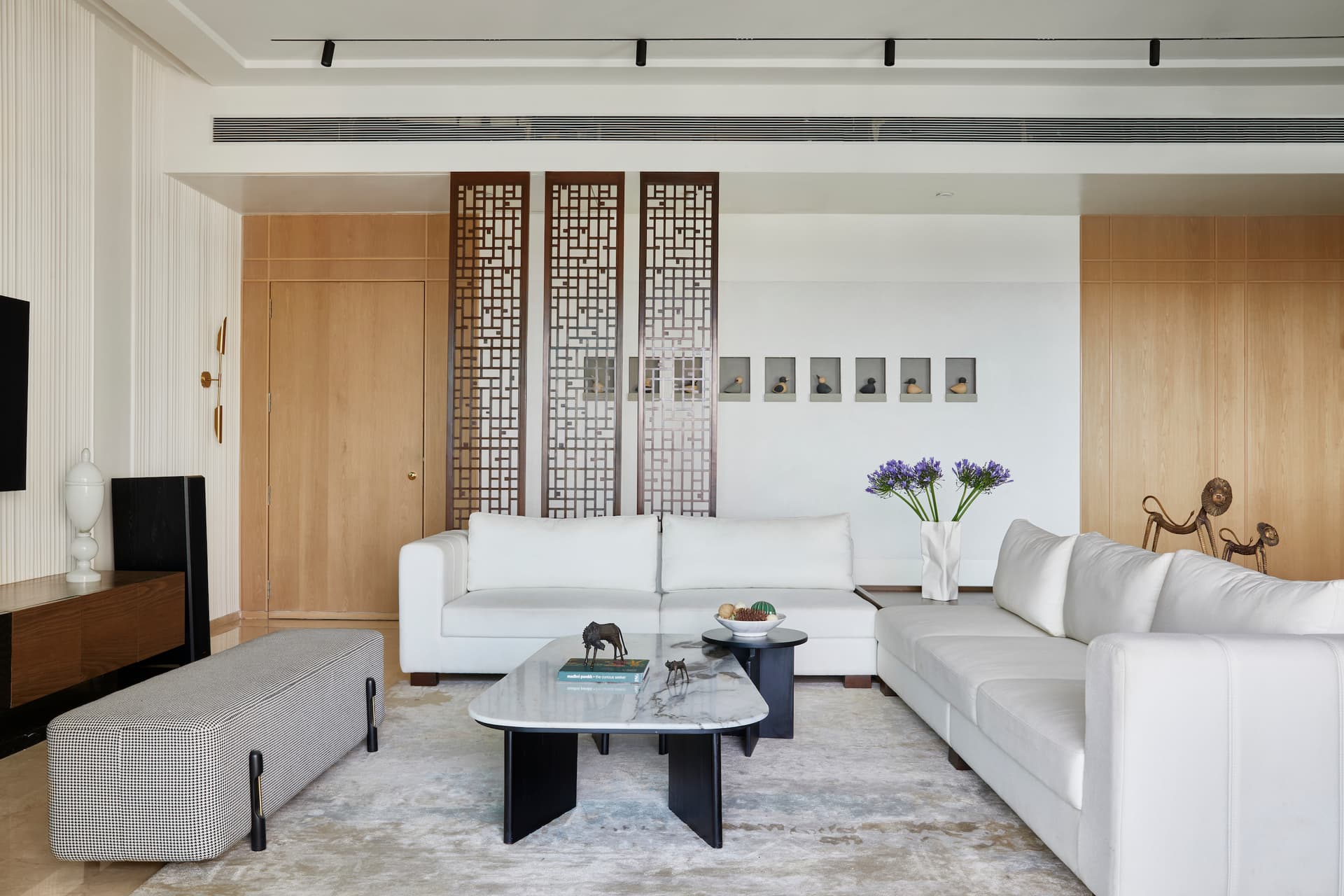 The design narrative emphasizes a clutter-free, visually elongated concept with a neutral-toned palette, creating a light and airy ambiance. Intricate detailing on functional elements and the use of textural elements add visual interest. The apartment’s standard doors were modified to 9 feet in height, featuring flushed door detailing and paneling to accentuate the 11-foot ceilings, contributing to a grander and more spacious feel.
