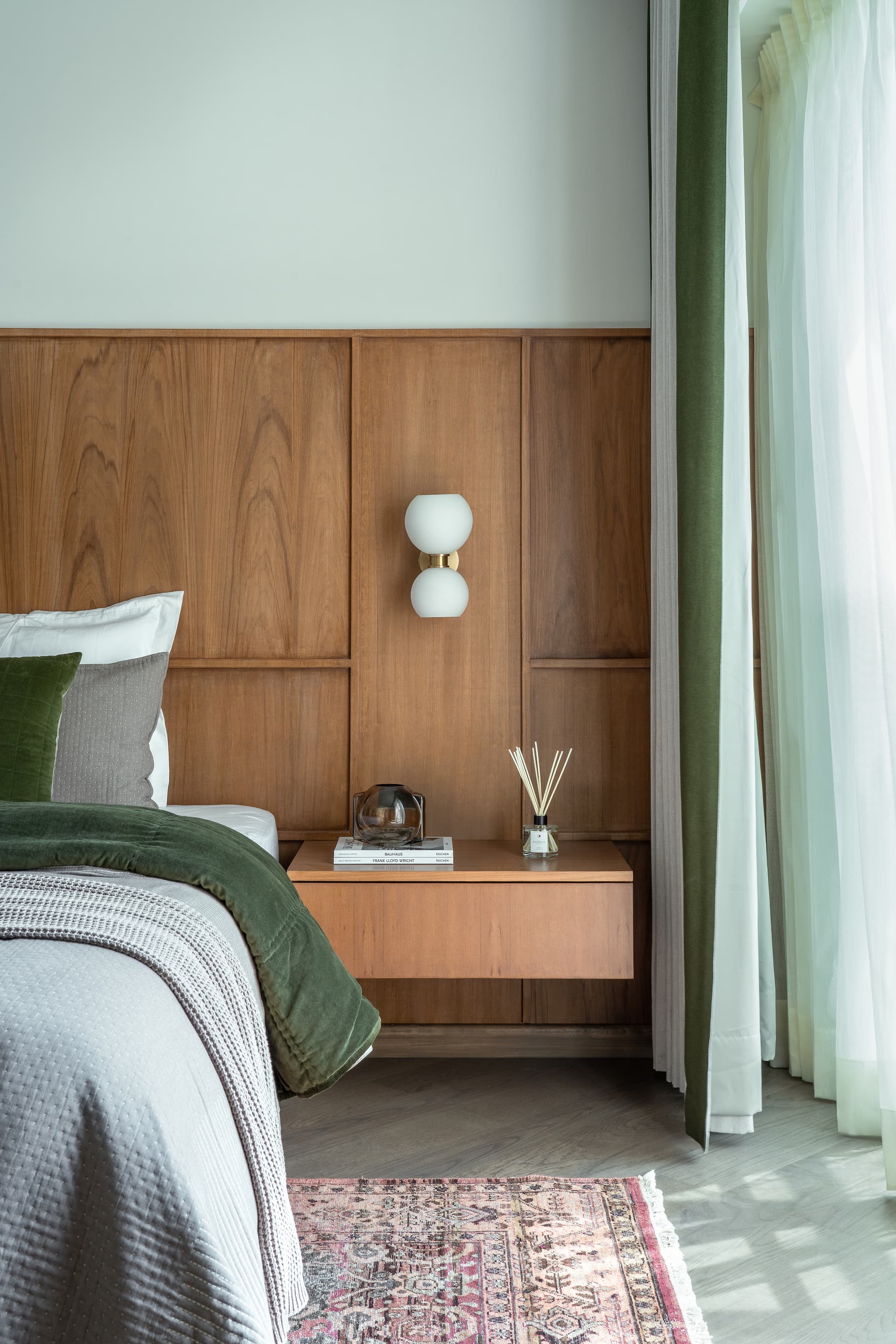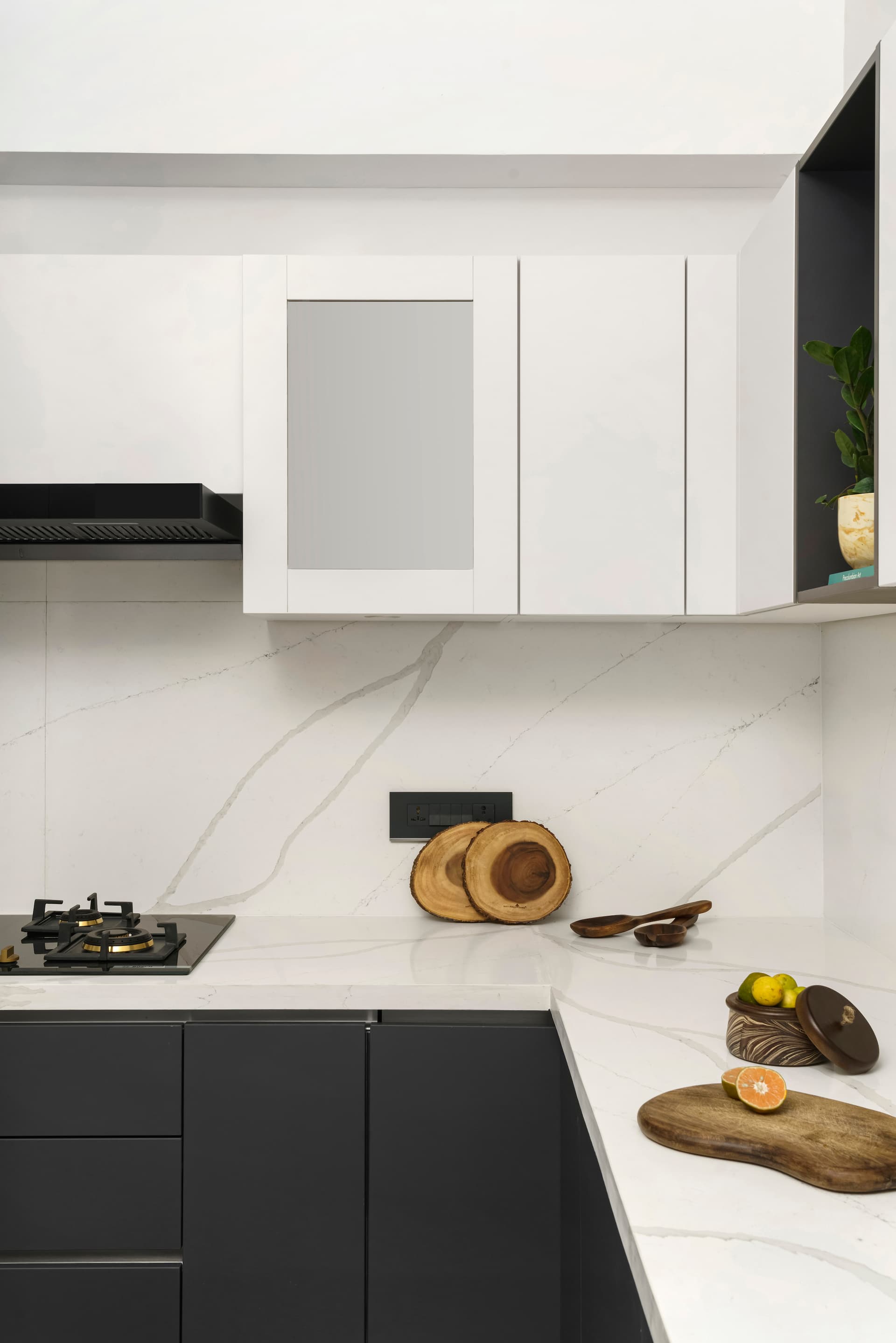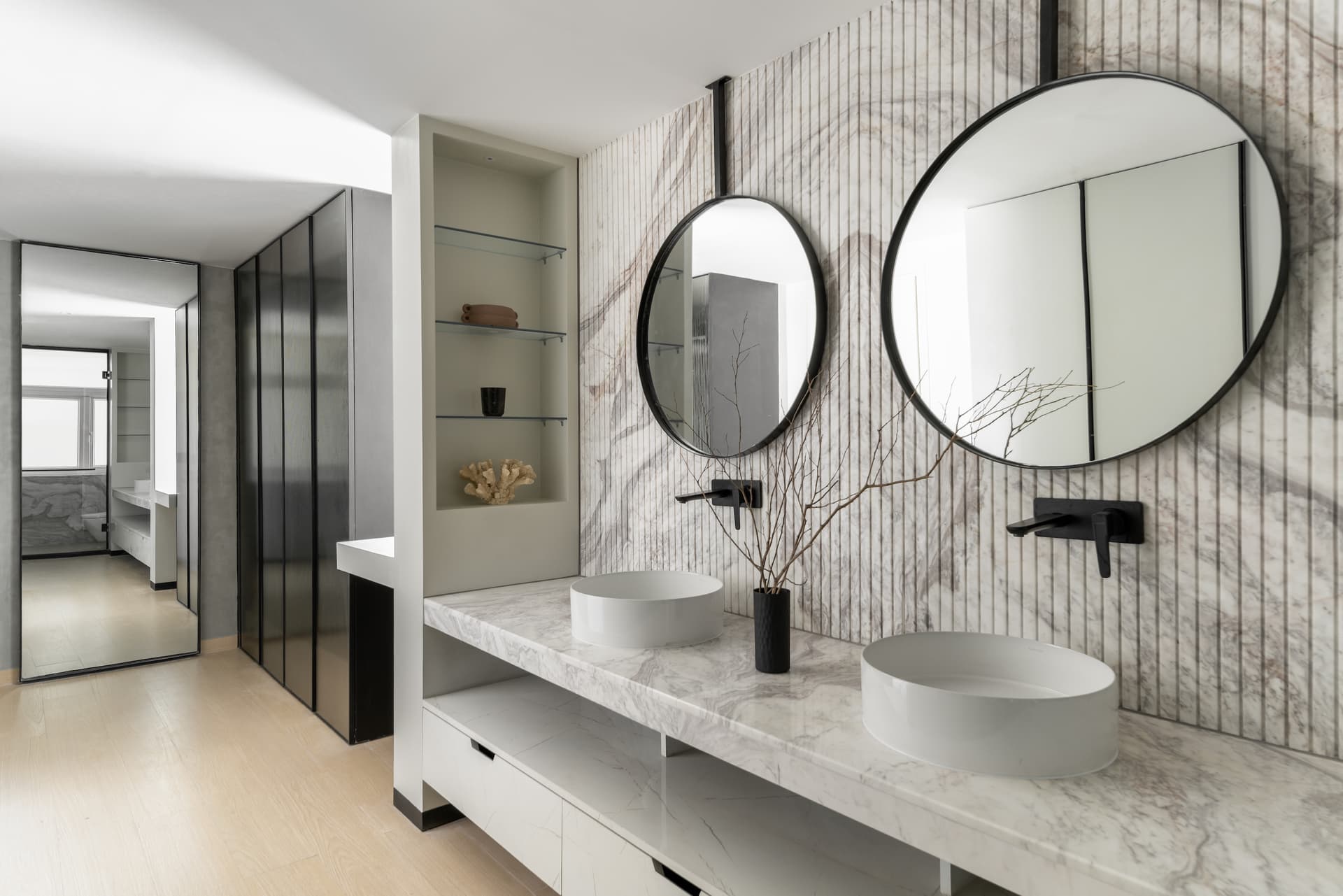 The foyer of this five-bedroom home welcomes guests with layered character. A striking combination of Pentagonia marble and an artistic metal strip accentuates the white fluted panelling of the foyer wall, complemented by a shoe storage console finished in eucalyptus-toned veneer. An elegant powder room adorned with Black Panda marble stands adjacent to the foyer. On the right side, the guest bedroom creates a captivating contrast of materials, with teak veneer grid panelling adding texture to half of the neutral wall.