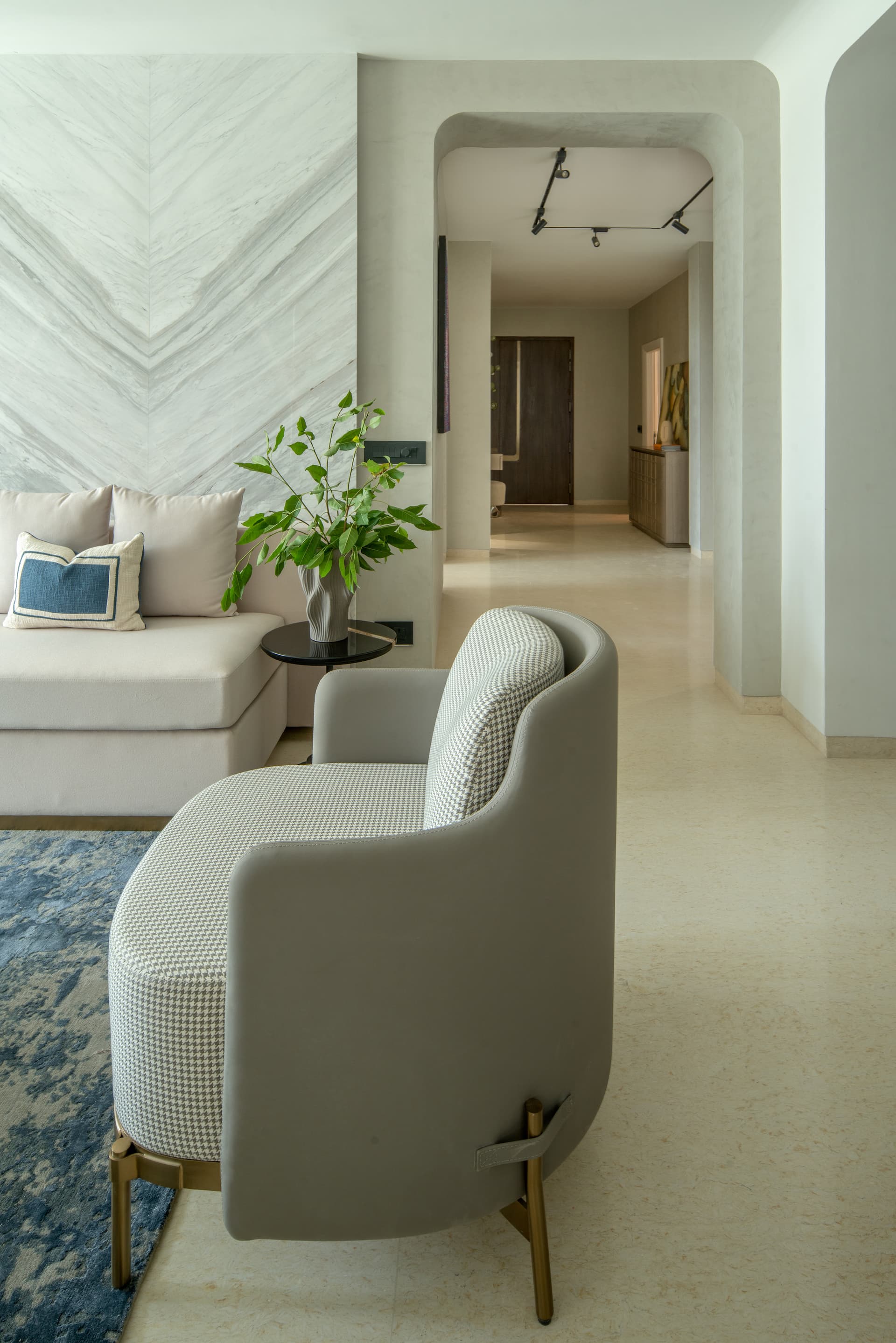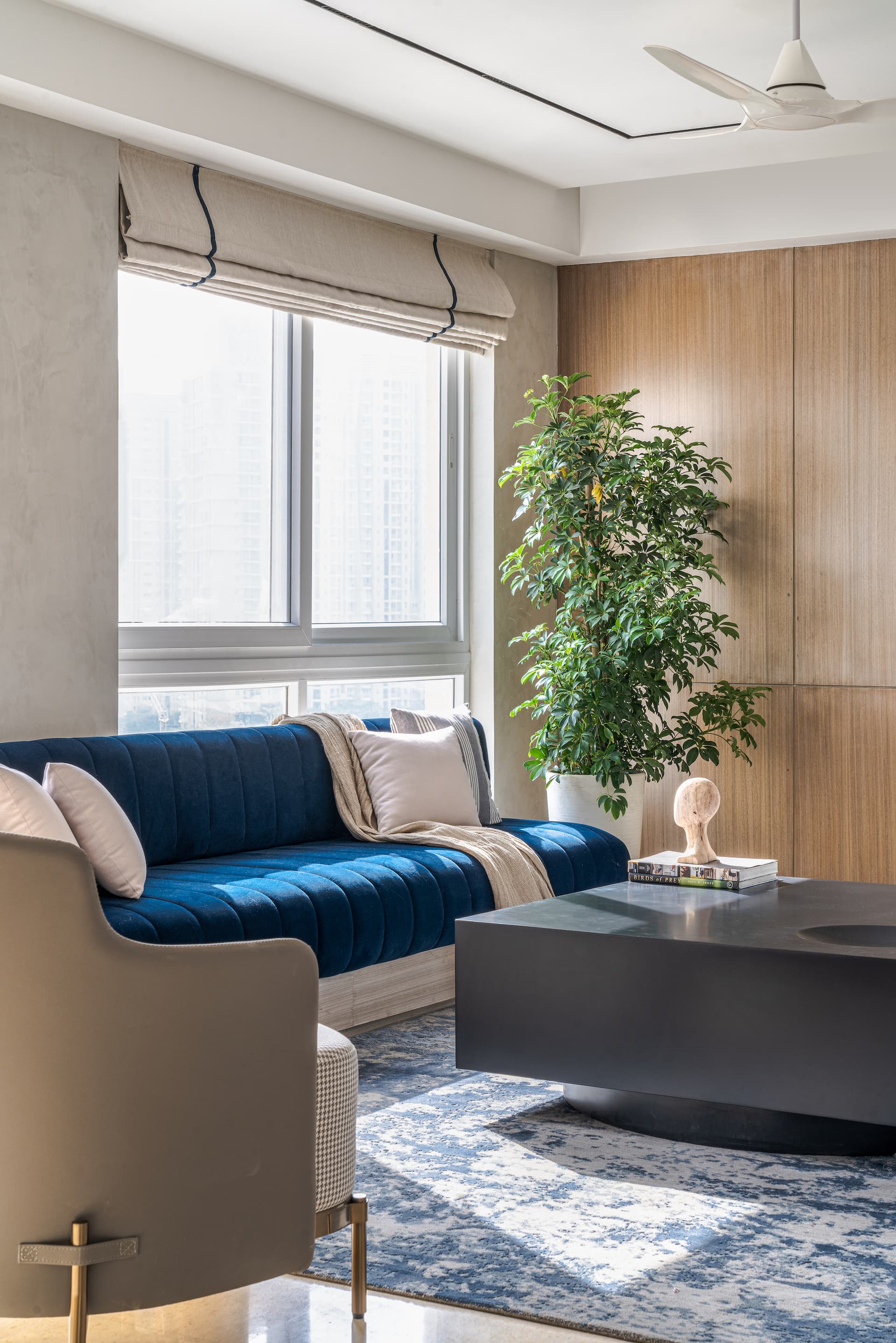 Moving further into the home, we find the heart of the residence—the living and dining room—where natural light pours through expansive windows, enveloping the contemporary furniture and accent walls. Veneer and marble panelling add a touch of sophistication to the sitting area, with a refined beige and blue colour scheme. The dining space features white concrete fluted panels that beautifully complement the marble-topped dining table and grey chairs.