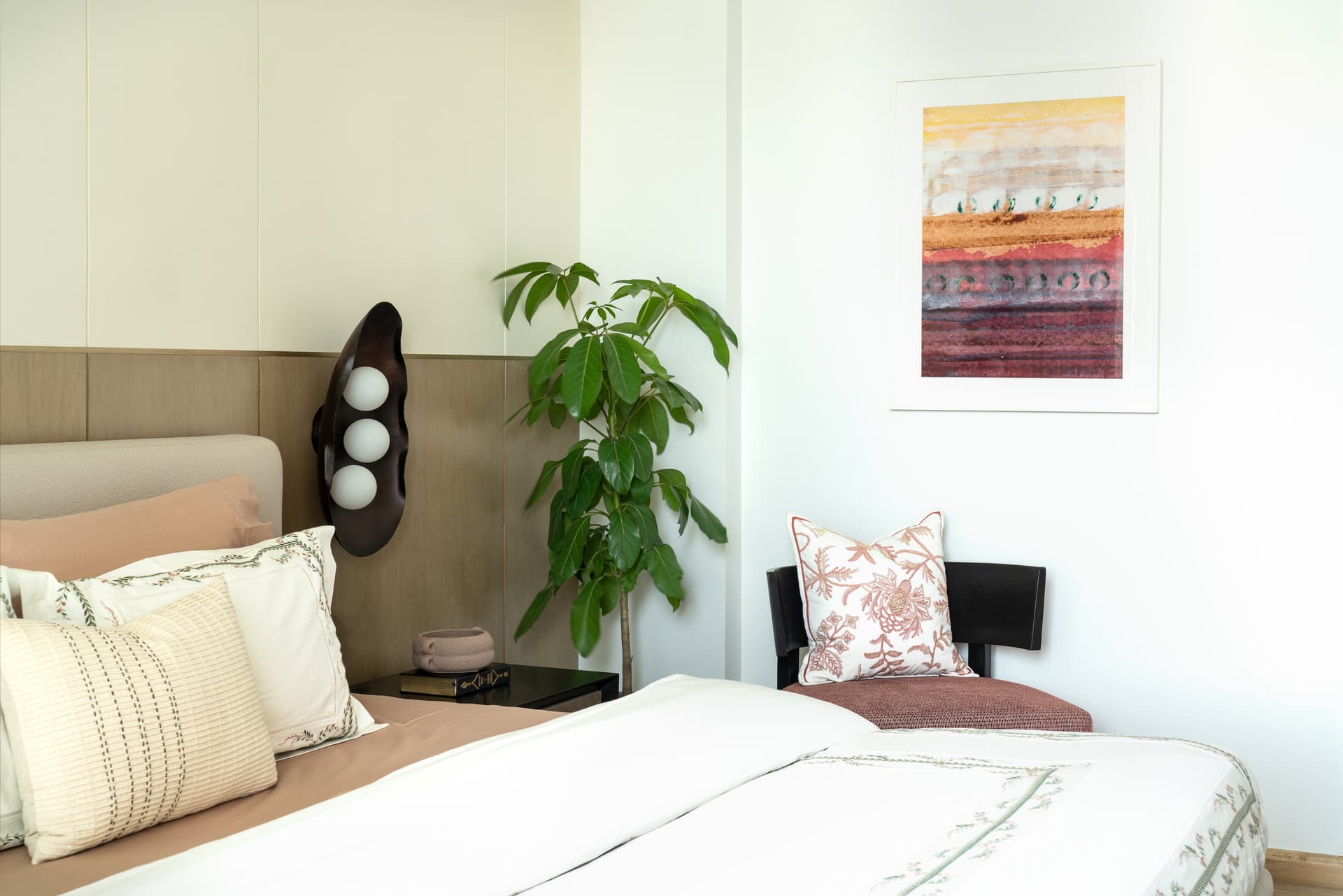 “The guiding inspiration for this abode was to create a tranquil ambience, expressed through various facets such as picturesque windows that enhance the interiors, the use of neutral hues infused with pops of colour to break visual monotony and bring cheer, and the incorporation of curved edges for an organic appeal. We also made minor structural changes to the home, experimented with a variety of materials and fabrics, blending them harmoniously while staying true to the space’s ethos,” says Priyanka Singh, Founder and Studio Head of Chalk Studio.