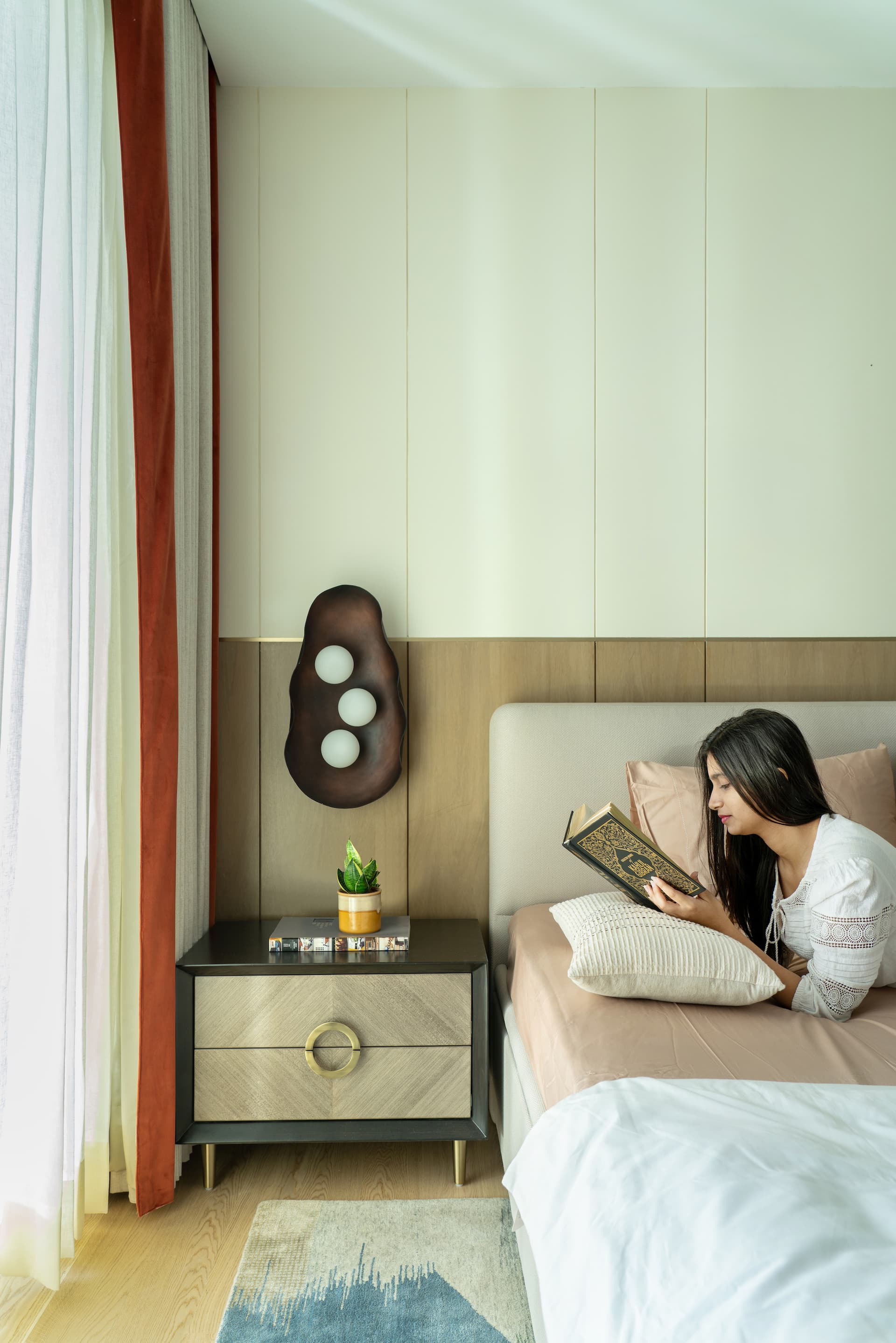 A graceful passage leads to the serene mother’s bedroom, where warm-toned veneer juxtaposes elegantly against beige wall finishes and antique gold metal accents. Wall light from Shailesh Rajput adds a layer of personality to the space. The en-suite bathroom exudes a monochromatic white ambience, enhanced by rich gold fittings that create visual interest.