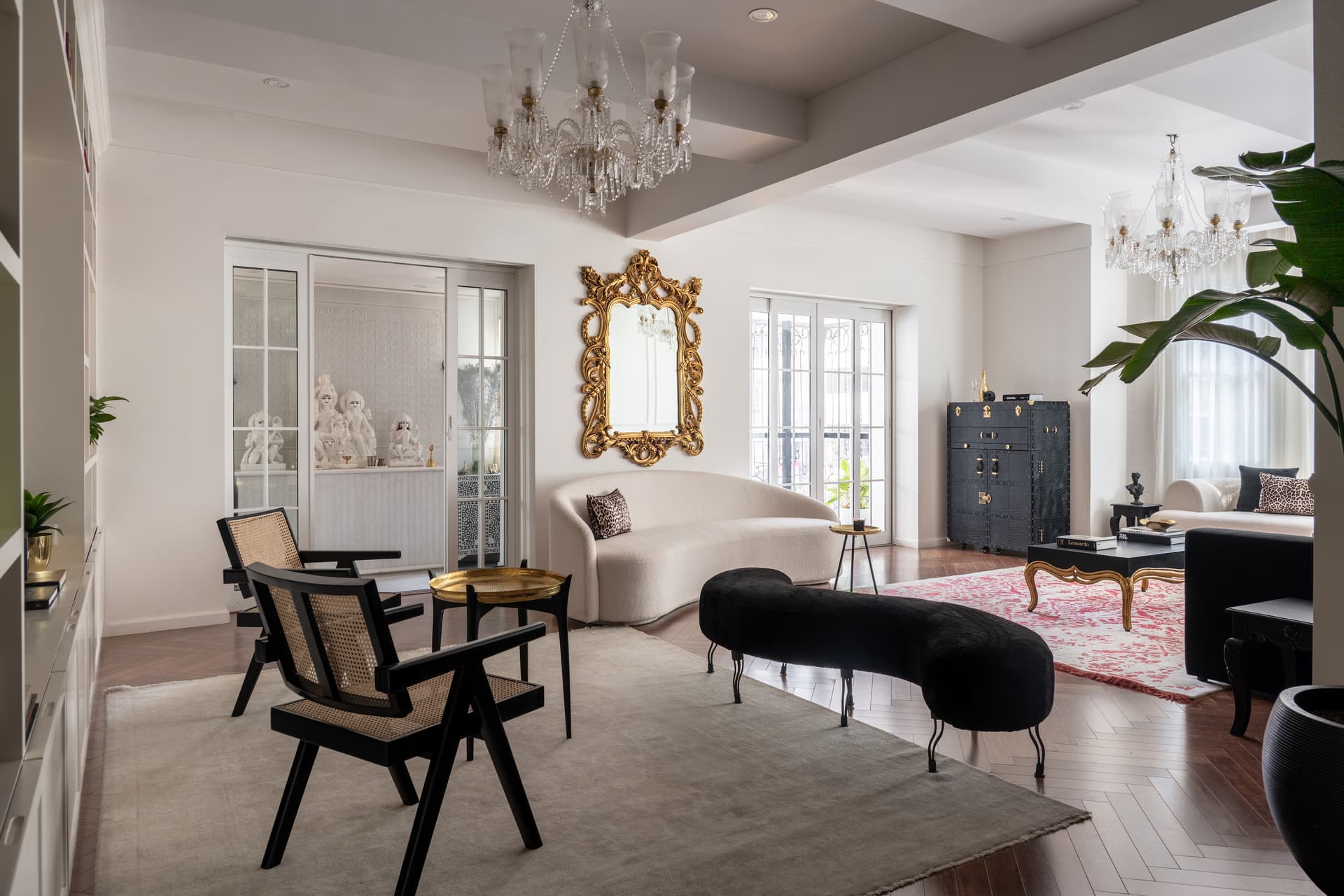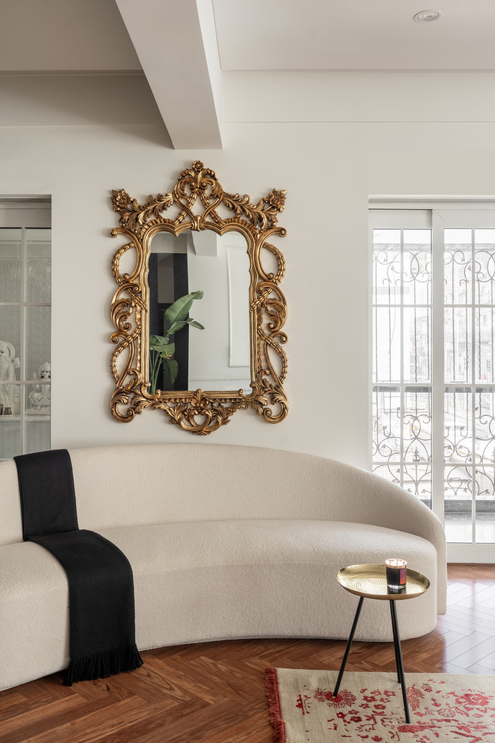 The space is flooded with natural light from French windows, which open into a serene mandir, formerly a balcony. This sacred corner, reimagined as a contemplative retreat, is rendered in traditional detailing and soft ambient lighting, radiating peace amid the city’s chaos.