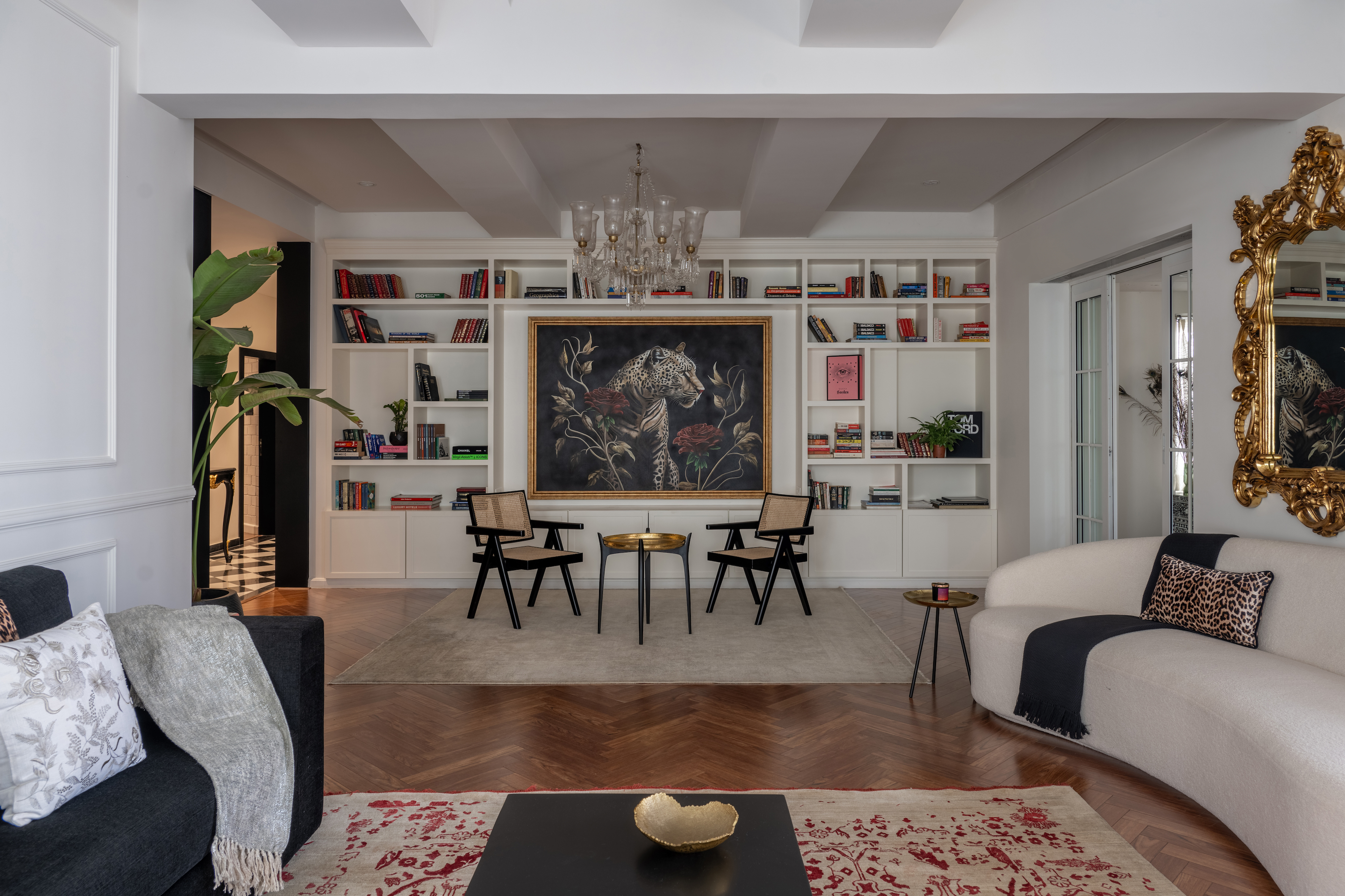 Step into the living room, and the narrative unfolds in layers of proportion, symmetry, and material finesse. Two exposed wooden beams align with the column grid, offering a visual and structural cohesion. A bespoke bookshelf becomes a central feature, dividing the room into two distinct seating zones—one by a bay window, anchored by a sleek bar; the other more intimate, designed for conversation and repose.
