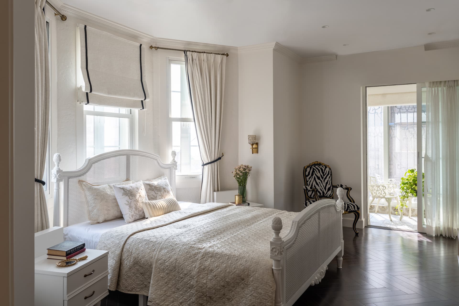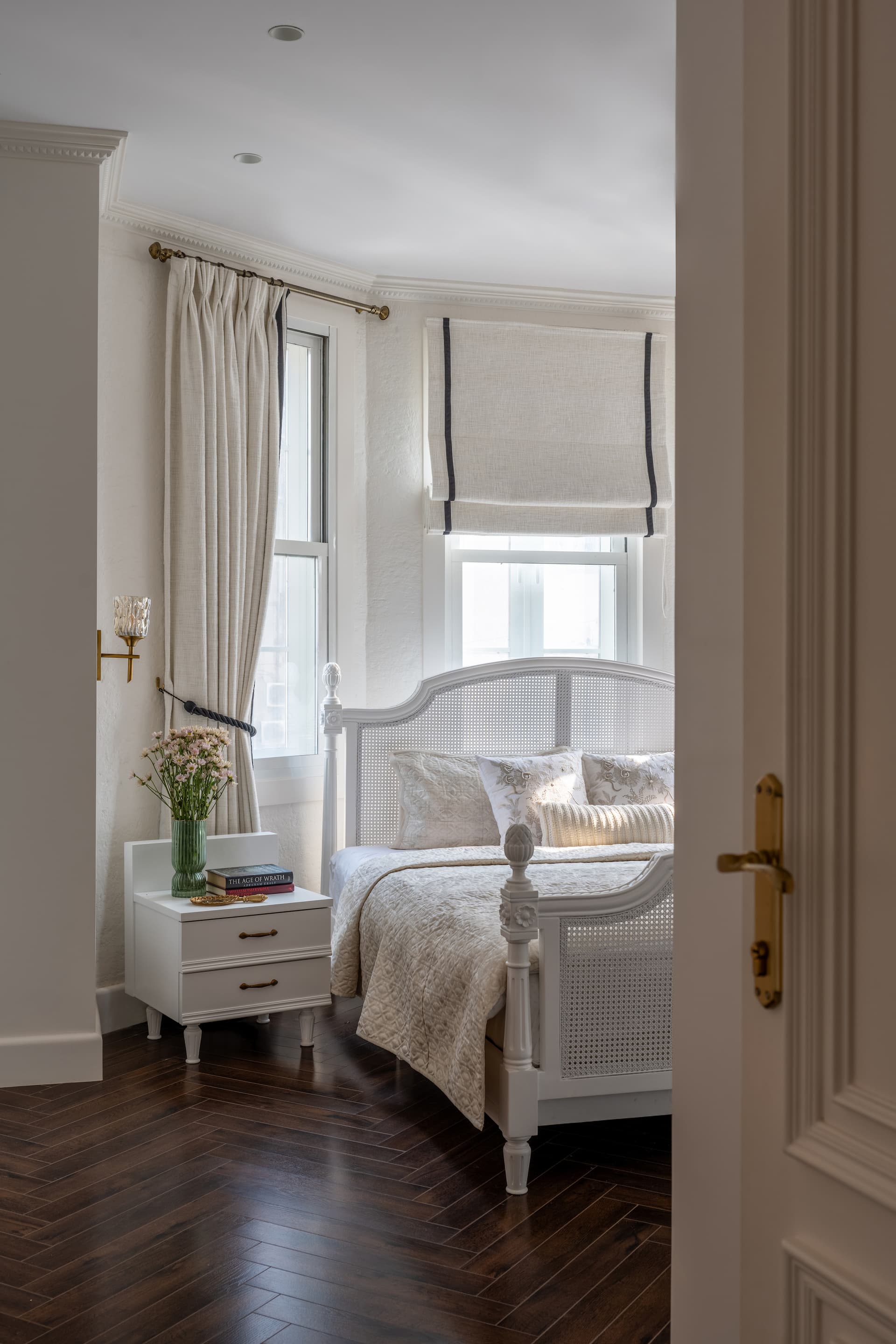 Beyond the public spaces, a passageway leads to the private quarters, where each room is tailored to reflect individuality within a cohesive design language. The master bedroom is imbued with a sense of calm, featuring walnut wood flooring, a symmetrical layout, and a bay window that captures the ever-changing sky. The adjacent balcony becomes an extension of the room—perfect for morning coffee or sunset musings.