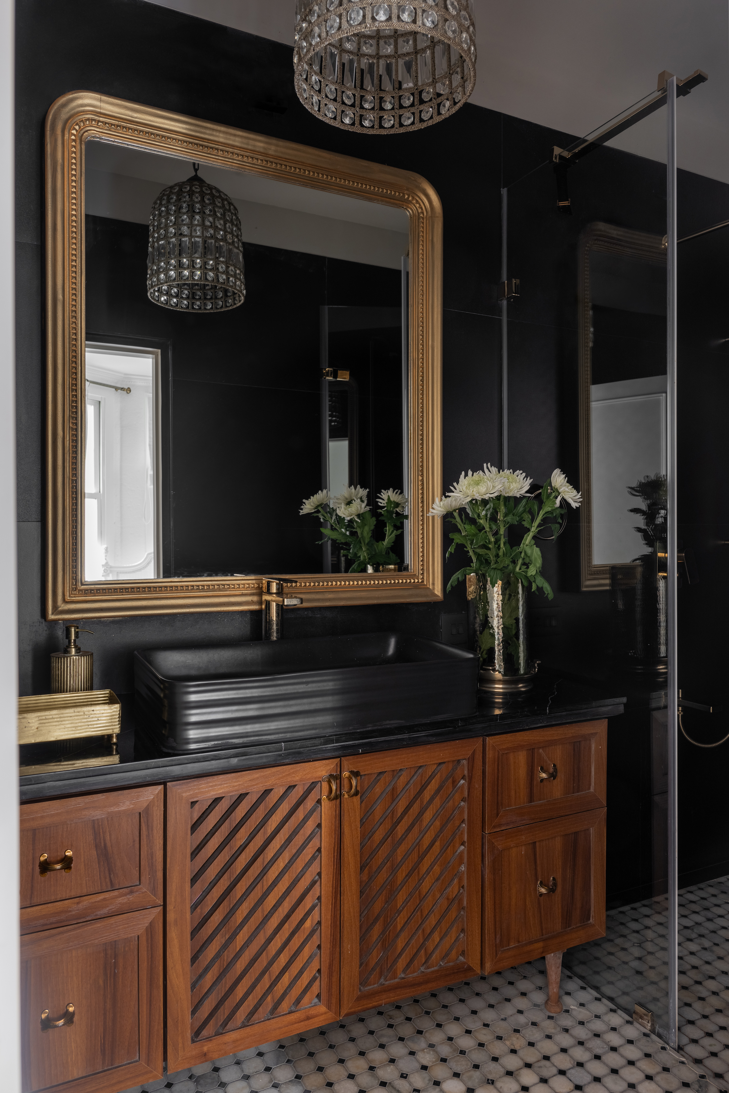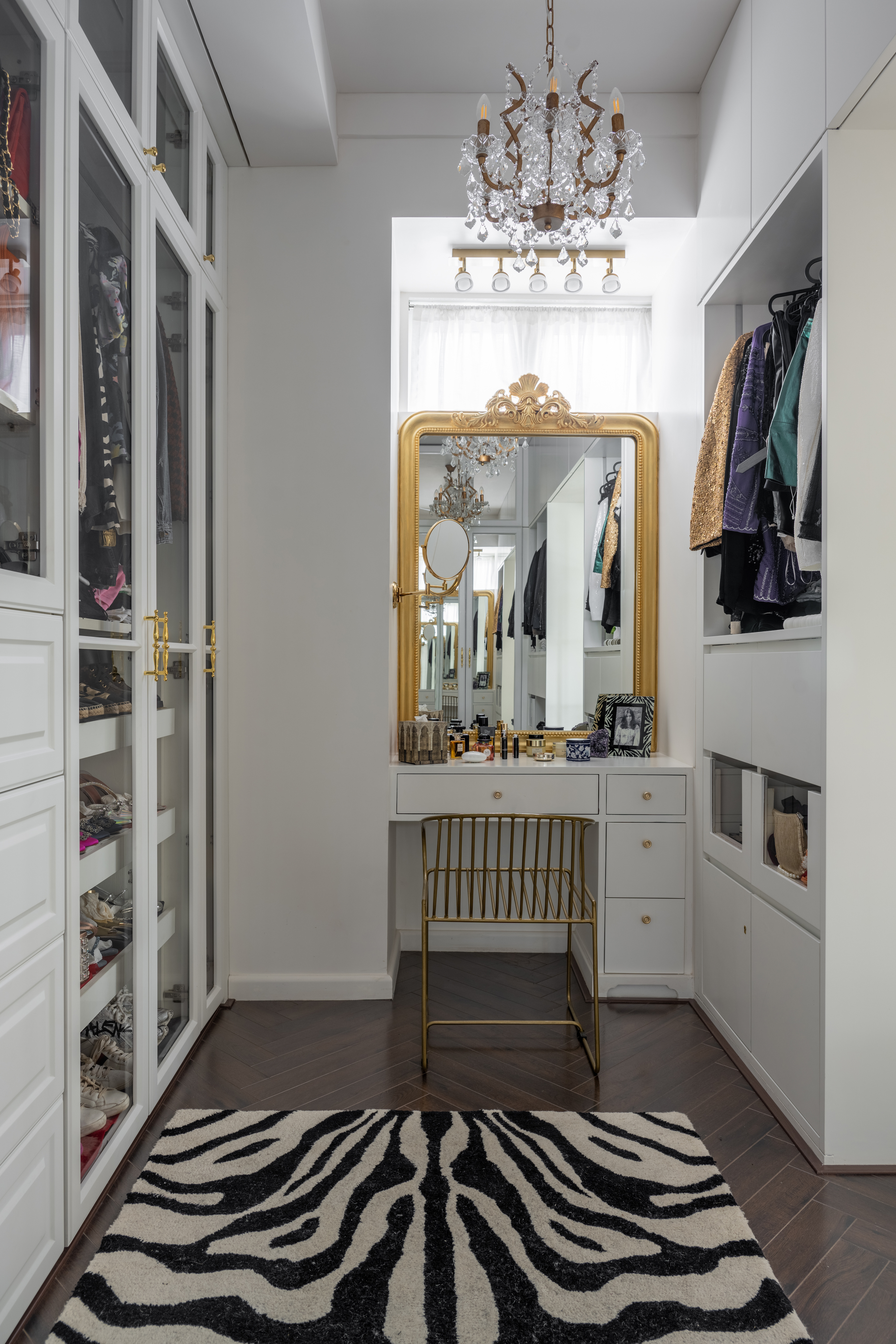 A standout feature is the walk-in wardrobe, nearly room-sized, clad entirely in white with a mix of glass-front shutters, panelled doors, and open shelving. An ornate sit-down dresser completes the boutique-inspired experience. The ensuite bathroom echoes the home’s signature palette, combining marble and tiles with a walnut-finished vanity, oversized washbasin, and a chandelier that adds a subtle, ambient glow—transforming the space into a luxurious, spa-like haven.