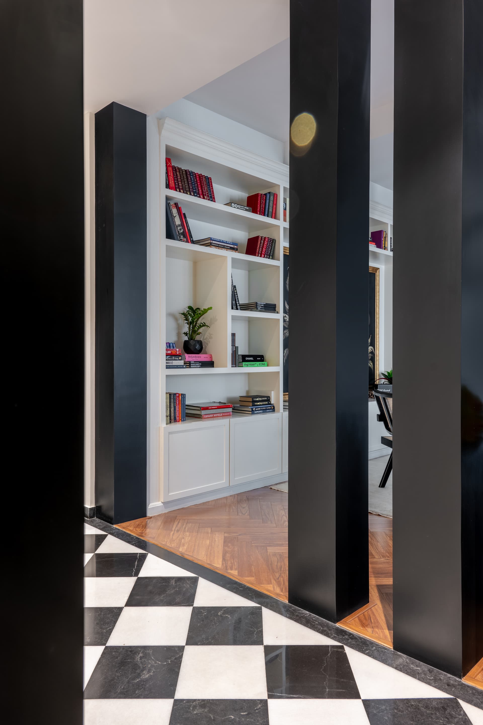 The entryway is dramatic yet restrained—announced by a bold green door that opens into a corridor laid with a chequered black-and-white marble floor, instantly evoking a sense of classical order. The passage is lined with sculptural elements and an ornate console, flanked by a large mirror and another sculpture on the left, creating a visual dialogue between form and reflection. Four black columns frame the corridor in a quiet architectural rhythm, forming an arcade that serves both as a privacy screen and a structural anchor, teasing glimpses of the spaces beyond.
