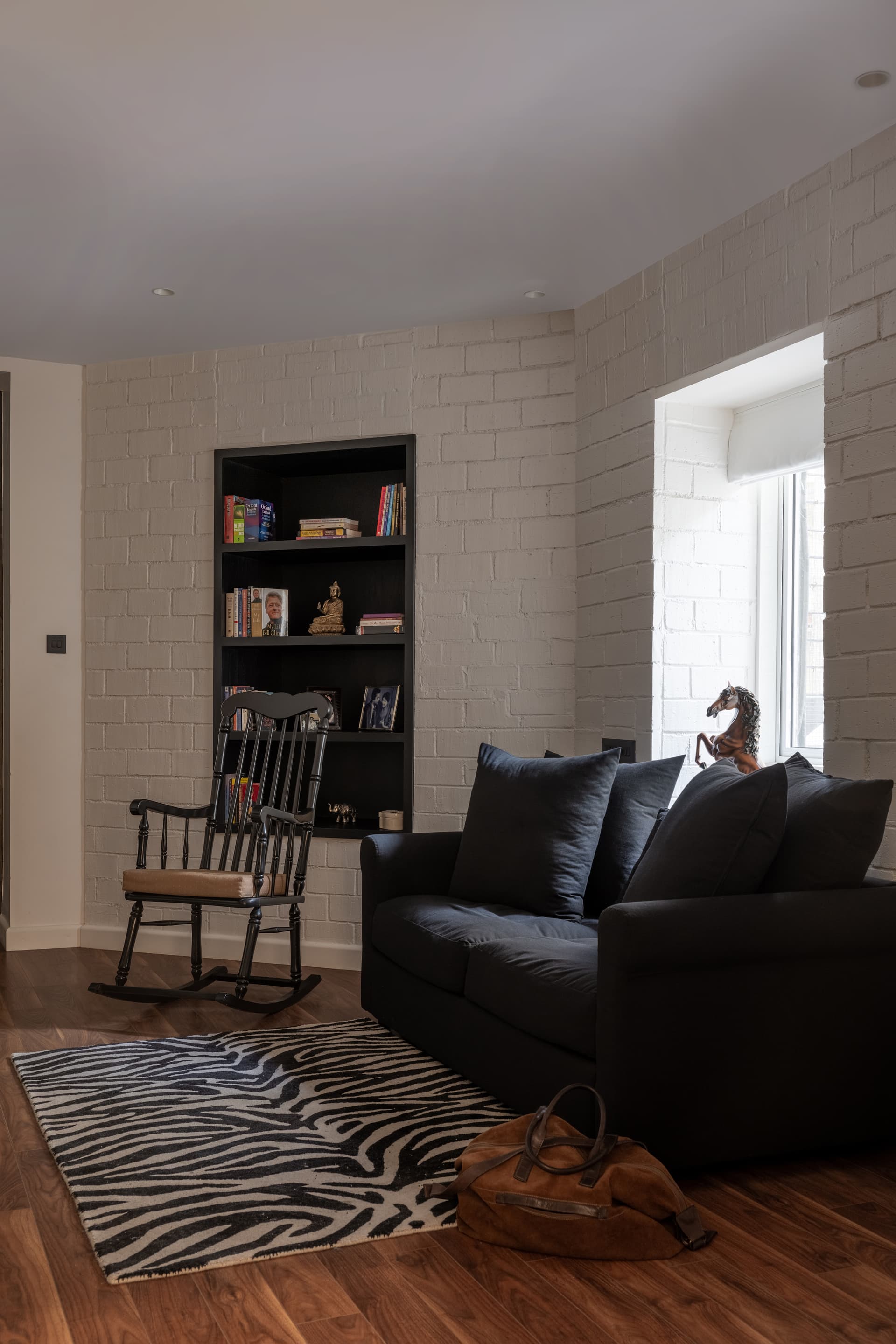The den, doubling as a guest bedroom or personal study, celebrates the building’s heritage with a white exposed brick wall, its original niche repurposed into a charming bookshelf. Furnished with a large study desk, midnight blue couch, rocking chair, and a black TV unit, the room is as stylish as it is utilitarian—ideal for work, reading, or leisurely downtime.