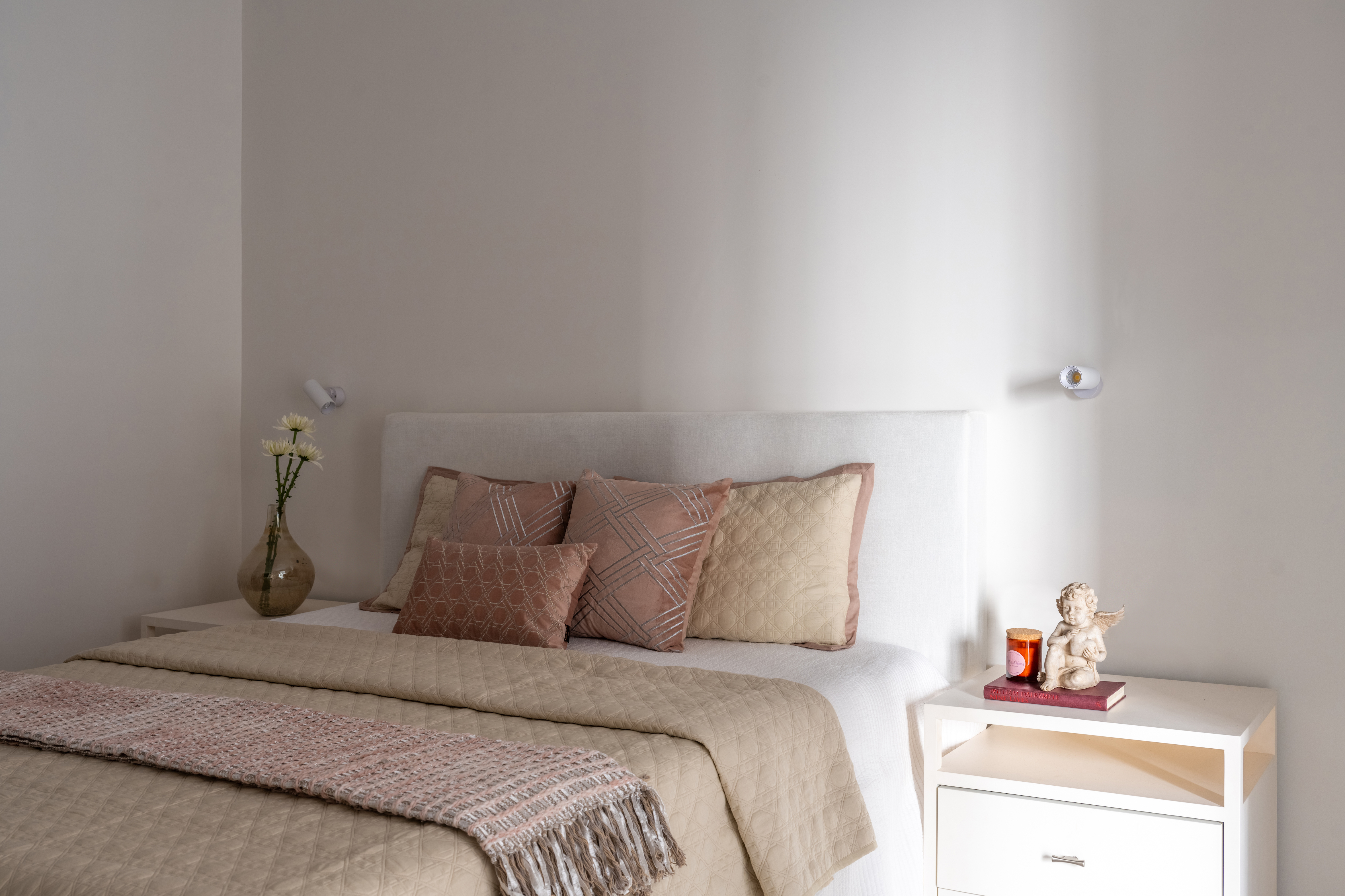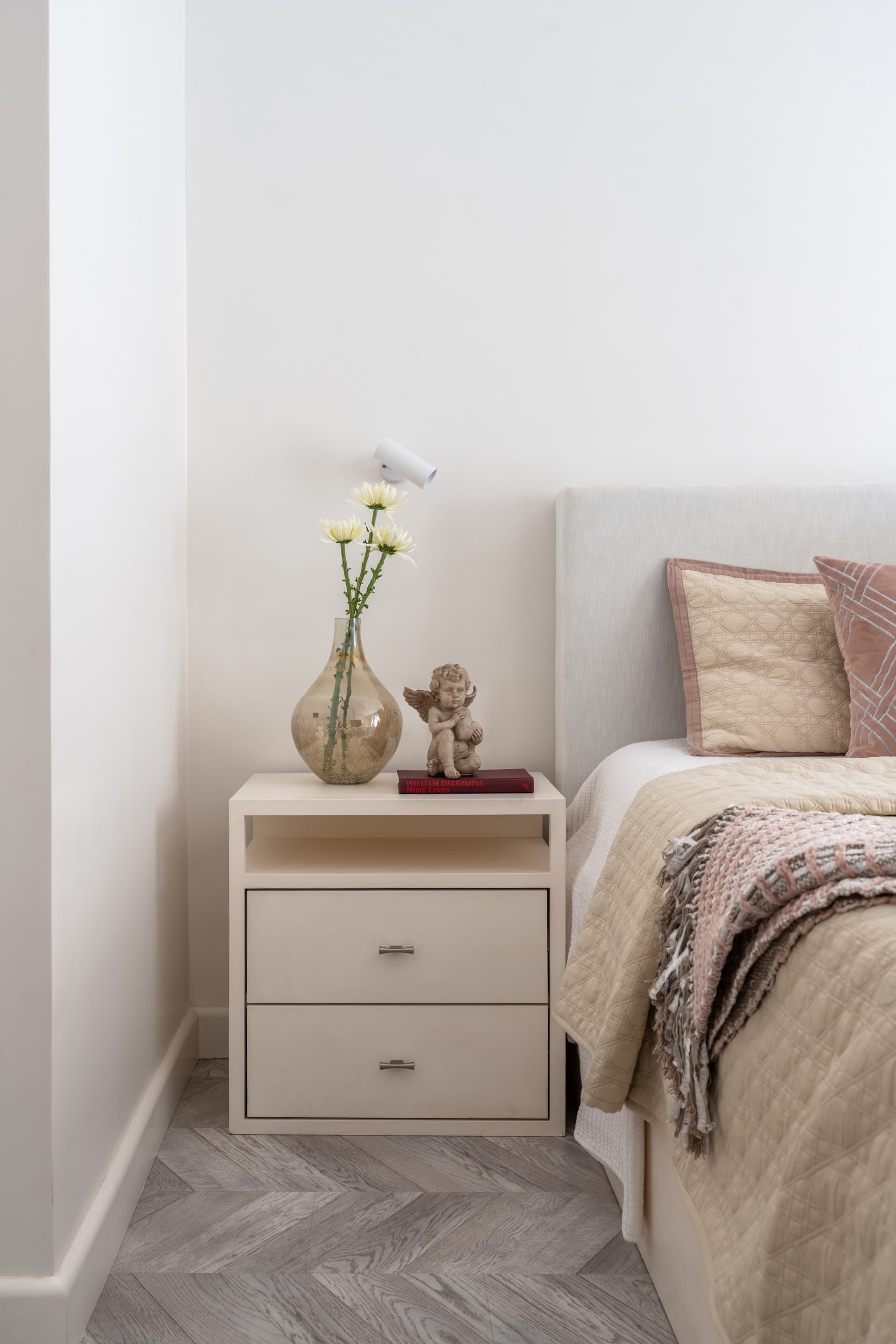 The secondary bedroom takes on a softer, more restrained aesthetic. A muted fabric headboard, clean-lined Duco-finished side tables, and bare walls lend the room a sense of minimalism, while the bathroom—rendered entirely in a single grey tile—feels quietly sophisticated and expansive in its tonal simplicity.