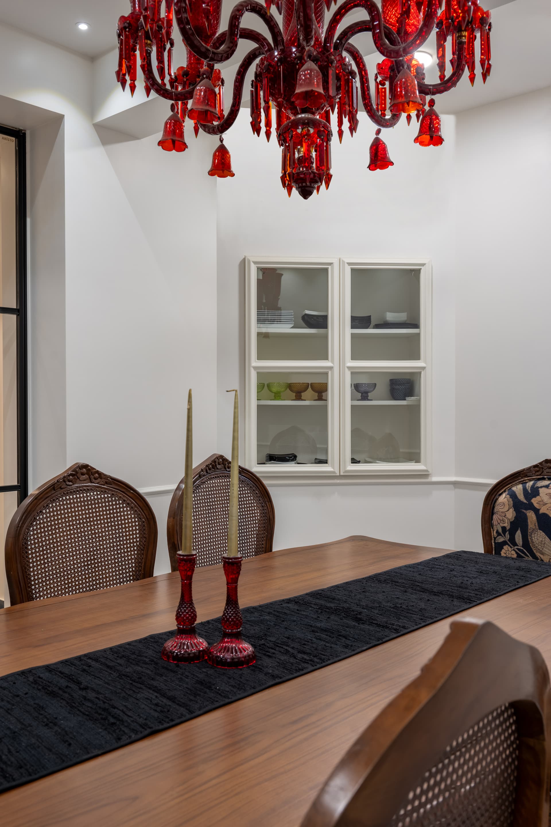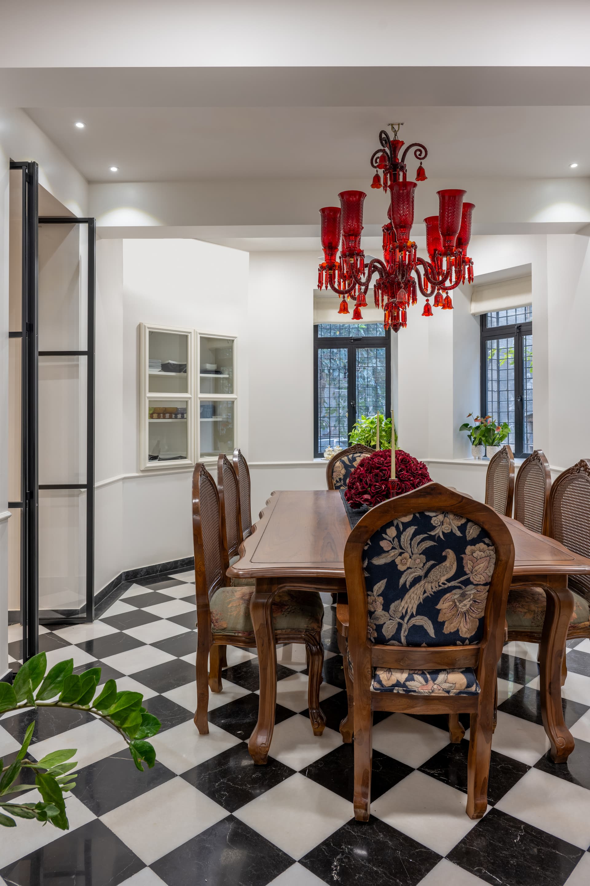 Adjoining the living area is a dining room that continues the monochrome marble flooring, juxtaposed with a robust teak wood dining table and printed fabric chairs. Suspended above is a bold red chandelier—a singular, sculptural element that commands attention and adds a layer of theatricality. The dining area speaks to a mood of easy luxury, where form follows function without compromising flair.