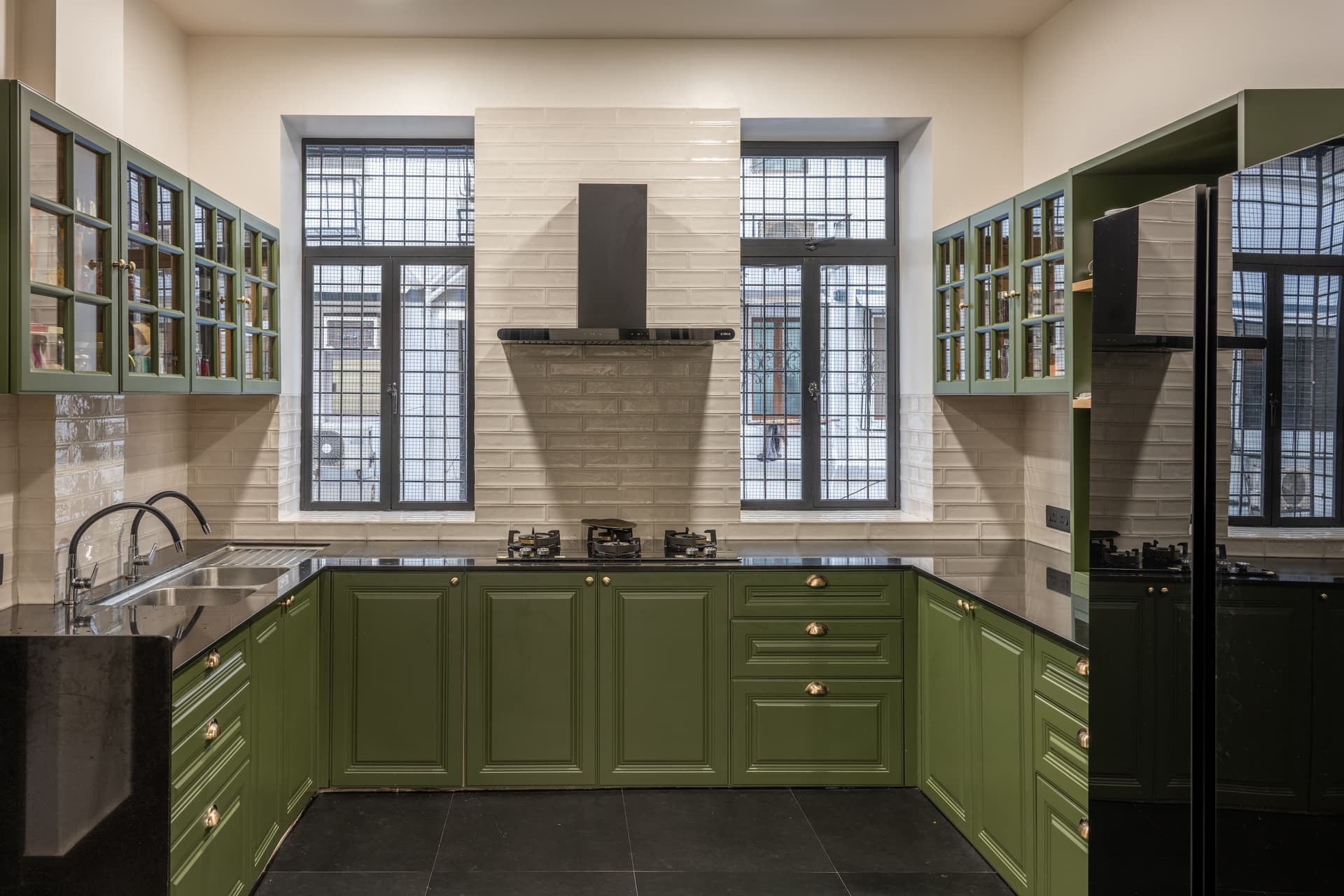 The nearby kitchen is a study in contemporary classicism, defined by olive green and warm brown PU panel finishes, a jet-black granite countertop, and subway tiles that add texture and depth. The design prioritises both beauty and practicality, with high-end appliances and an ergonomic layout seamlessly integrated into the cabinetry.