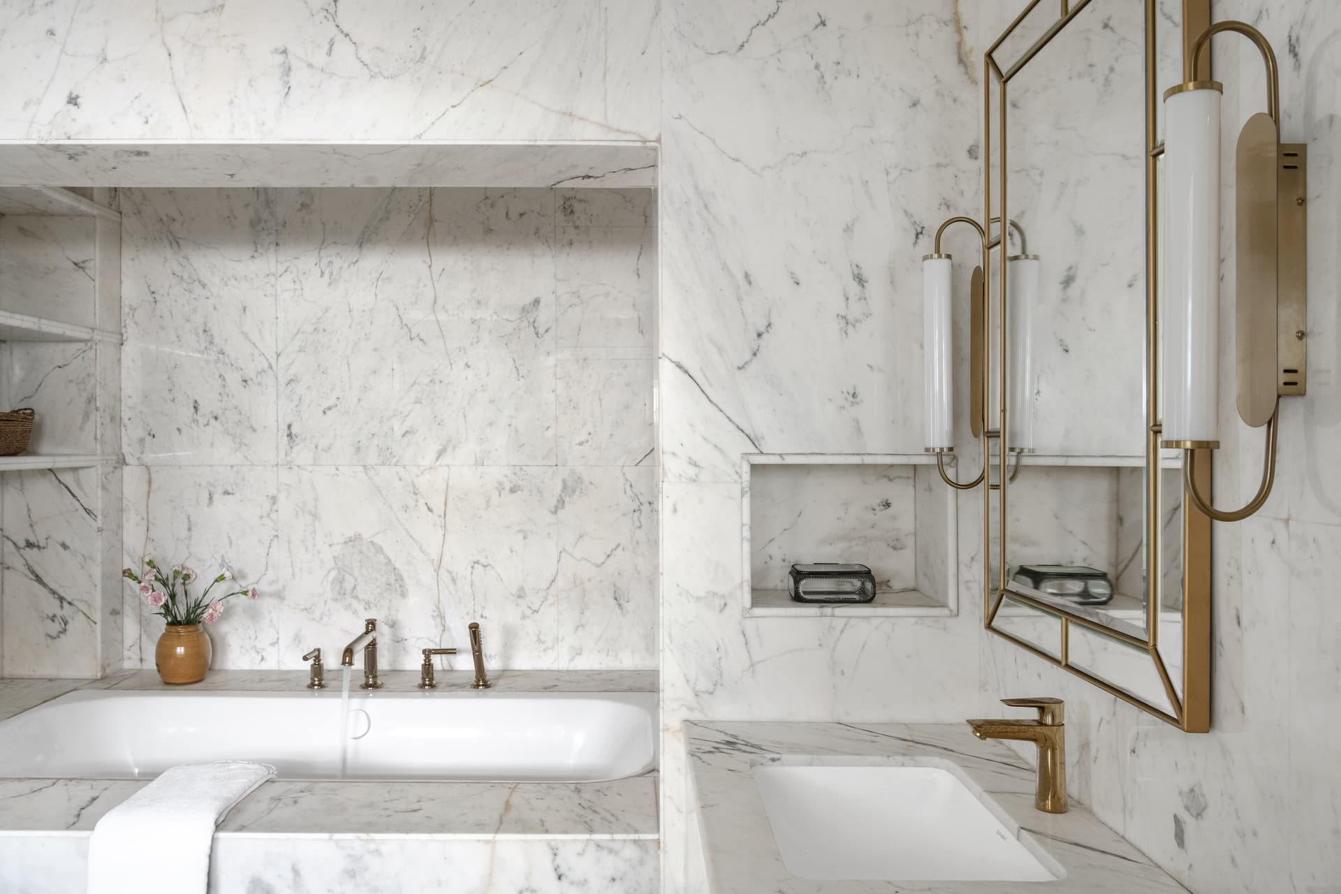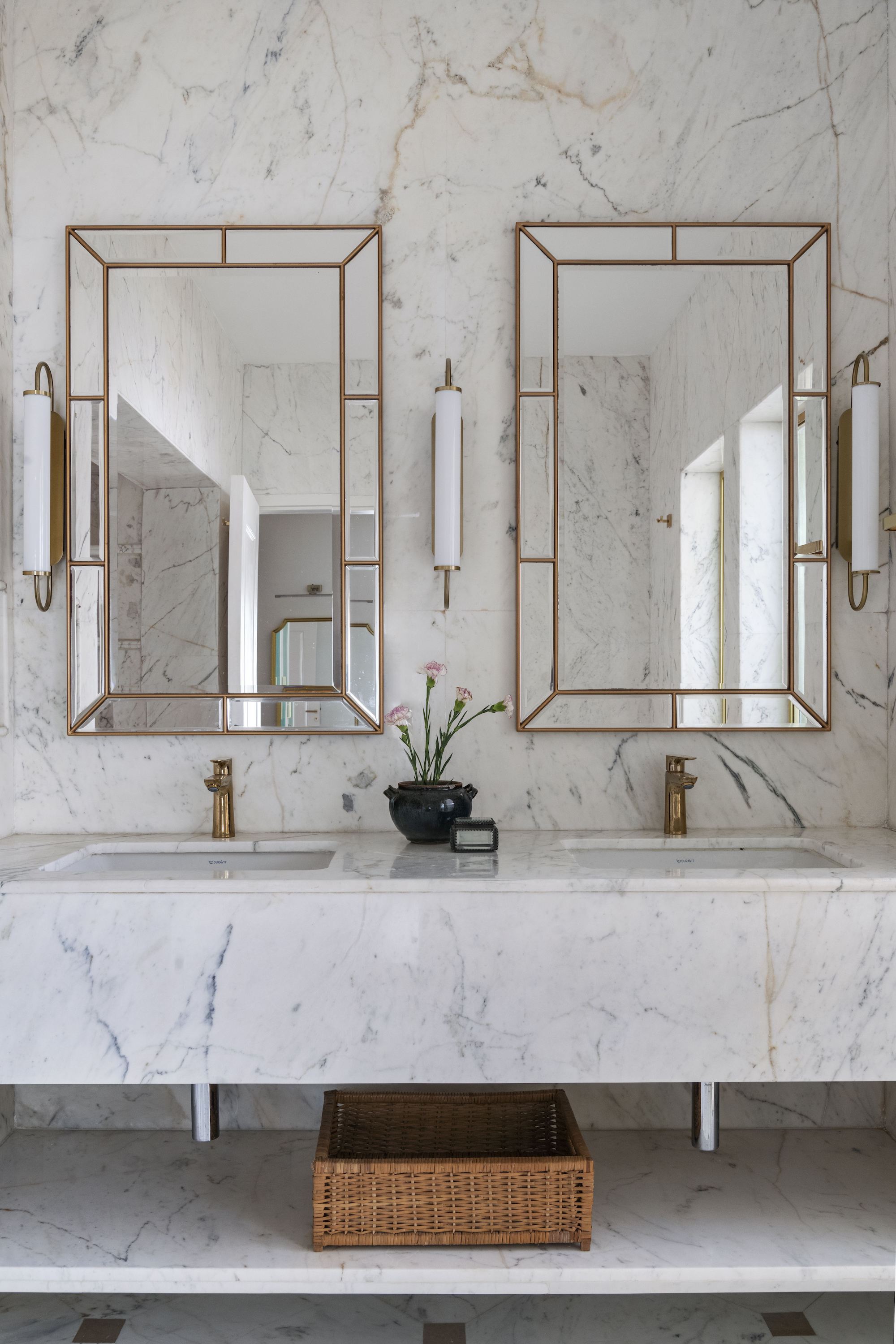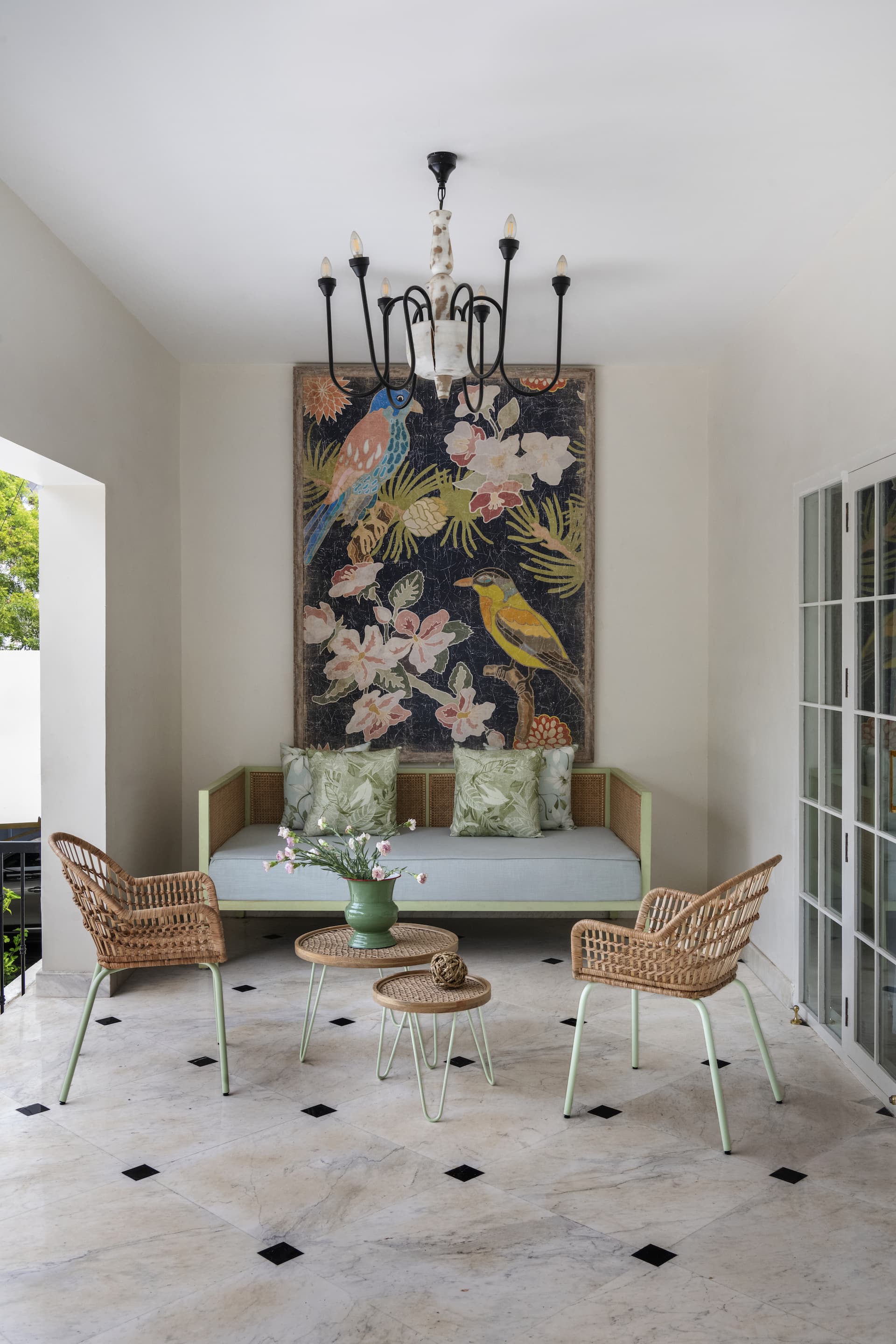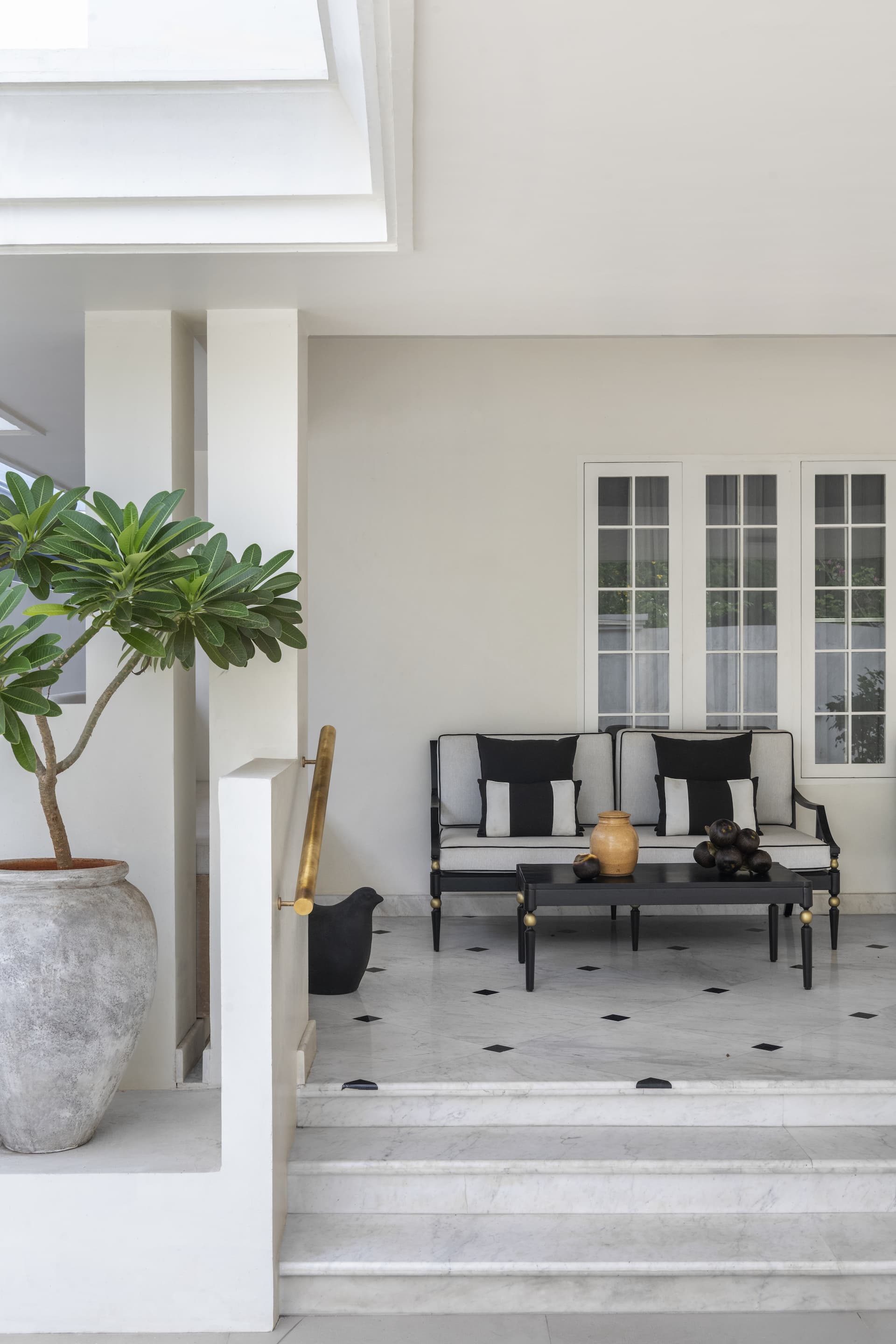Upon arrival, the villa greets guests with a bright, white façade, serving as a canvas for vibrant Bougainvillea blooms that set a tone of understated sophistication. The entrance patio, with its black and white chequered marble flooring, echoes a classic charm, further enhanced by a brass handrail that guides visitors into the heart of the home. This striking pattern extends into the passageway, creating a seamless transition from the exterior to the interior, where it leads to a French-inspired carved mirror—a focal point that introduces the home’s theme of timeless elegance.