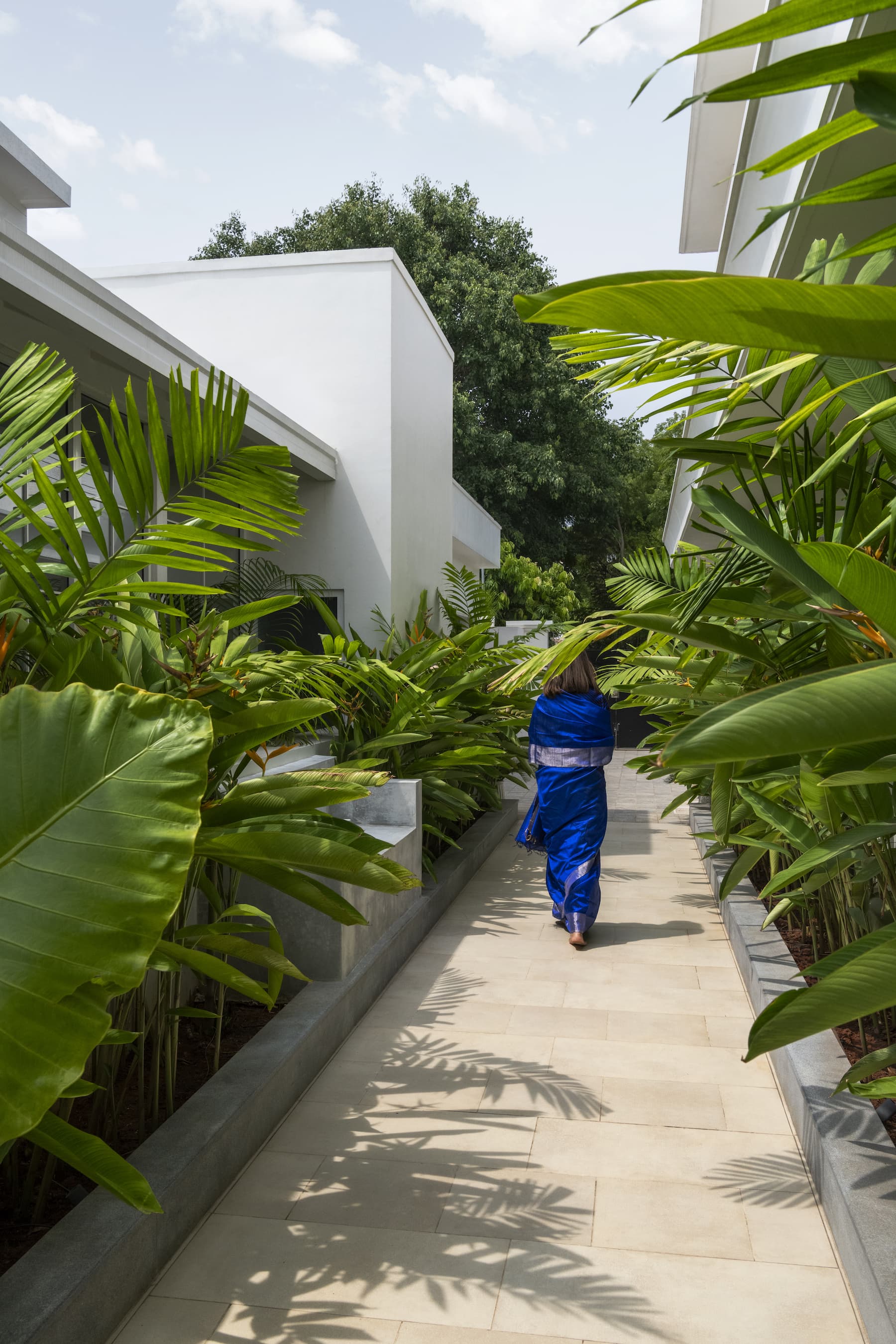 Perhaps the most enchanting feature of this home is the glass house, a space that captures the essence of summer with its vibrant hues and artful details. The passage leading to the glass house is enveloped by greenery, creating a sense of anticipation. Upon entering, one is greeted by a fusion of art and storytelling, with printed tiles and a custom hand-painted mural narrating tales of whimsy. A colonial-style bookshelf and cozy wooden flooring on one side contrast with the printed tiles that open out to a serene water body on the other. The glass house is a magical retreat, encapsulating the playful yet sophisticated spirit that defines this home.