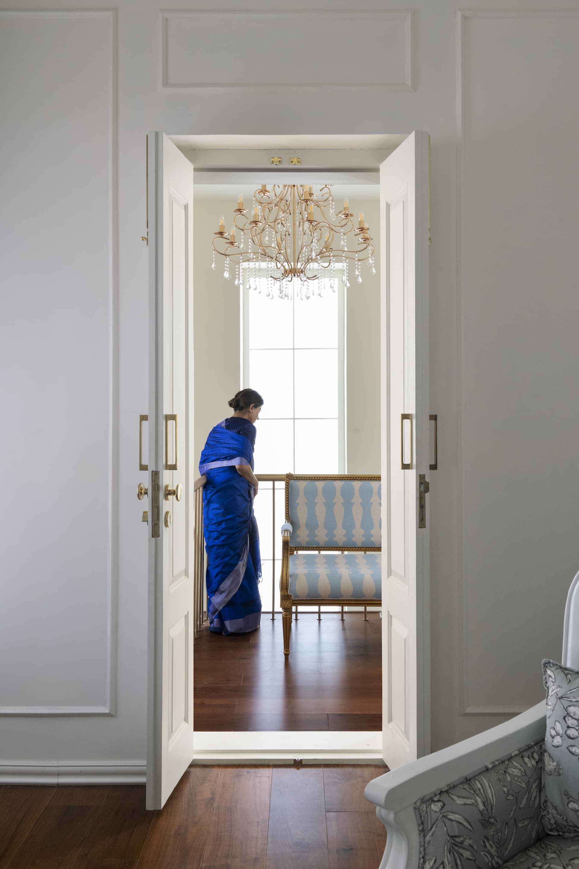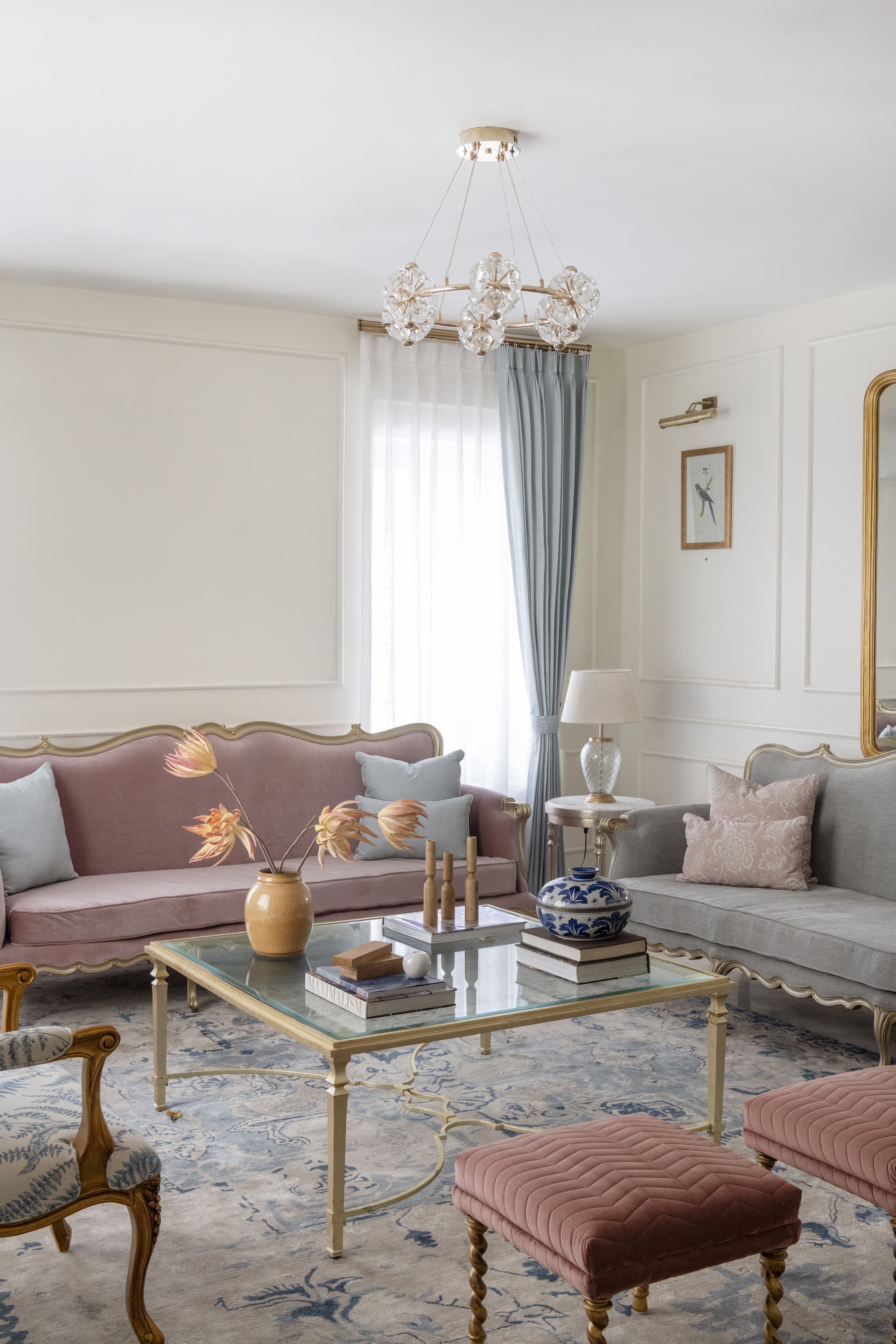 The journey continues into the living room, where an artful mix of pastel-coloured furnishings and floral prints softens the space, evoking a sense of comfort and serenity. Custom-made French-style doors and windows, adorned with wainscoting details, frame the room, allowing natural light to cascade into the space and accentuate the elegant décor.