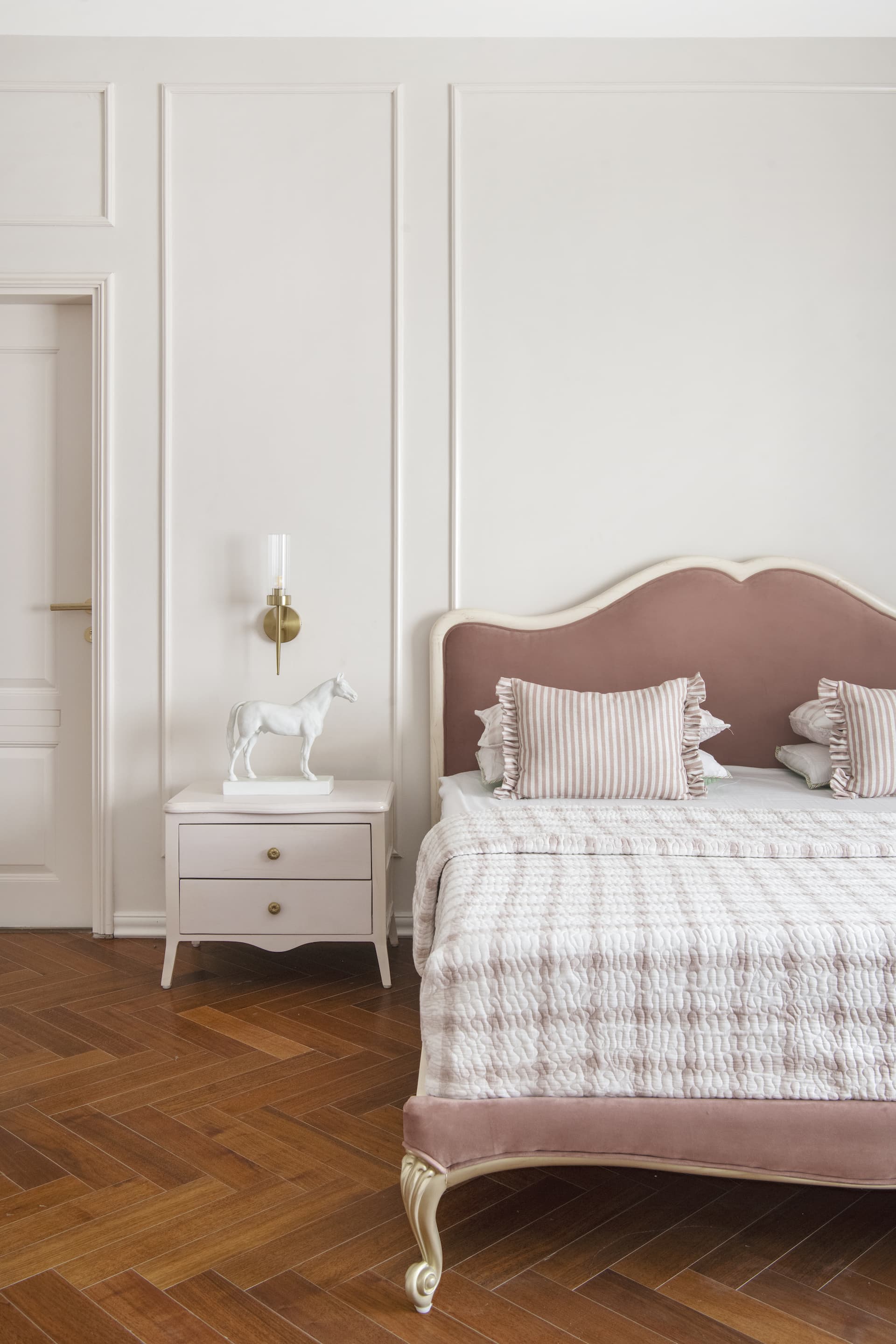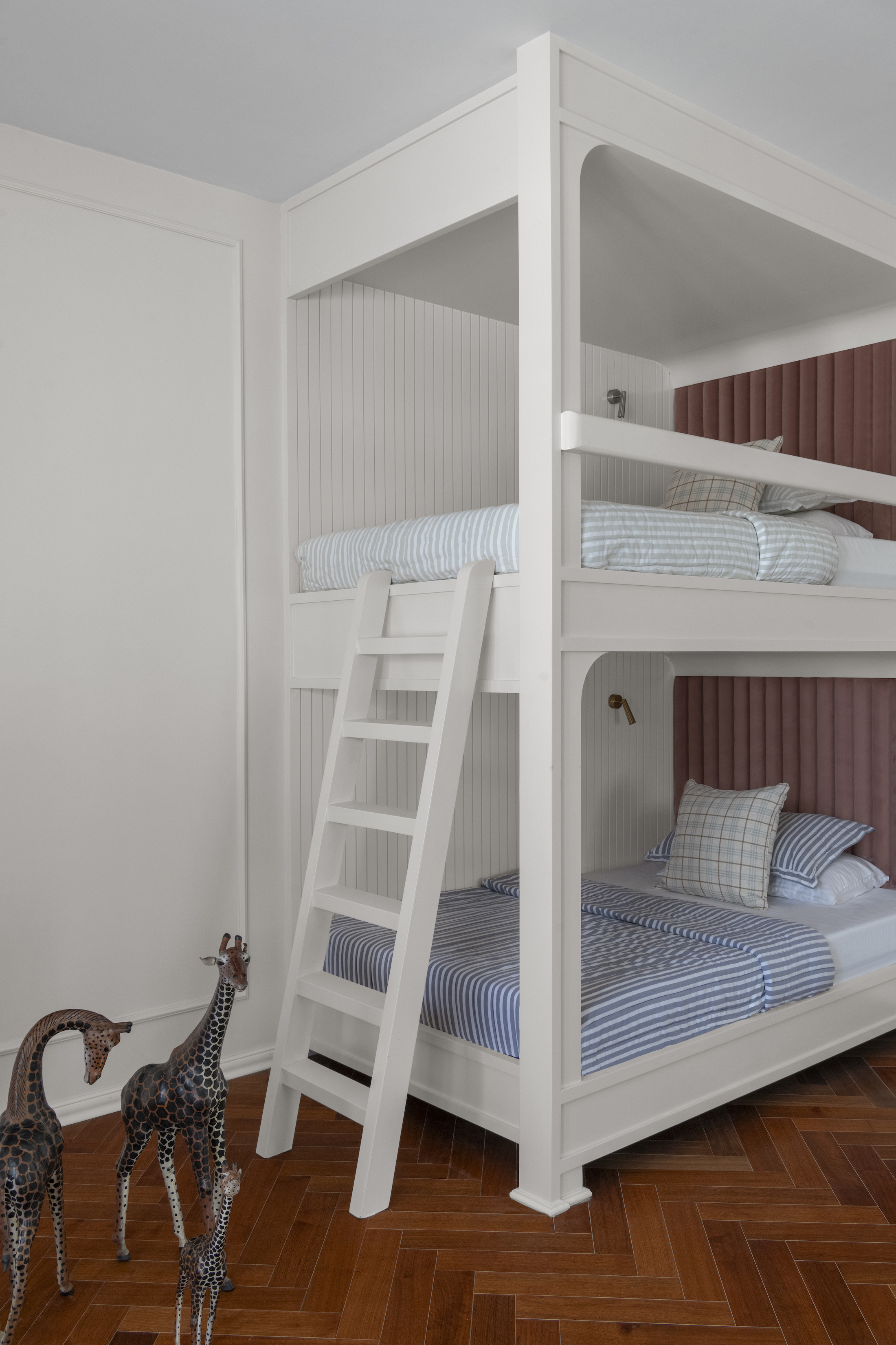 The children’s bedroom, shared by three girls including a pair of twins, is a whimsical space filled with pastel hues, wainscoting paneling, and intricately carved beds. The room features a combination of a bunk bed and an English colonial-style queen bed, with bedding and upholstery in a mix of cotton and suede that adds warmth and softness.