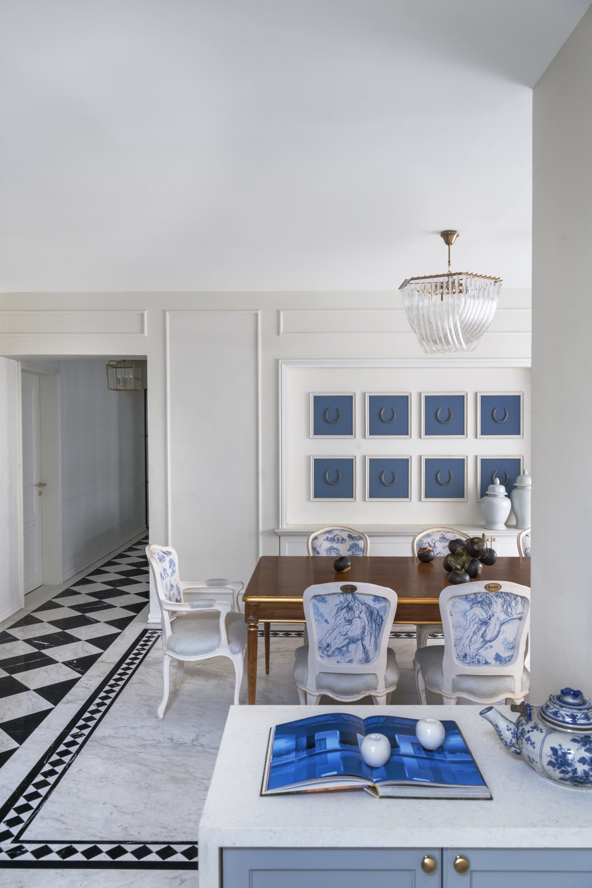 Transitioning from the living area to the dining room, one encounters a space that is deeply personal and distinctive. The client’s love for horse riding is thoughtfully woven into the design, with dining chairs named after their horses and worn-out horseshoes framed as wall décor. This equestrian-inspired motif adds character and emotional depth to the space, creating a dining experience that is both intimate and reflective of the family’s passions.